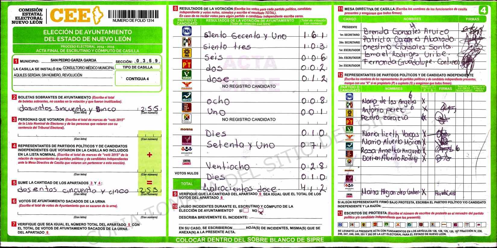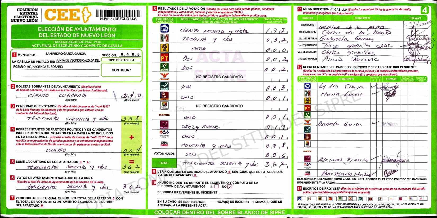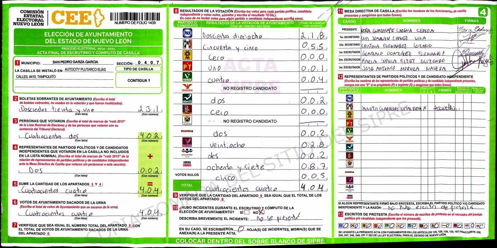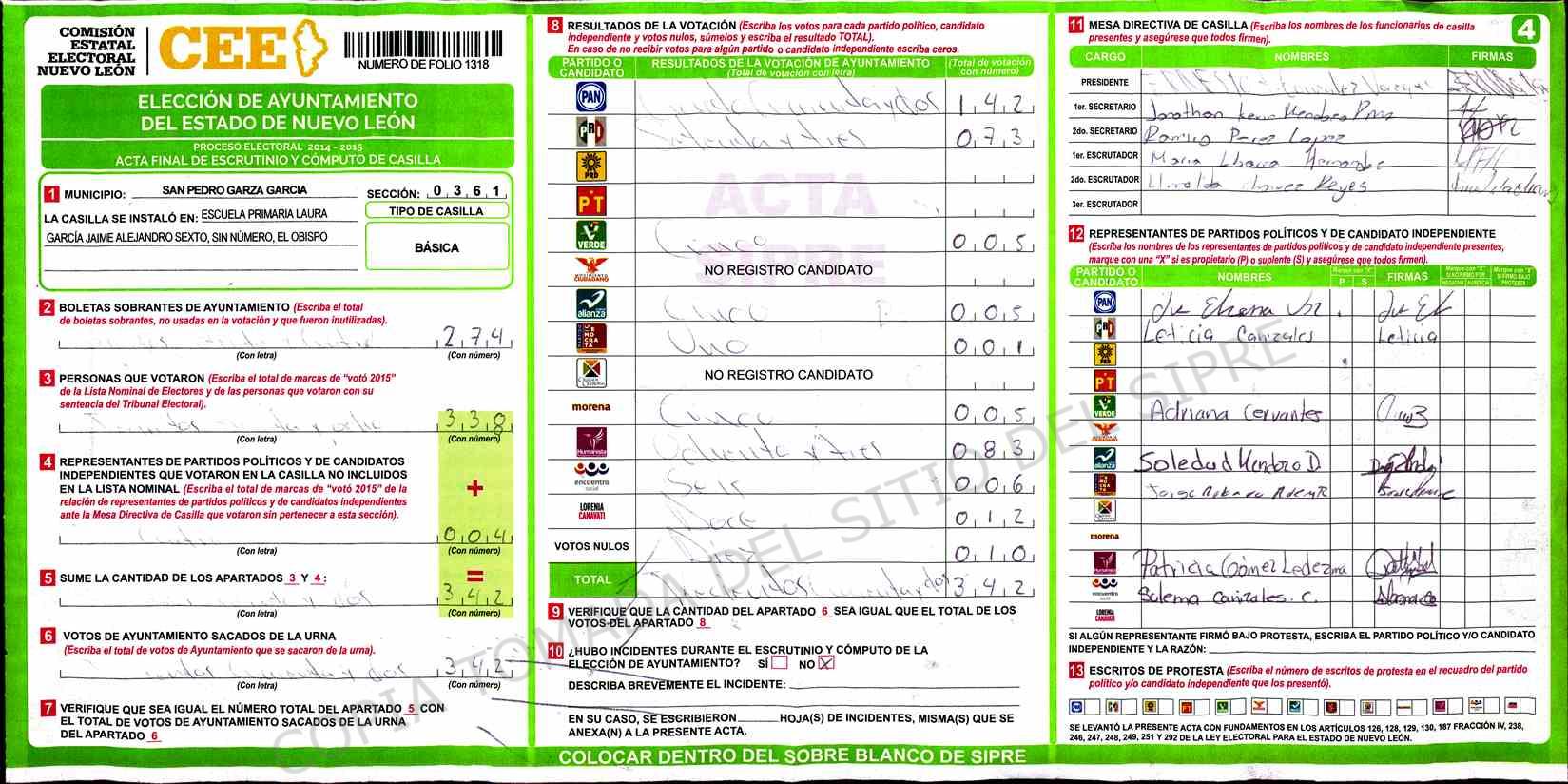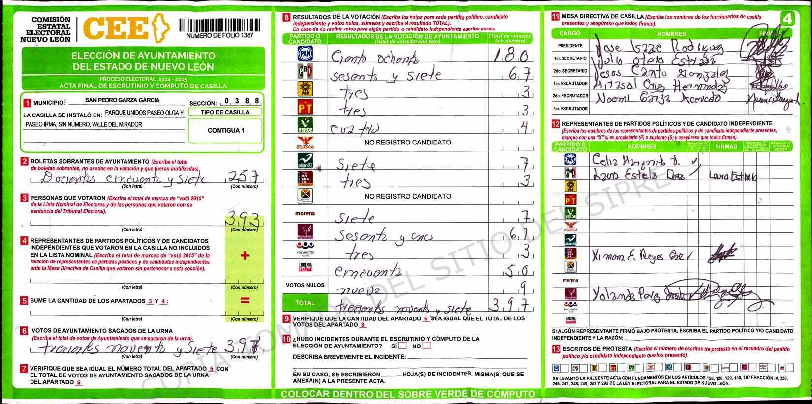 | Claves de Incidencia: | (1) Ilegible, (2) Mutilada, (3) Presenta Correcciones, (4) Presenta Borrones, (5) En Blanco, (6) Cifras Remarcadas, (7) Cifras de Mas, (8) Copiado Movido, (9) Con Signos Inválidos, (10) Excede Lista Nominal, (11) Otra |