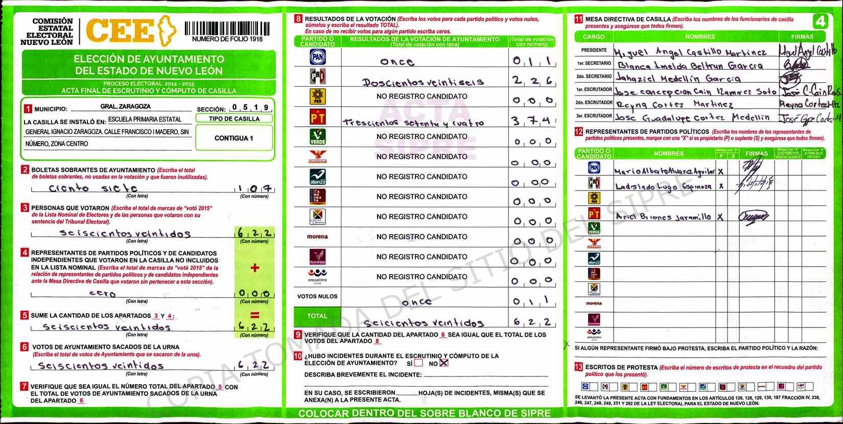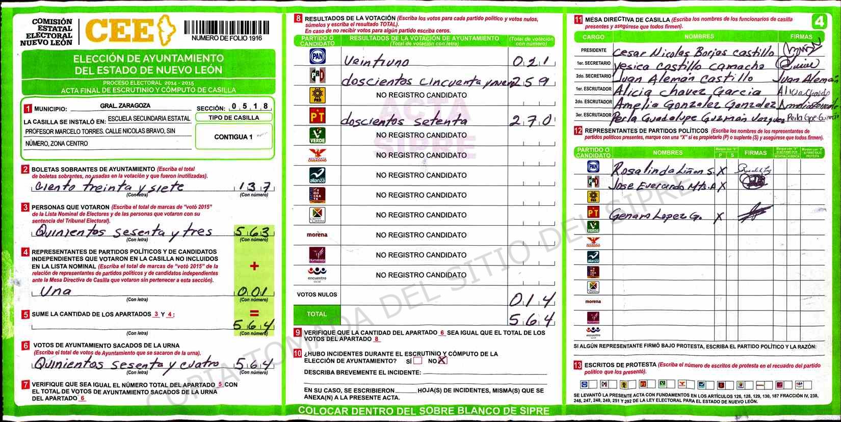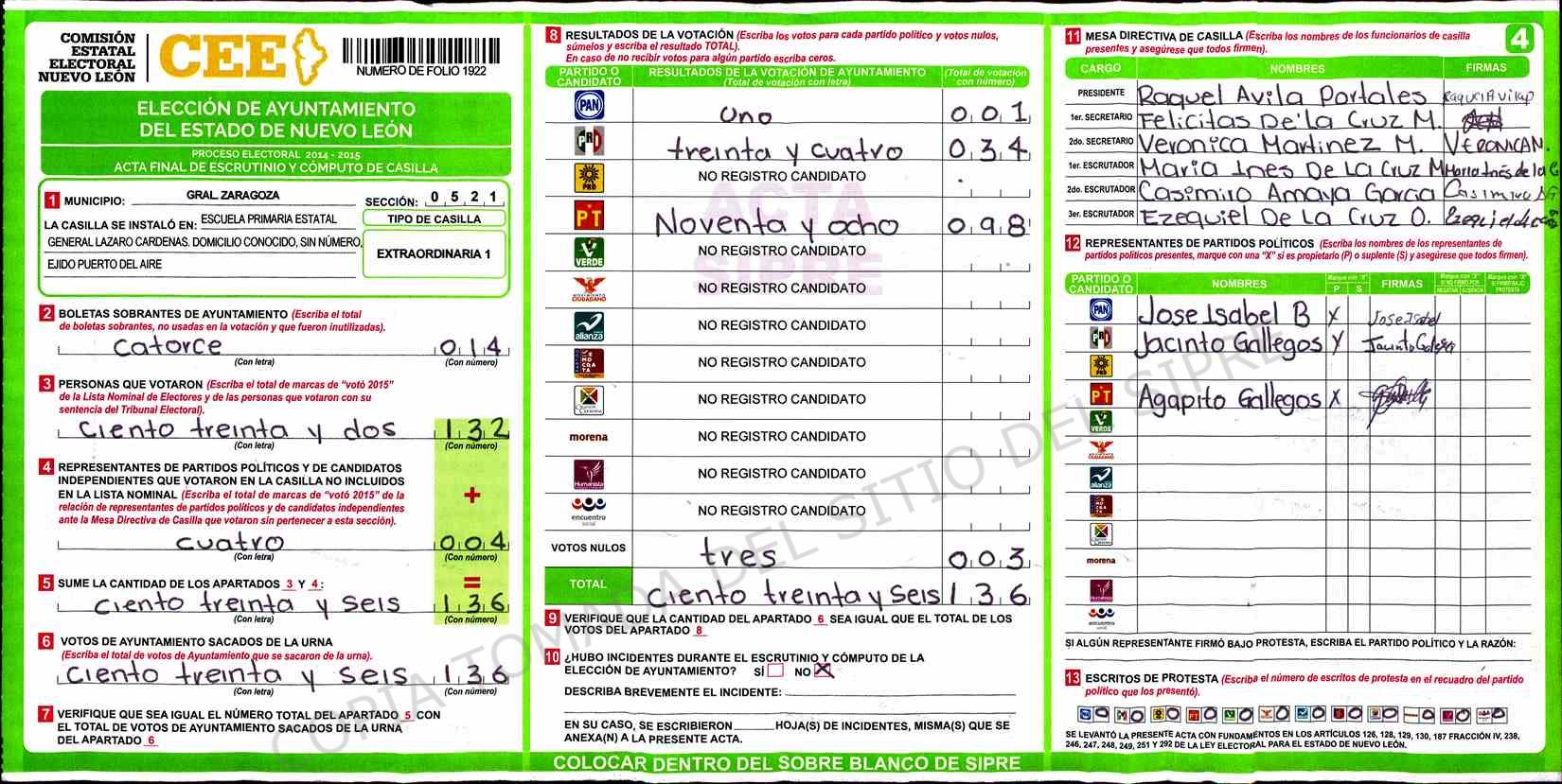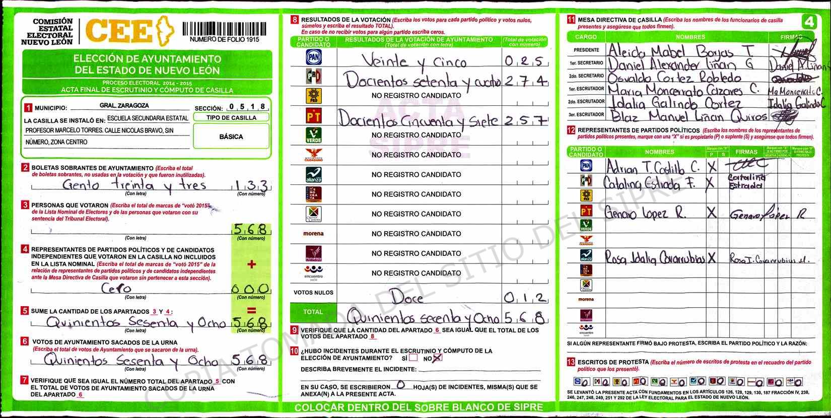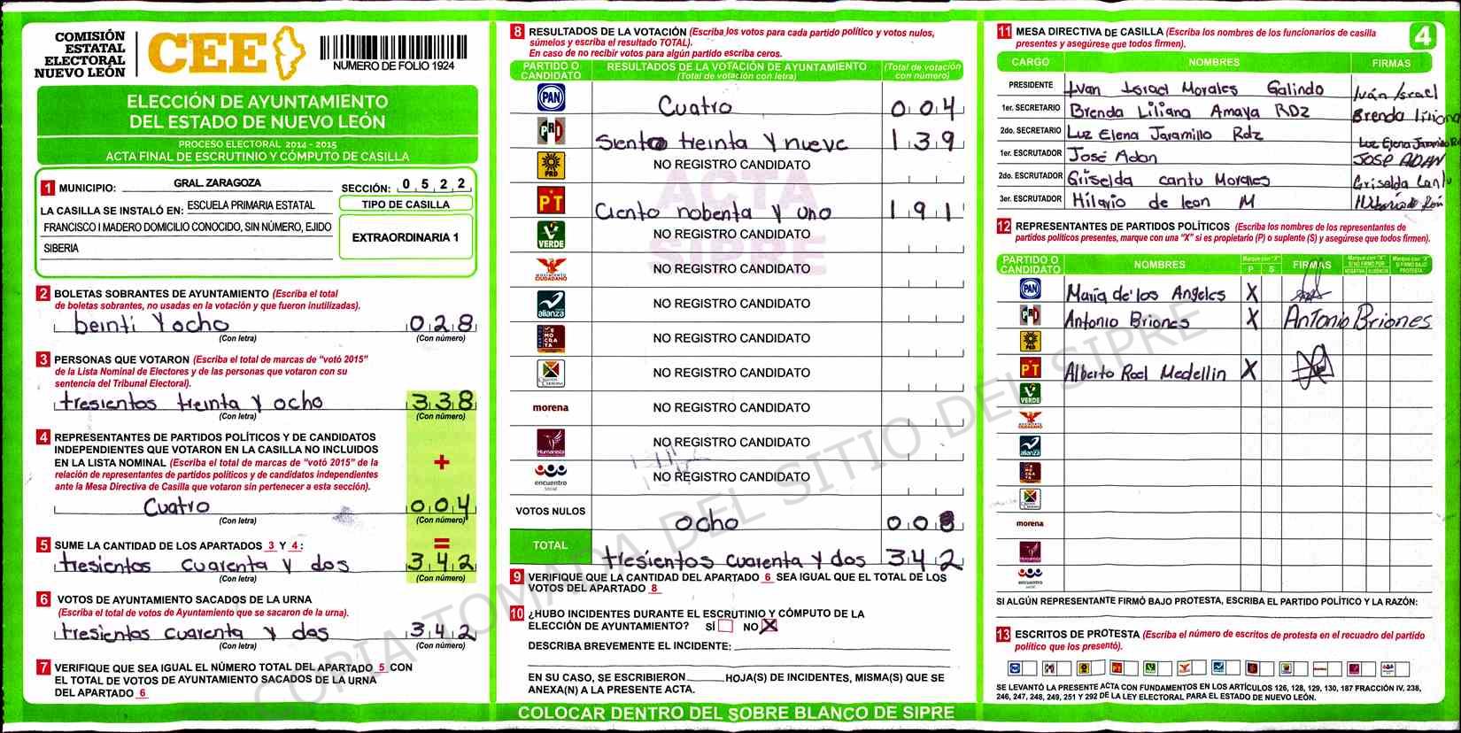 | Claves de Incidencia: | (1) Ilegible, (2) Mutilada, (3) Presenta Correcciones, (4) Presenta Borrones, (5) En Blanco, (6) Cifras Remarcadas, (7) Cifras de Mas, (8) Copiado Movido, (9) Con Signos Inválidos, (10) Excede Lista Nominal, (11) Otra |