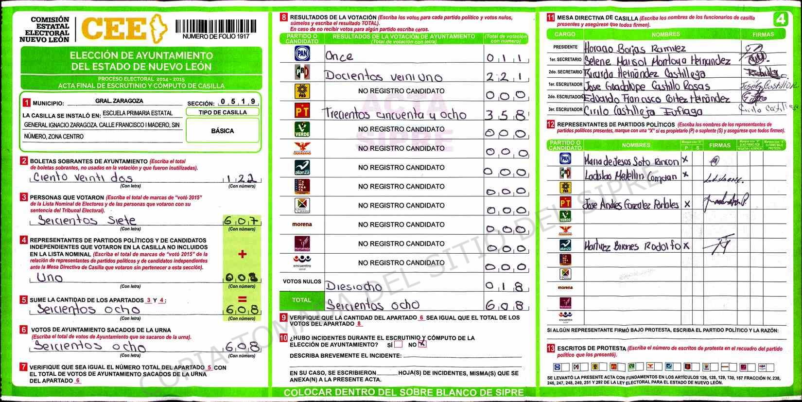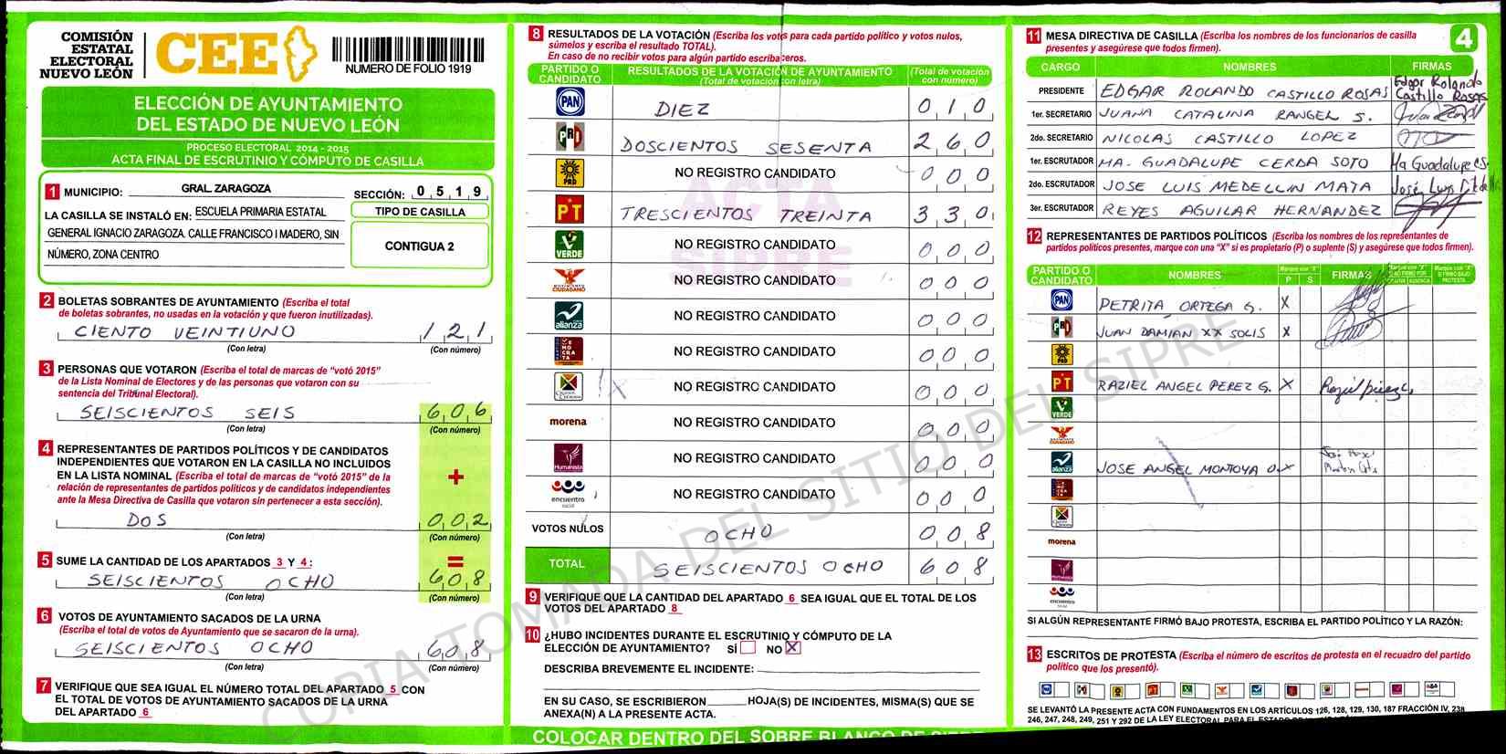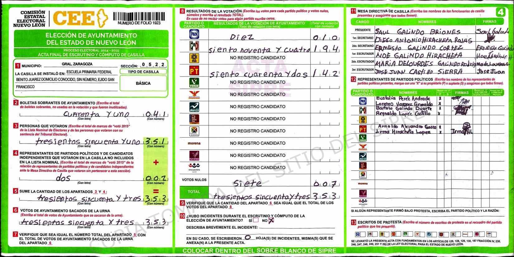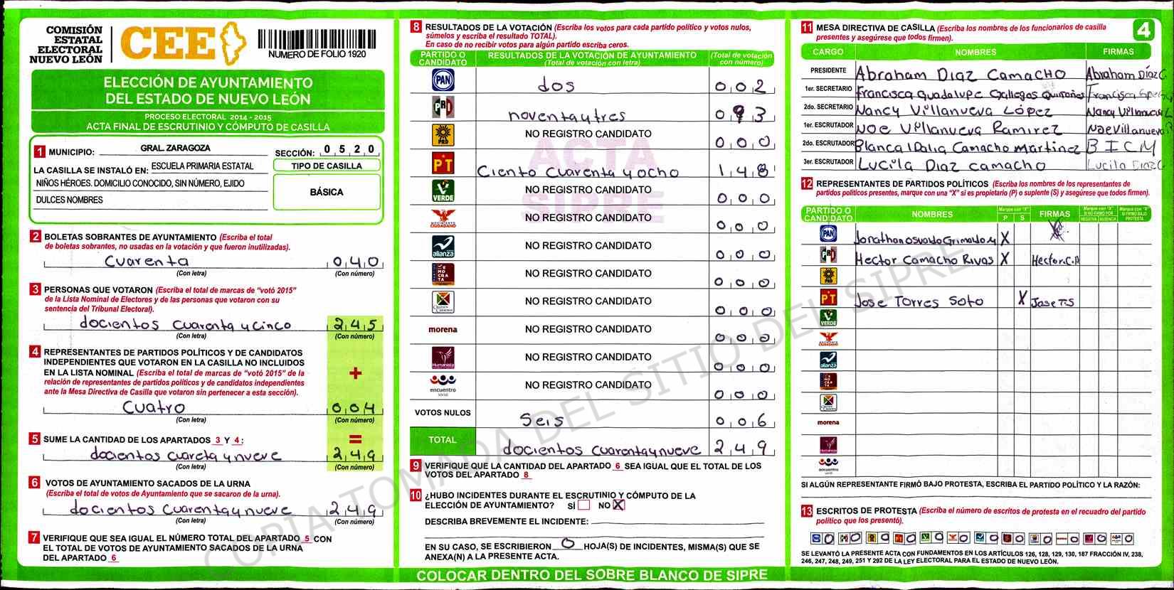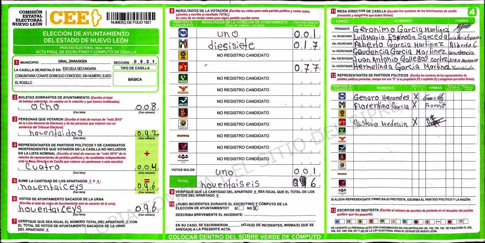 | Claves de Incidencia: | (1) Ilegible, (2) Mutilada, (3) Presenta Correcciones, (4) Presenta Borrones, (5) En Blanco, (6) Cifras Remarcadas, (7) Cifras de Mas, (8) Copiado Movido, (9) Con Signos Inválidos, (10) Excede Lista Nominal, (11) Otra |