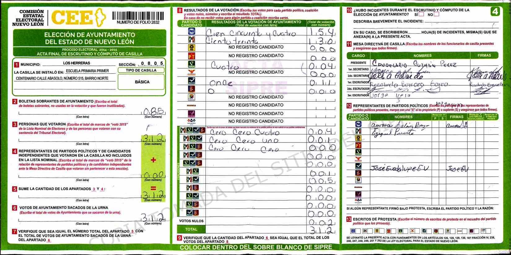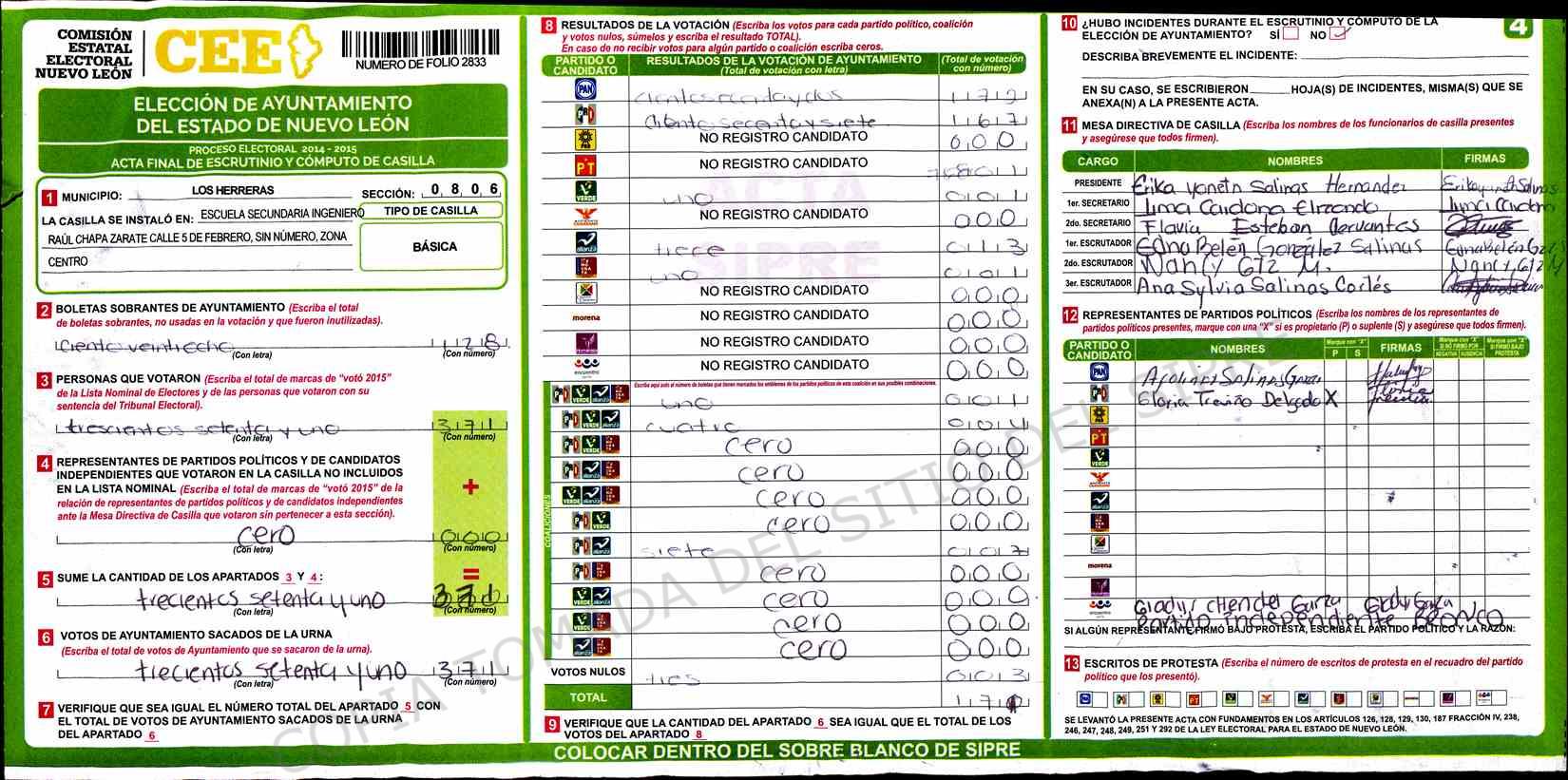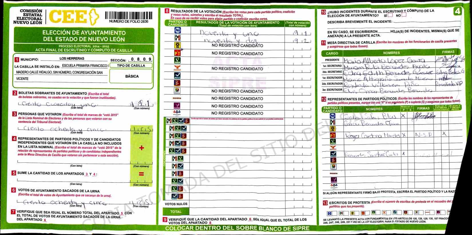 | Claves de Incidencia: | (1) Ilegible, (2) Mutilada, (3) Presenta Correcciones, (4) Presenta Borrones, (5) En Blanco, (6) Cifras Remarcadas, (7) Cifras de Mas, (8) Copiado Movido, (9) Con Signos Inválidos, (10) Excede Lista Nominal, (11) Otra |