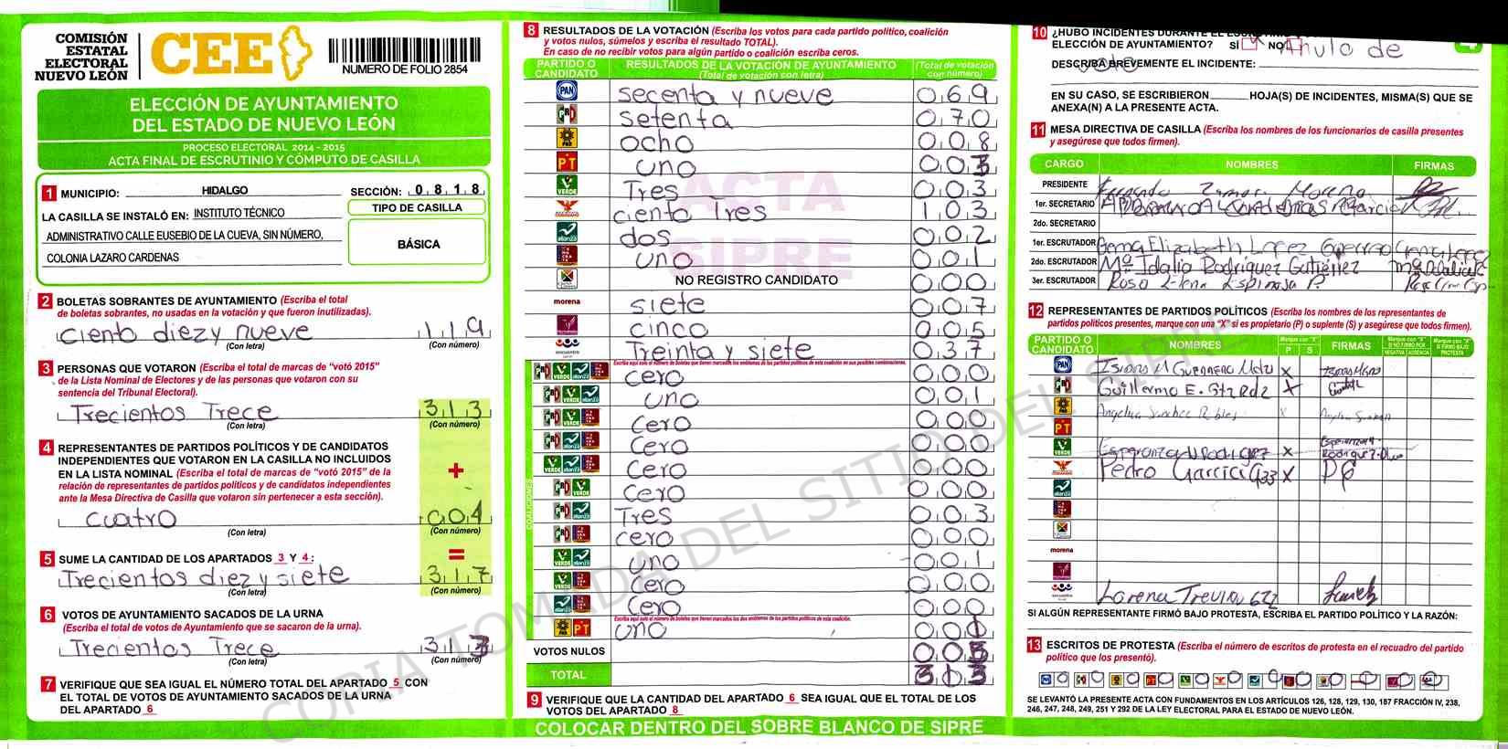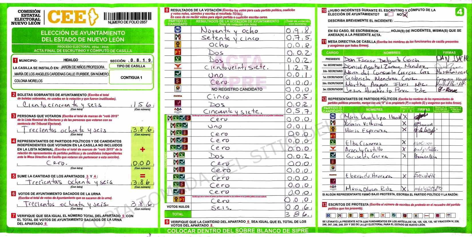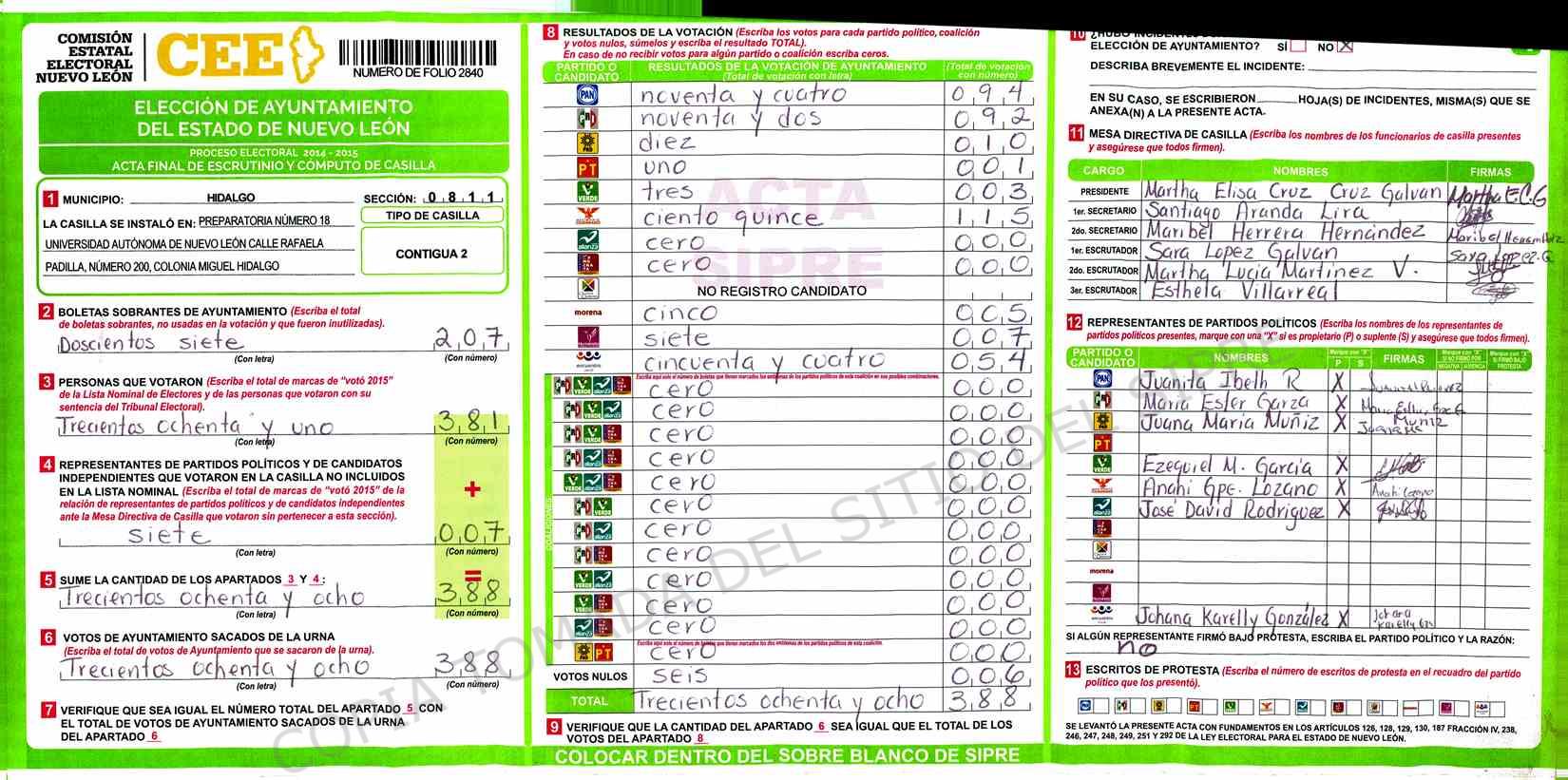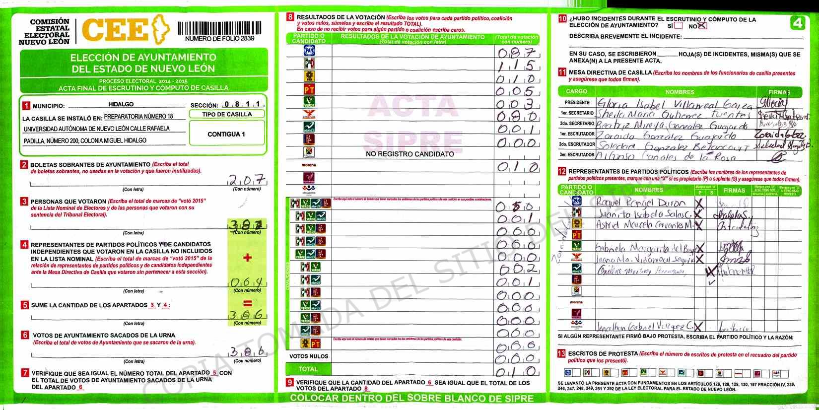 | Claves de Incidencia: | (1) Ilegible, (2) Mutilada, (3) Presenta Correcciones, (4) Presenta Borrones, (5) En Blanco, (6) Cifras Remarcadas, (7) Cifras de Mas, (8) Copiado Movido, (9) Con Signos Inválidos, (10) Excede Lista Nominal, (11) Otra |