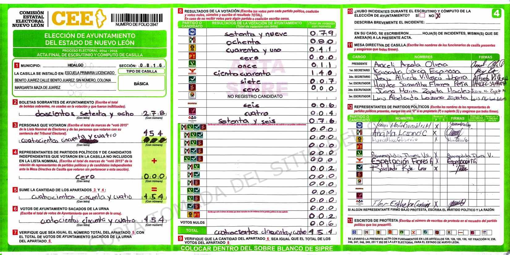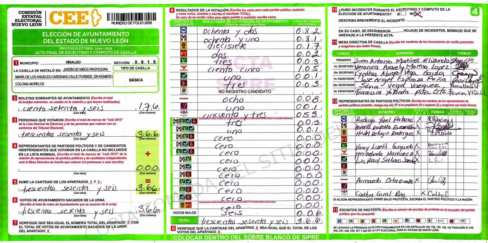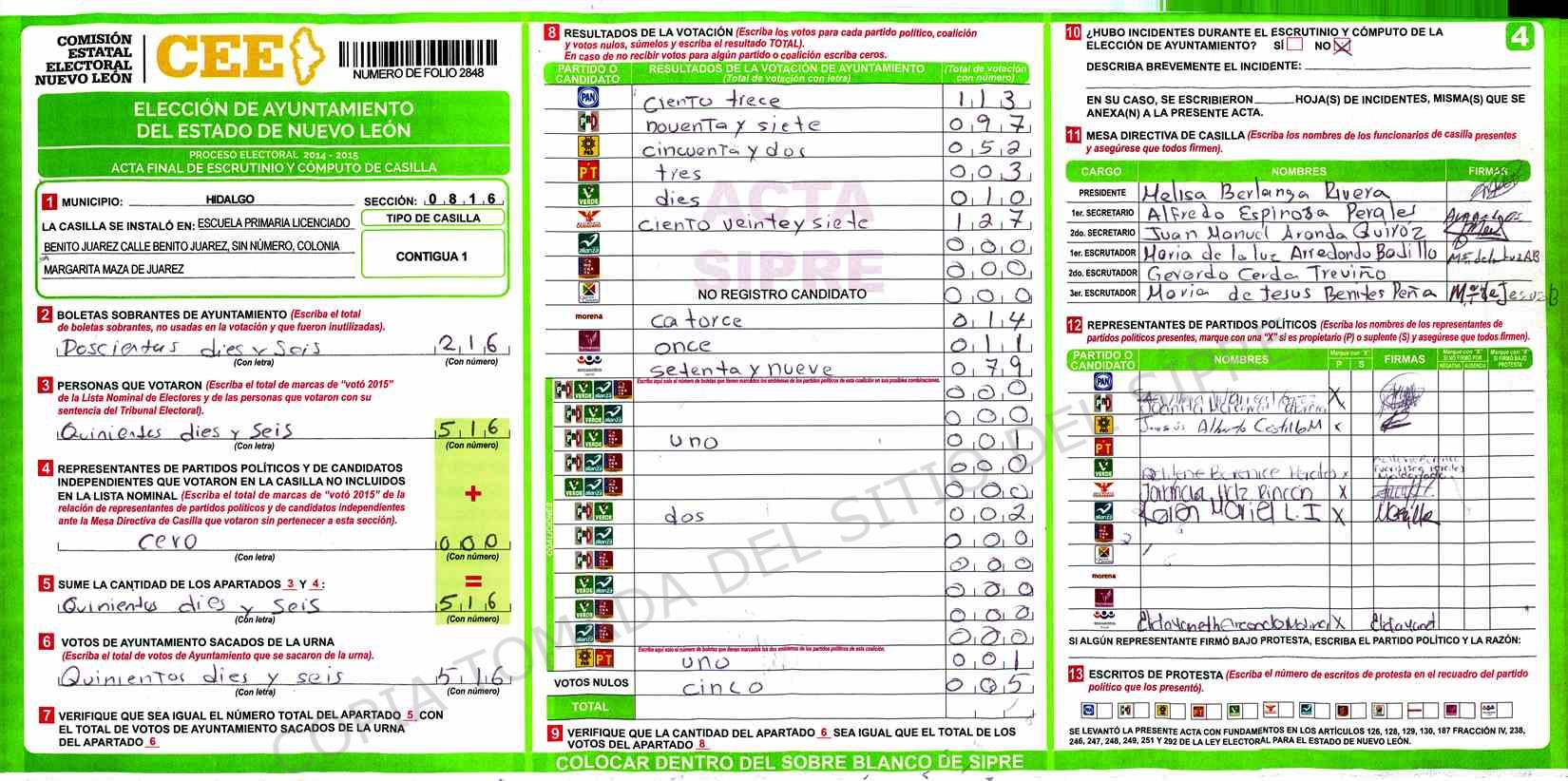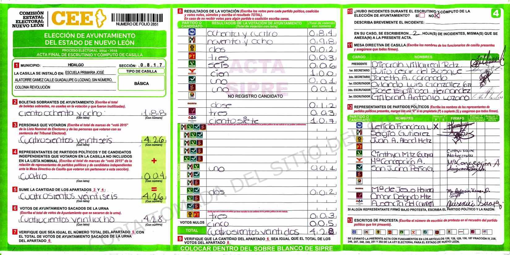 | Claves de Incidencia: | (1) Ilegible, (2) Mutilada, (3) Presenta Correcciones, (4) Presenta Borrones, (5) En Blanco, (6) Cifras Remarcadas, (7) Cifras de Mas, (8) Copiado Movido, (9) Con Signos Inválidos, (10) Excede Lista Nominal, (11) Otra |