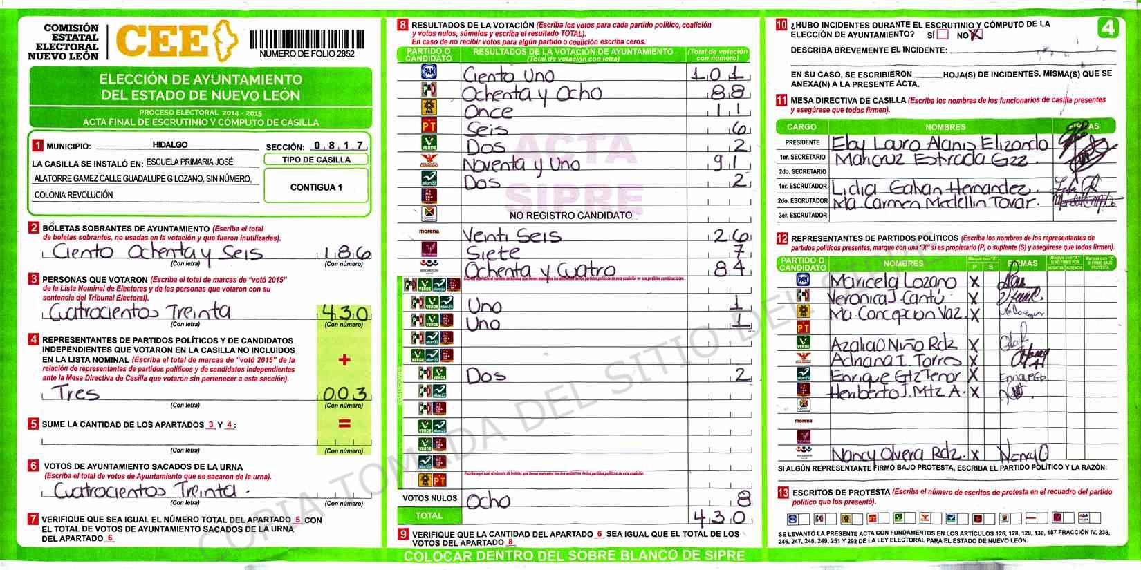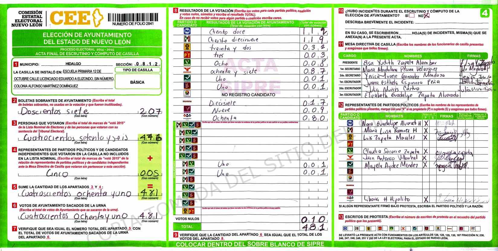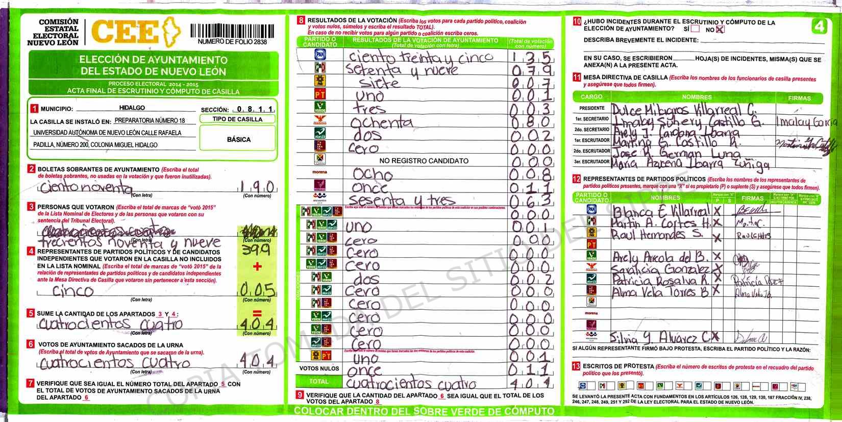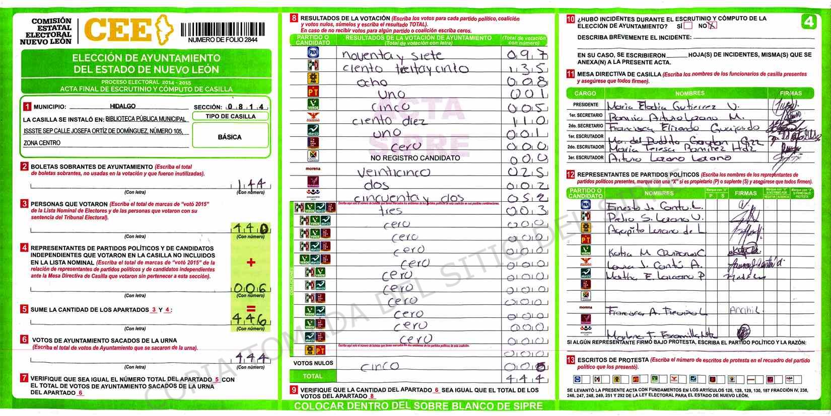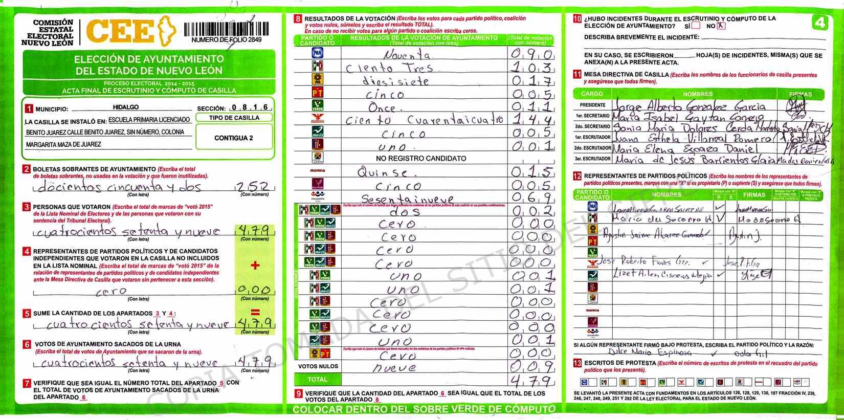 | Claves de Incidencia: | (1) Ilegible, (2) Mutilada, (3) Presenta Correcciones, (4) Presenta Borrones, (5) En Blanco, (6) Cifras Remarcadas, (7) Cifras de Mas, (8) Copiado Movido, (9) Con Signos Inválidos, (10) Excede Lista Nominal, (11) Otra |
