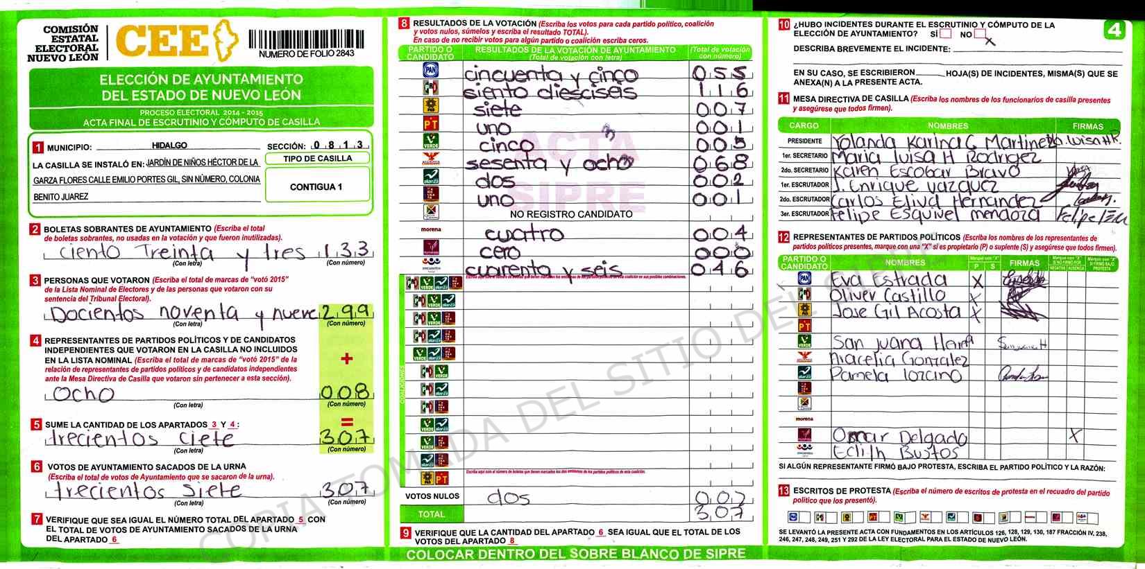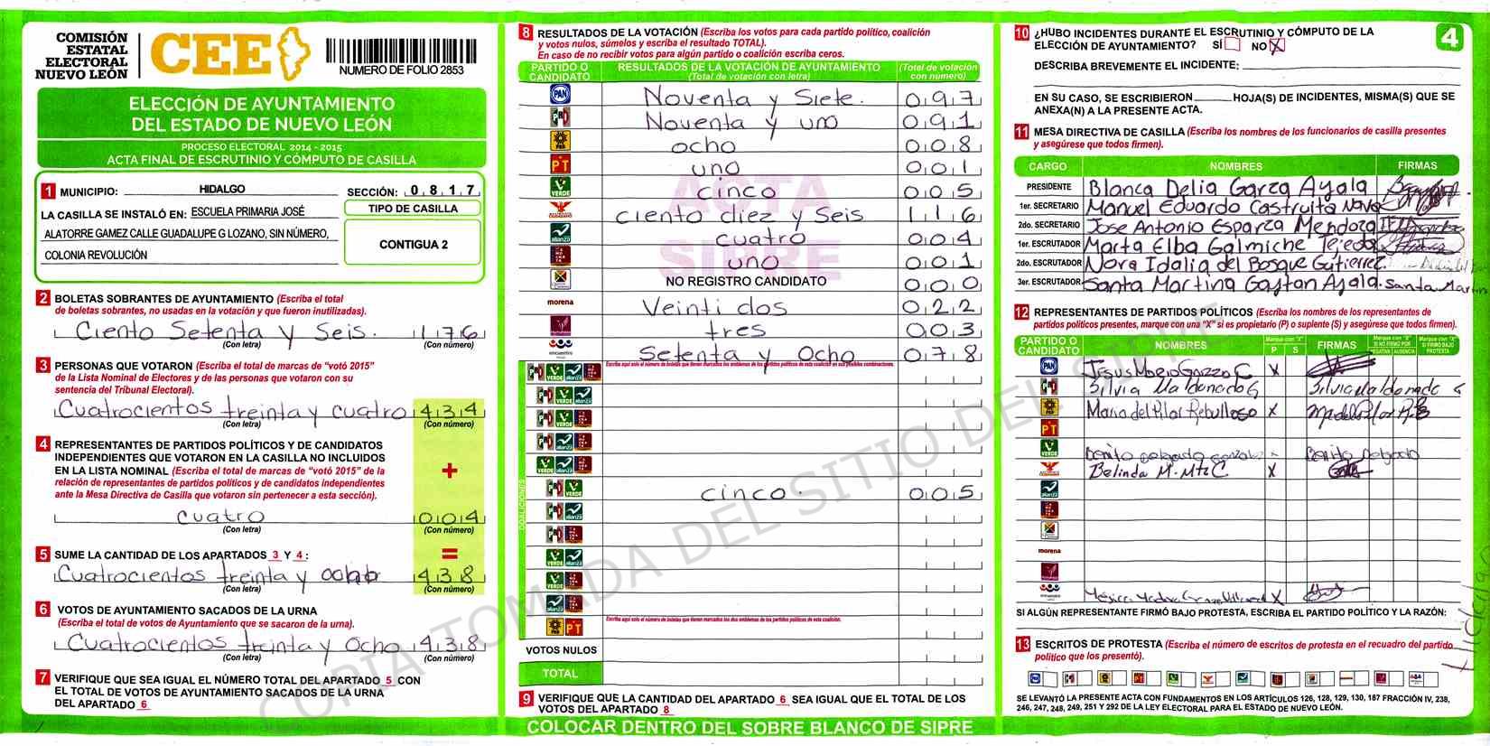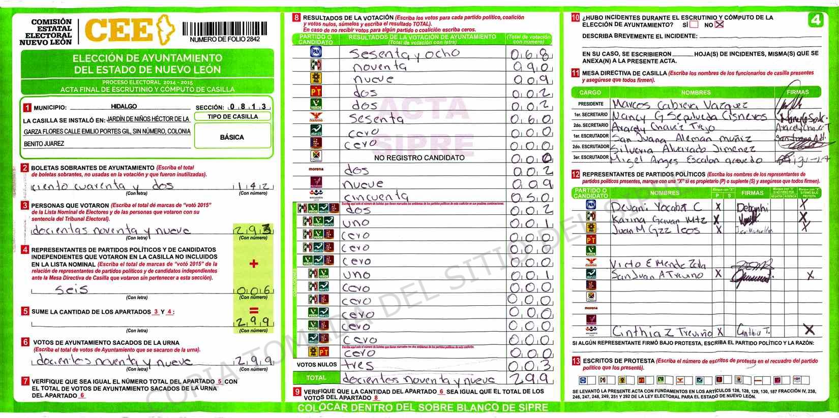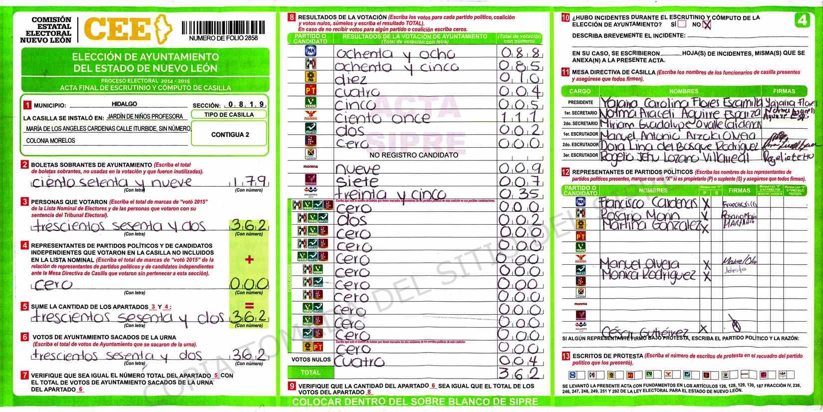 | Claves de Incidencia: | (1) Ilegible, (2) Mutilada, (3) Presenta Correcciones, (4) Presenta Borrones, (5) En Blanco, (6) Cifras Remarcadas, (7) Cifras de Mas, (8) Copiado Movido, (9) Con Signos Inválidos, (10) Excede Lista Nominal, (11) Otra |