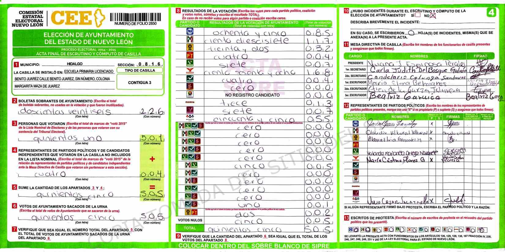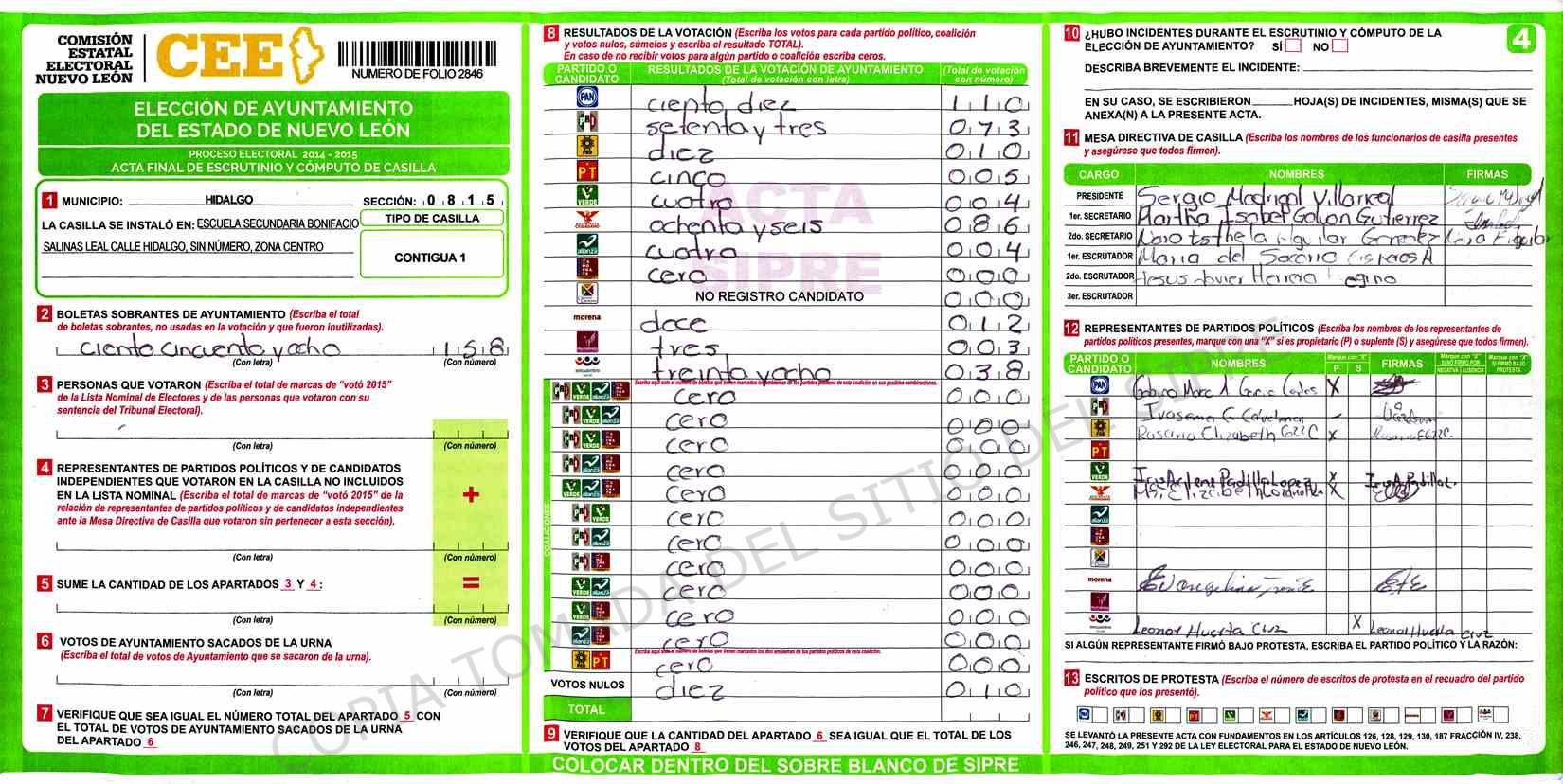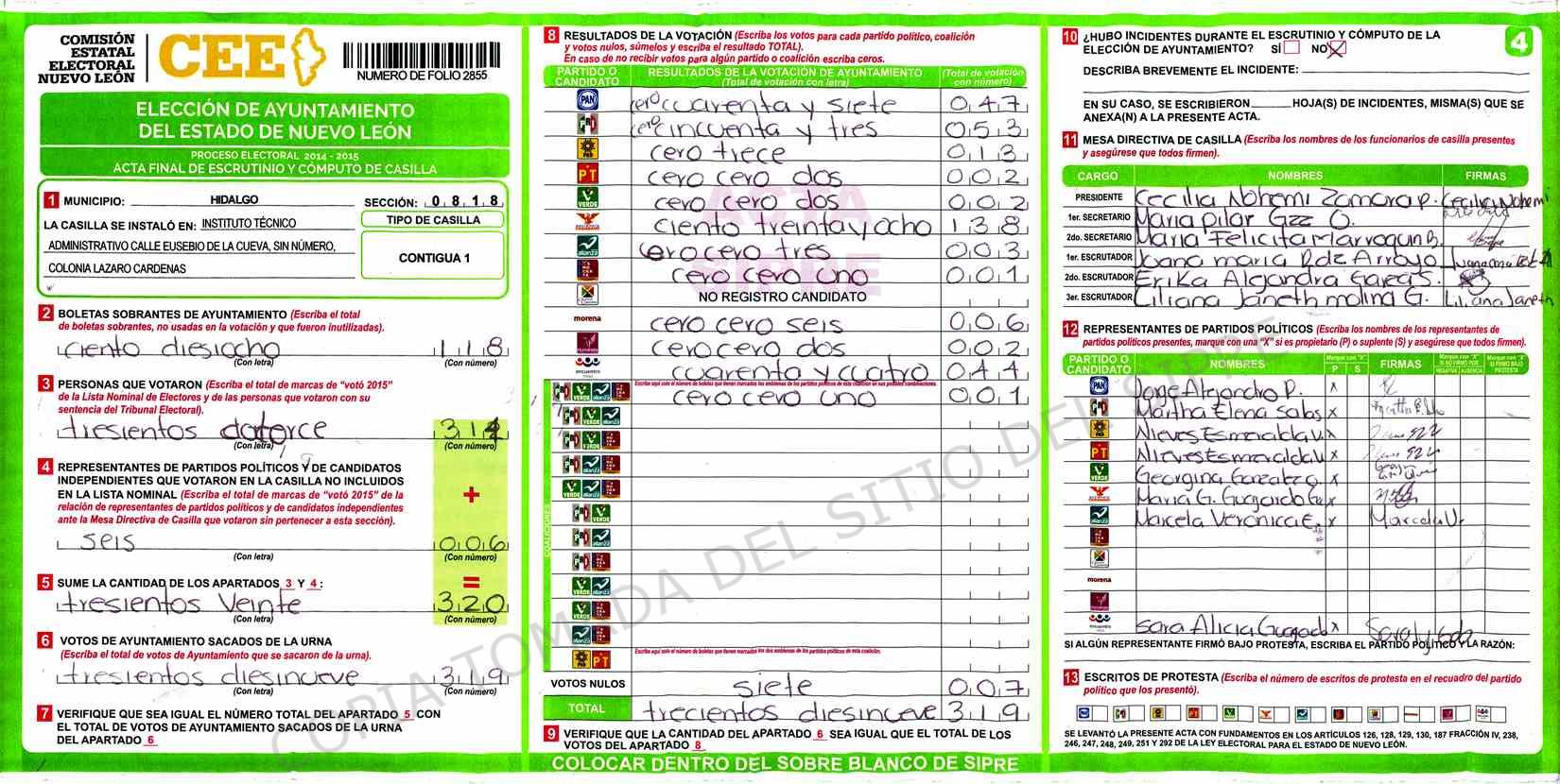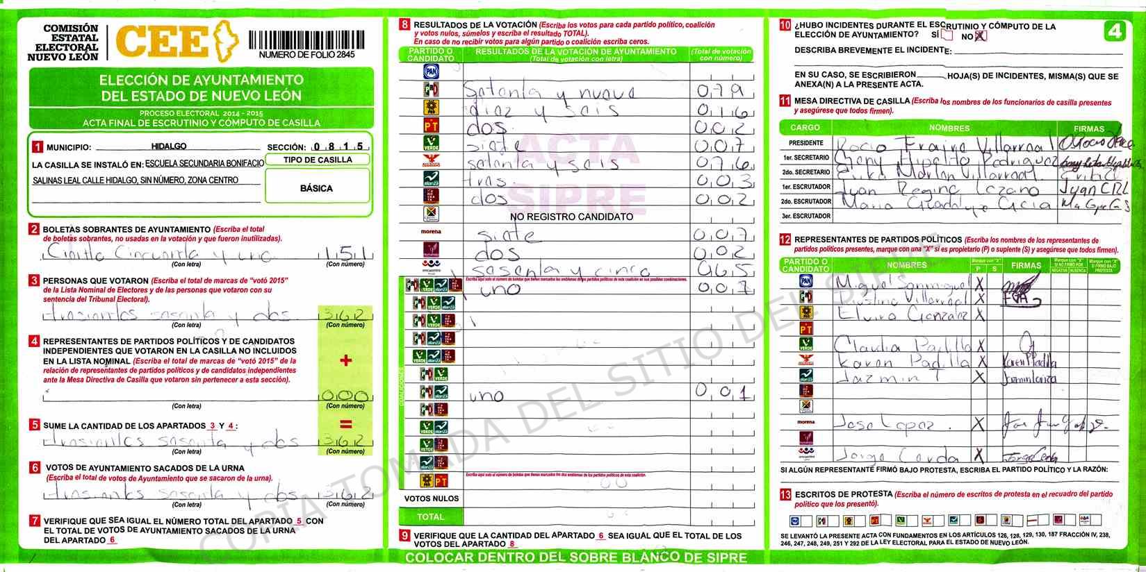| Claves de Incidencia: | (1) Ilegible, (2) Mutilada, (3) Presenta Correcciones, (4) Presenta Borrones, (5) En Blanco, (6) Cifras Remarcadas, (7) Cifras de Mas, (8) Copiado Movido, (9) Con Signos Inválidos, (10) Excede Lista Nominal, (11) Otra |