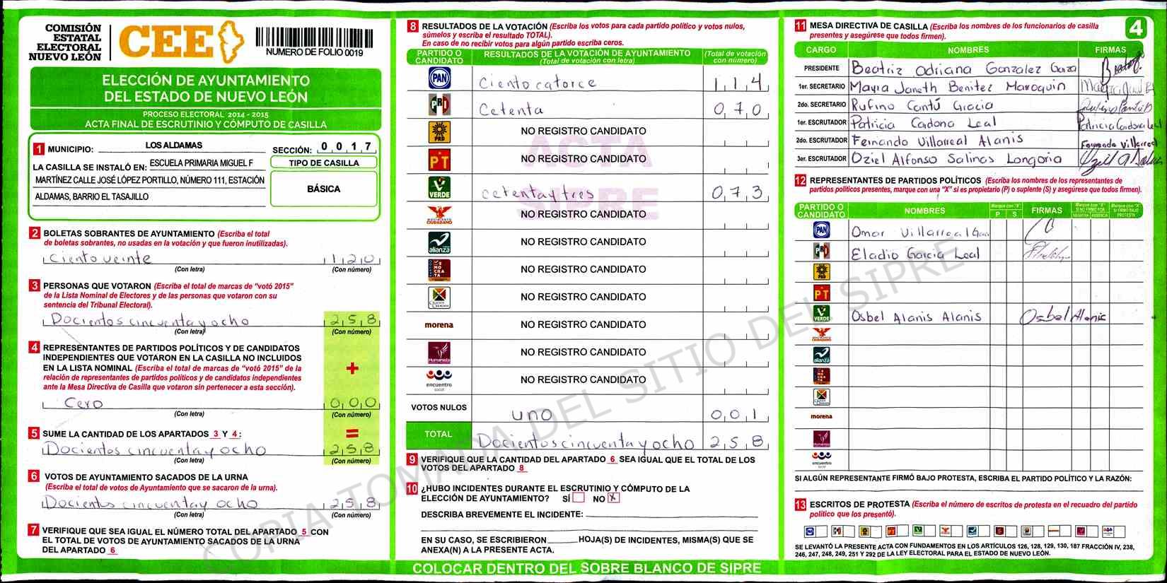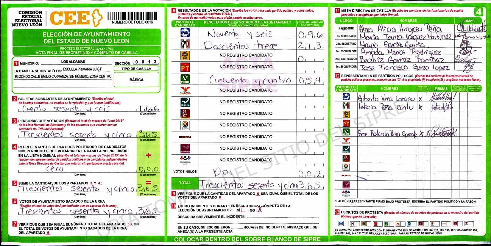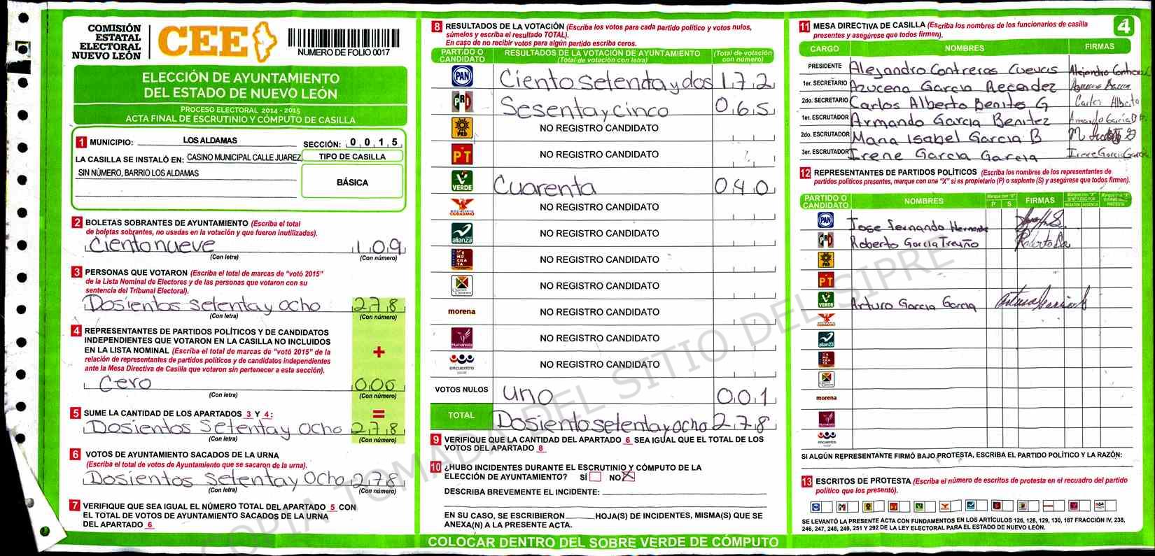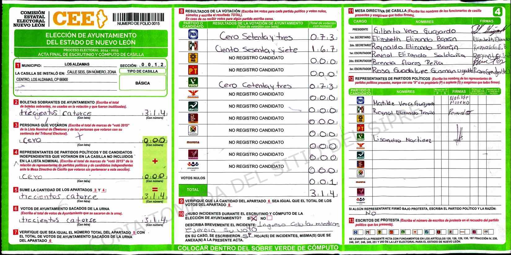 | Claves de Incidencia: | (1) Ilegible, (2) Mutilada, (3) Presenta Correcciones, (4) Presenta Borrones, (5) En Blanco, (6) Cifras Remarcadas, (7) Cifras de Mas, (8) Copiado Movido, (9) Con Signos Inválidos, (10) Excede Lista Nominal, (11) Otra |