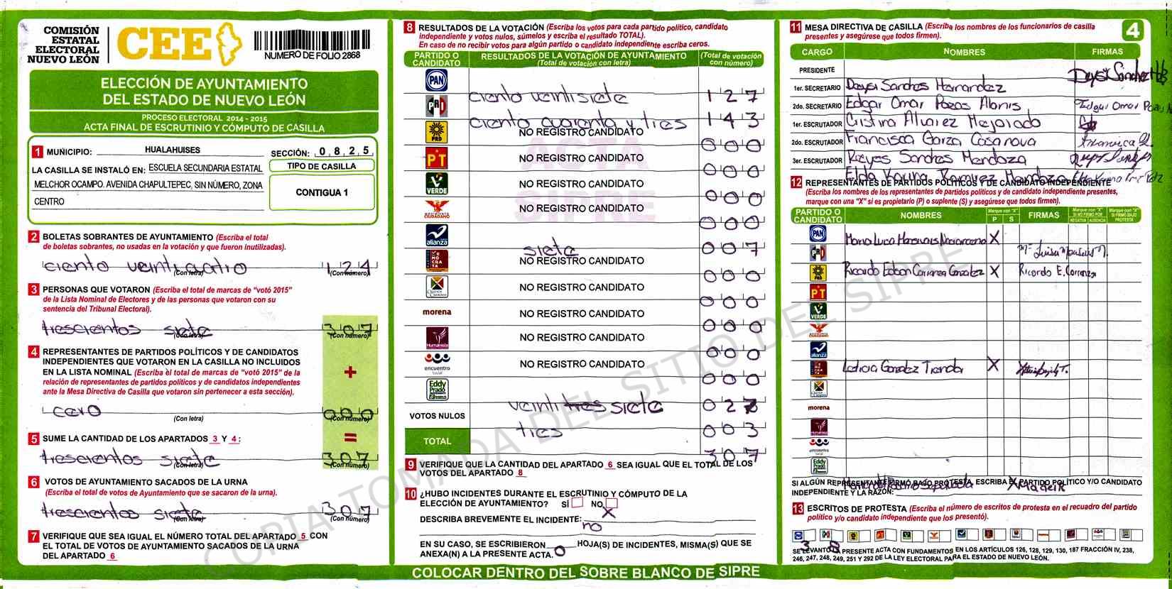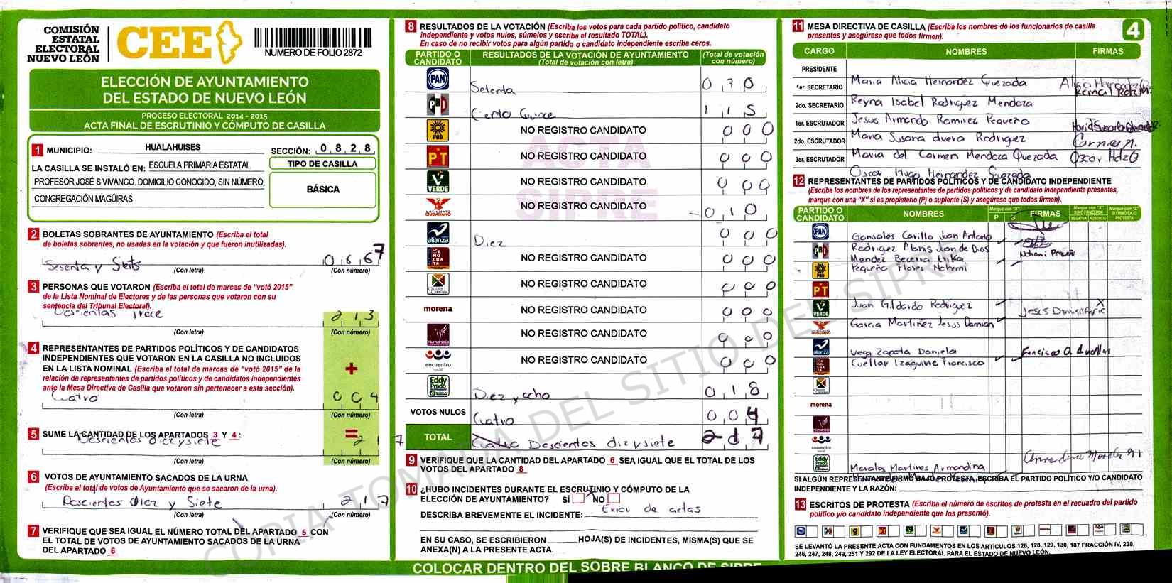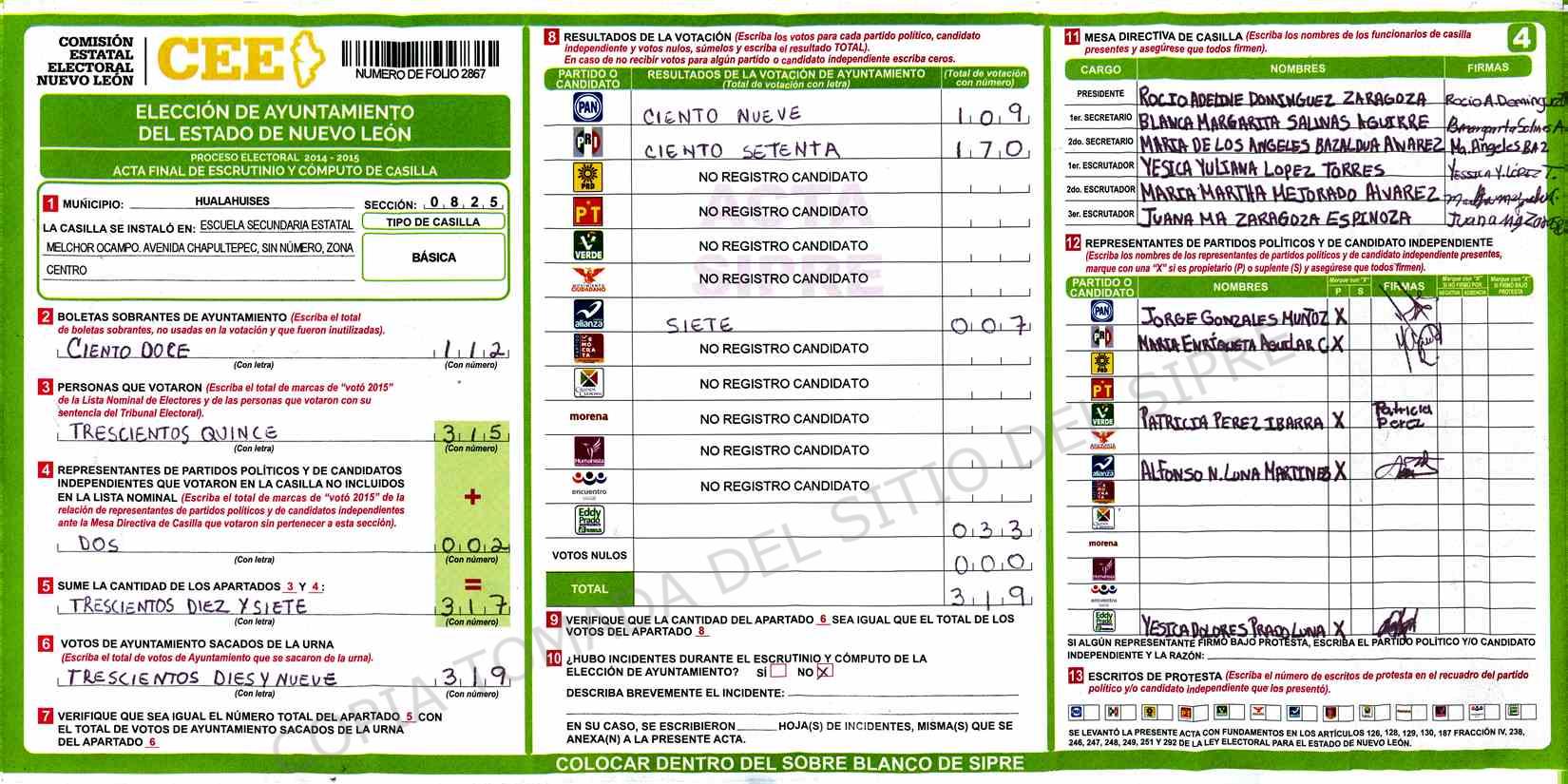 | Claves de Incidencia: | (1) Ilegible, (2) Mutilada, (3) Presenta Correcciones, (4) Presenta Borrones, (5) En Blanco, (6) Cifras Remarcadas, (7) Cifras de Mas, (8) Copiado Movido, (9) Con Signos Inválidos, (10) Excede Lista Nominal, (11) Otra |