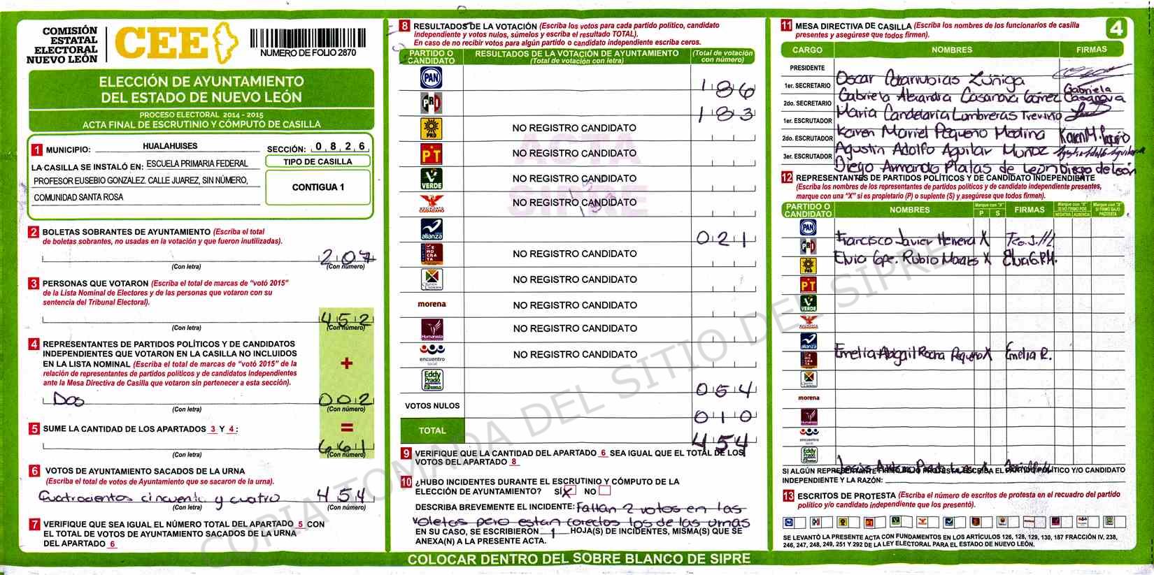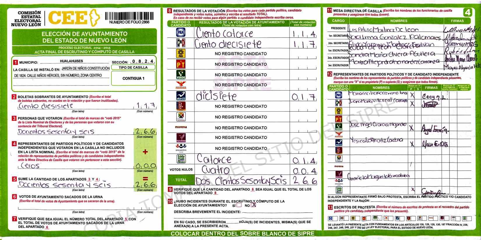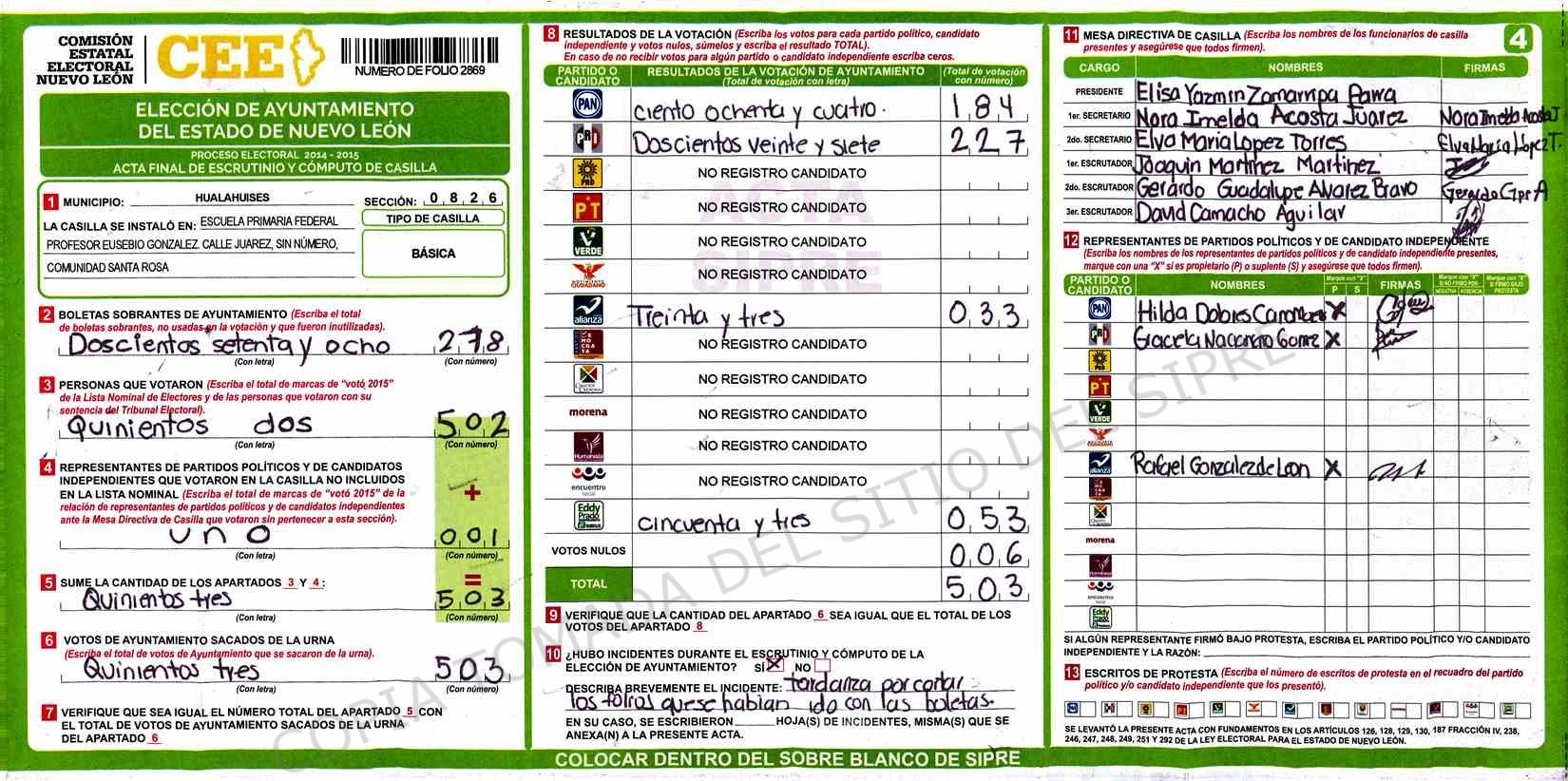 | Claves de Incidencia: | (1) Ilegible, (2) Mutilada, (3) Presenta Correcciones, (4) Presenta Borrones, (5) En Blanco, (6) Cifras Remarcadas, (7) Cifras de Mas, (8) Copiado Movido, (9) Con Signos Inválidos, (10) Excede Lista Nominal, (11) Otra |