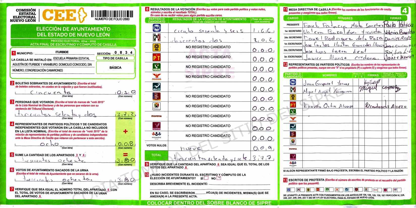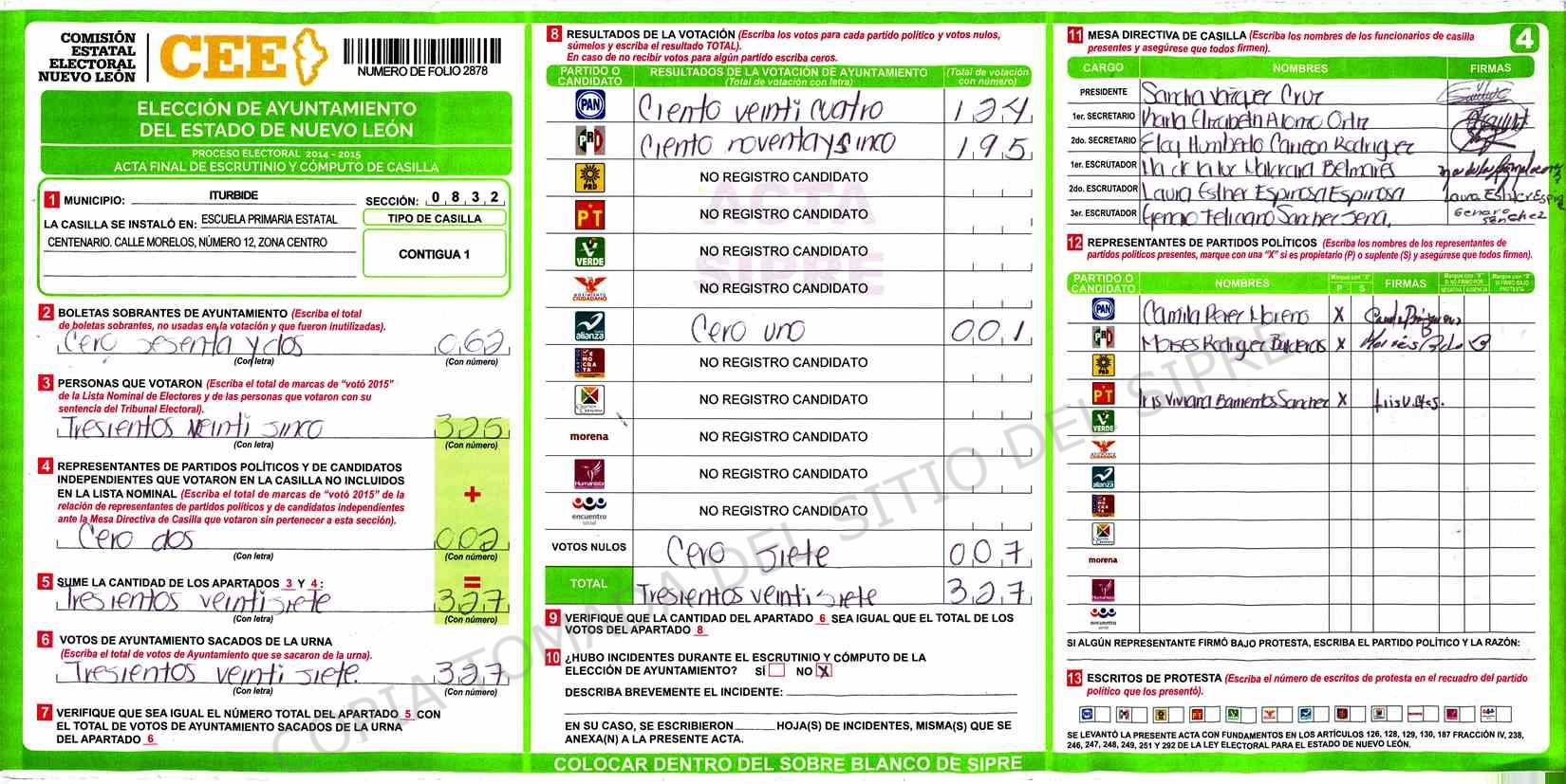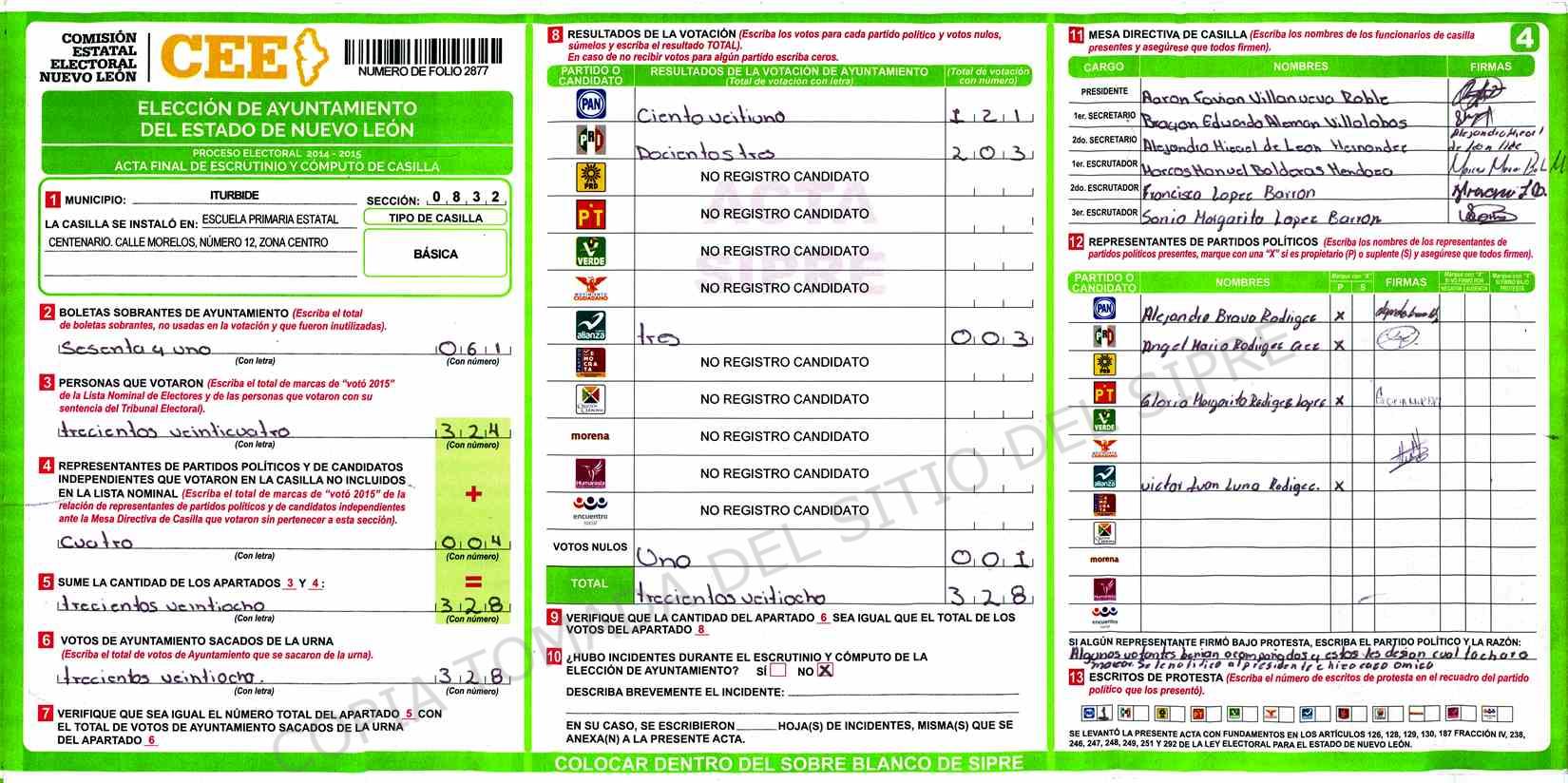 | Claves de Incidencia: | (1) Ilegible, (2) Mutilada, (3) Presenta Correcciones, (4) Presenta Borrones, (5) En Blanco, (6) Cifras Remarcadas, (7) Cifras de Mas, (8) Copiado Movido, (9) Con Signos Inválidos, (10) Excede Lista Nominal, (11) Otra |