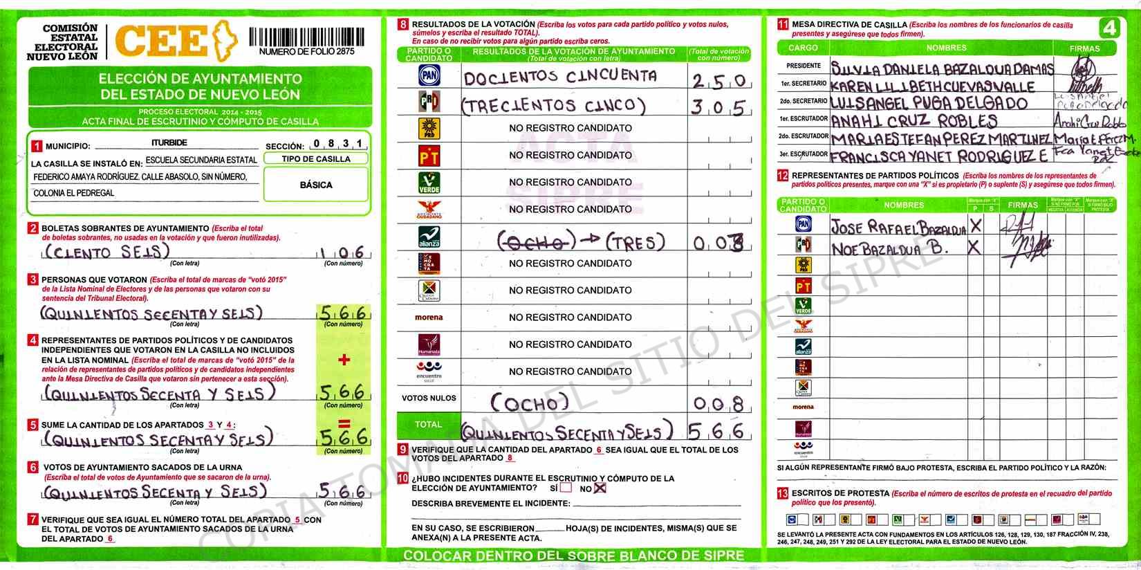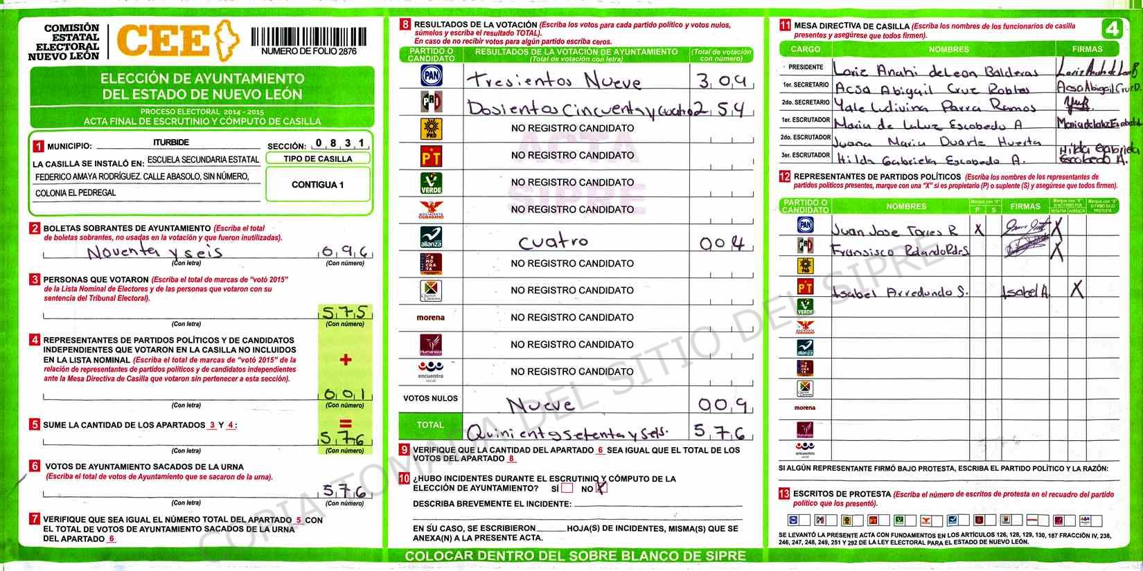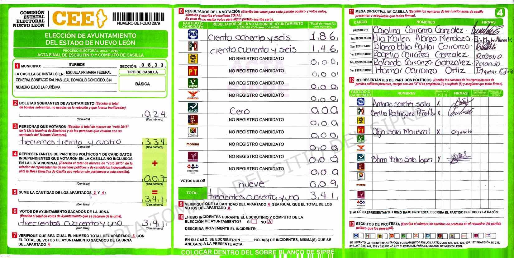 | Claves de Incidencia: | (1) Ilegible, (2) Mutilada, (3) Presenta Correcciones, (4) Presenta Borrones, (5) En Blanco, (6) Cifras Remarcadas, (7) Cifras de Mas, (8) Copiado Movido, (9) Con Signos Inválidos, (10) Excede Lista Nominal, (11) Otra |