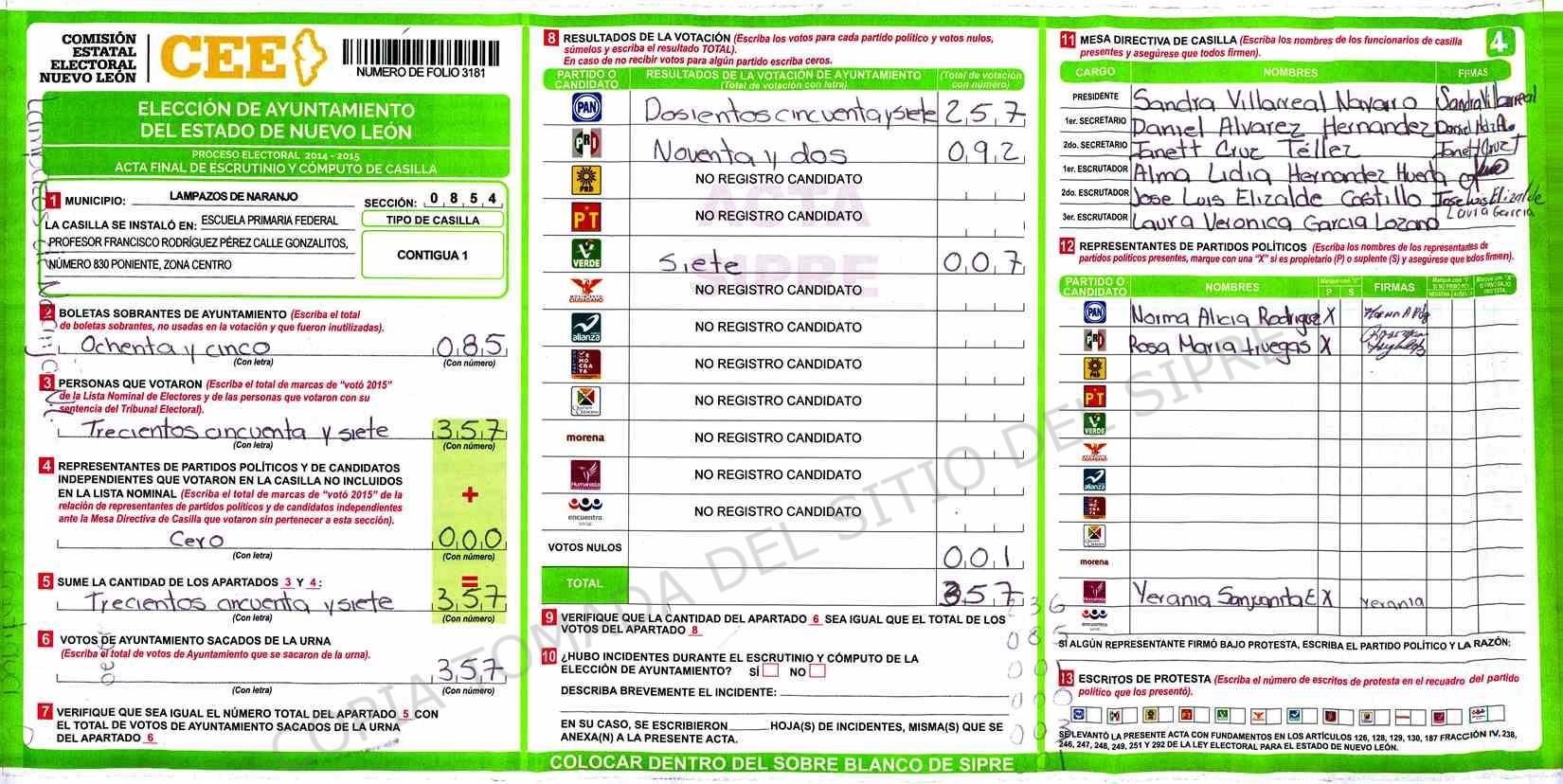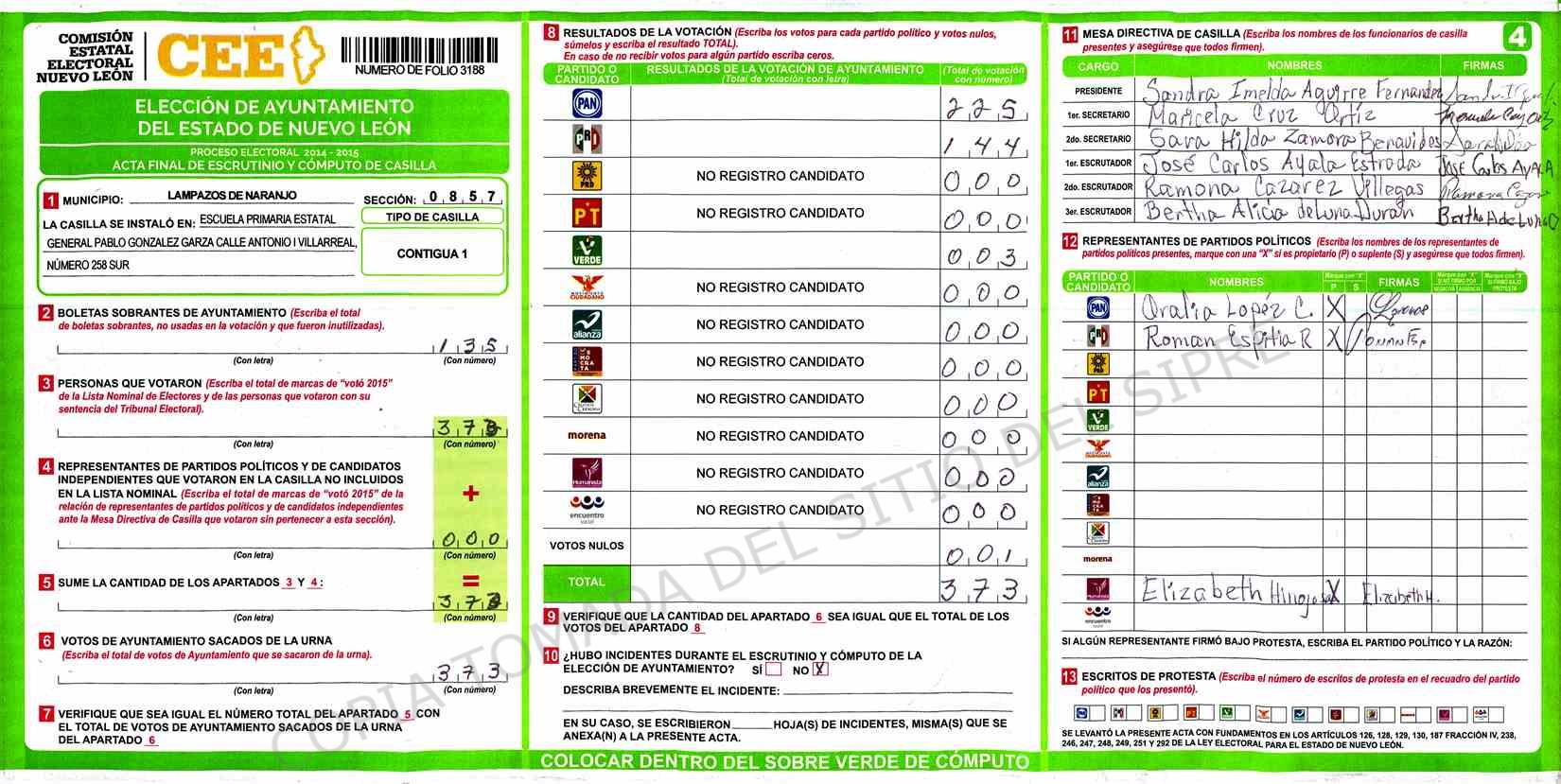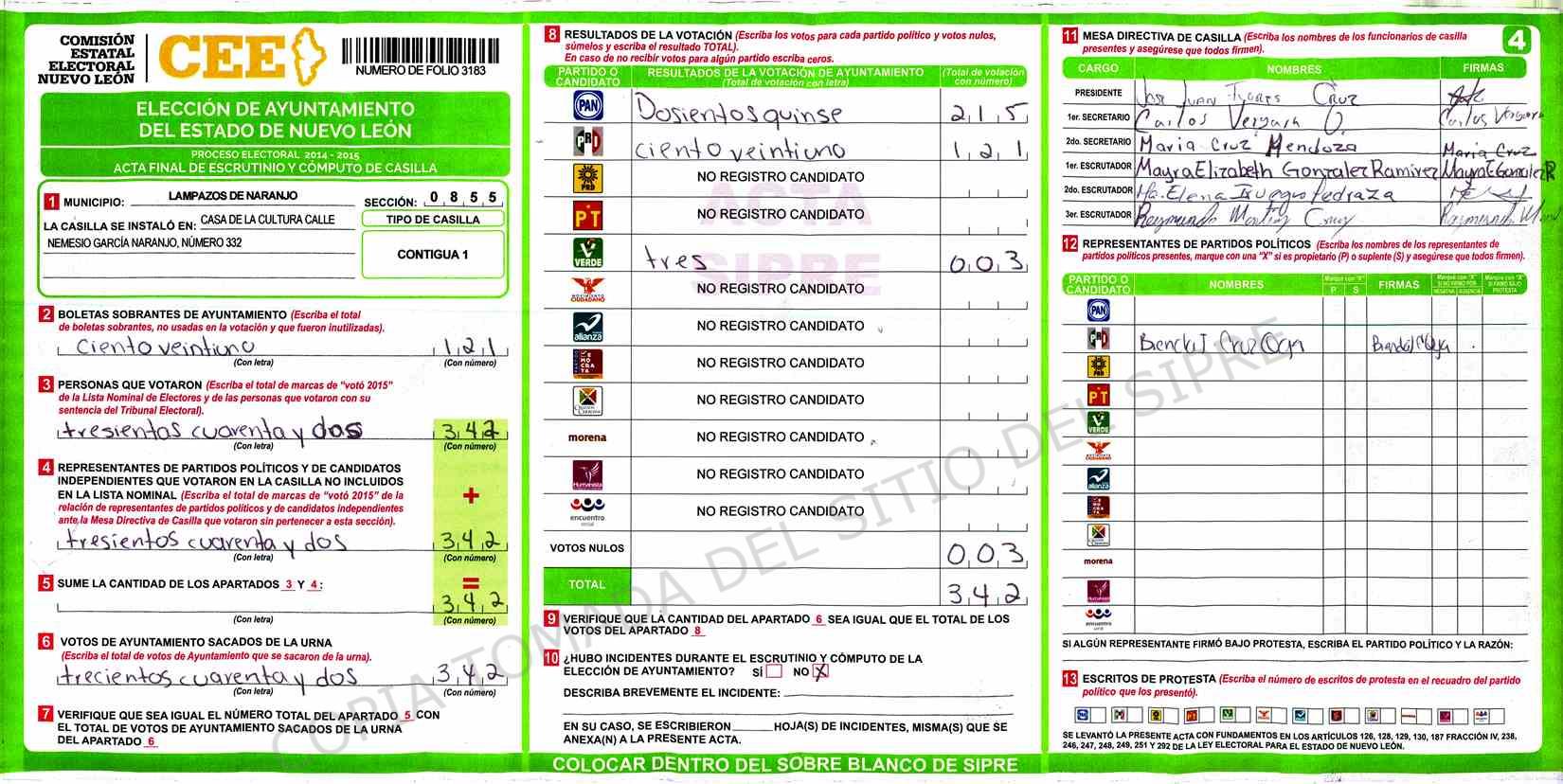 | Claves de Incidencia: | (1) Ilegible, (2) Mutilada, (3) Presenta Correcciones, (4) Presenta Borrones, (5) En Blanco, (6) Cifras Remarcadas, (7) Cifras de Mas, (8) Copiado Movido, (9) Con Signos Inválidos, (10) Excede Lista Nominal, (11) Otra |