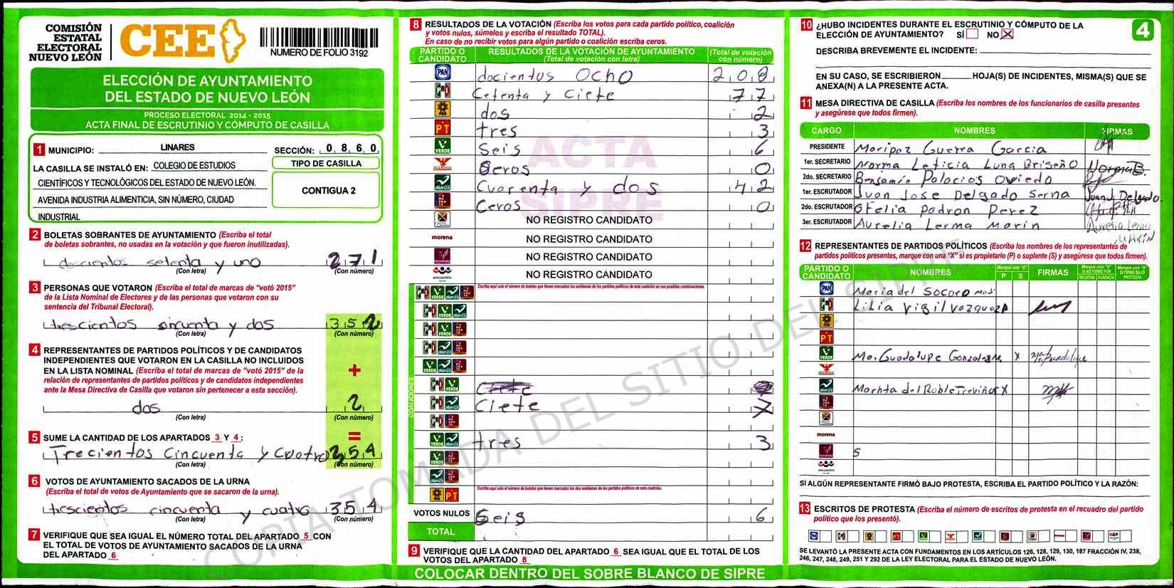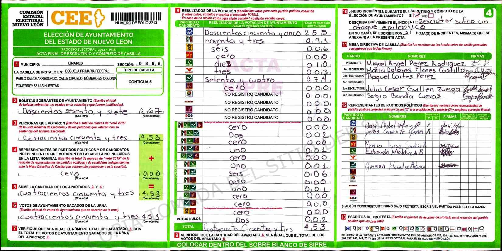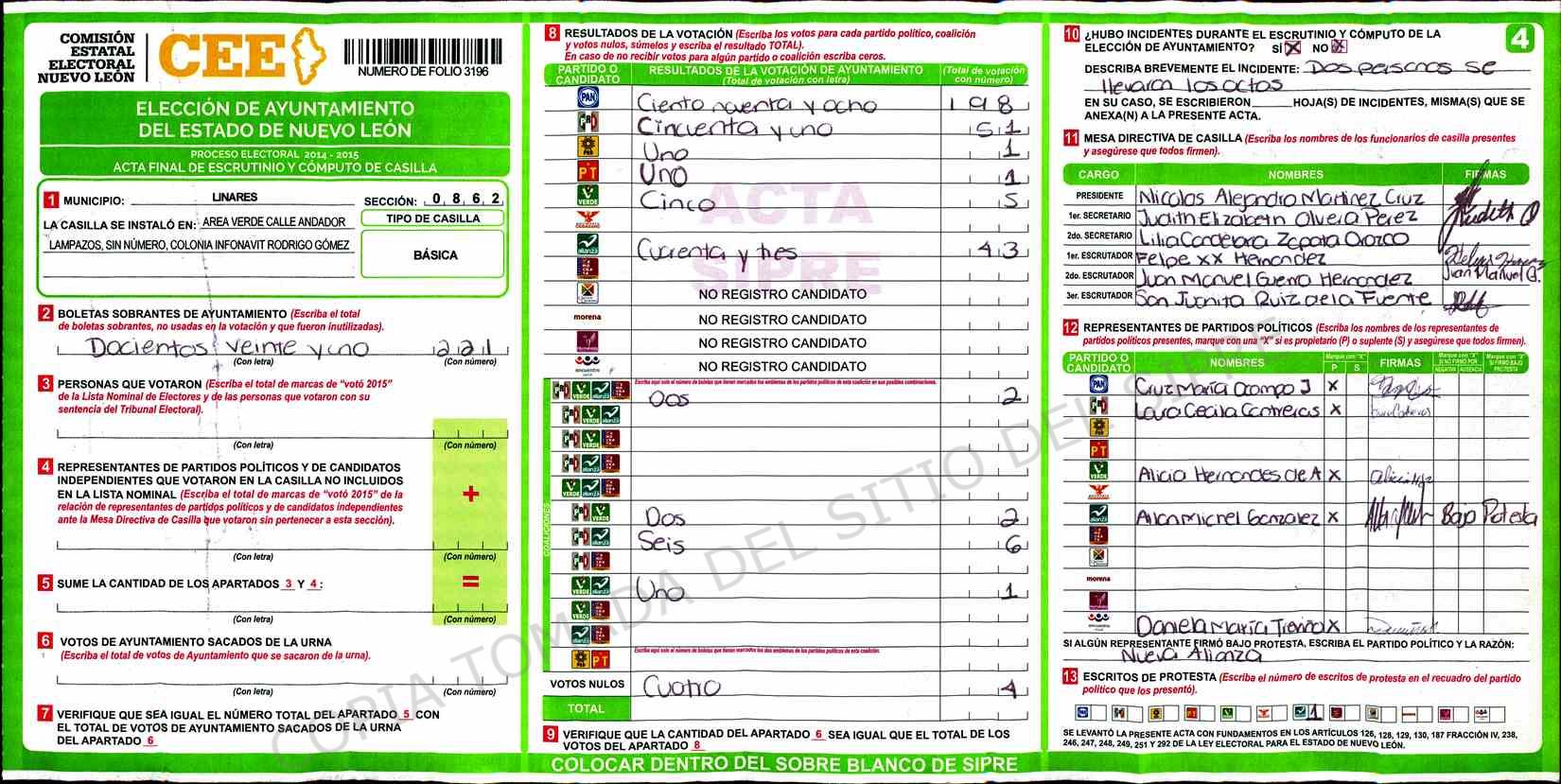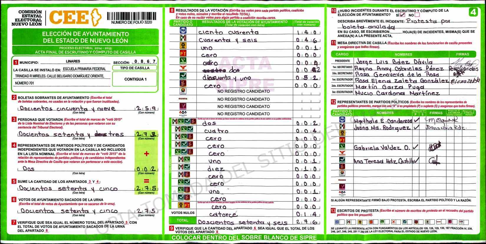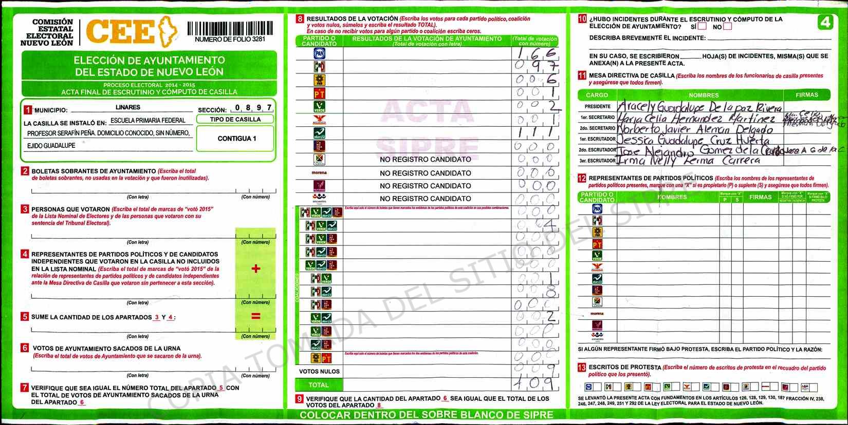 | Claves de Incidencia: | (1) Ilegible, (2) Mutilada, (3) Presenta Correcciones, (4) Presenta Borrones, (5) En Blanco, (6) Cifras Remarcadas, (7) Cifras de Mas, (8) Copiado Movido, (9) Con Signos Inválidos, (10) Excede Lista Nominal, (11) Otra |