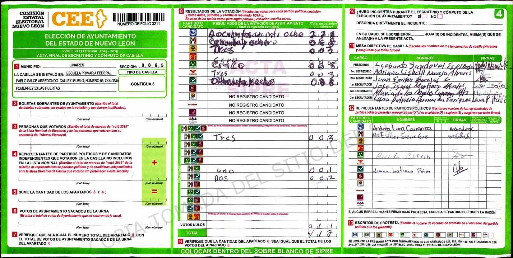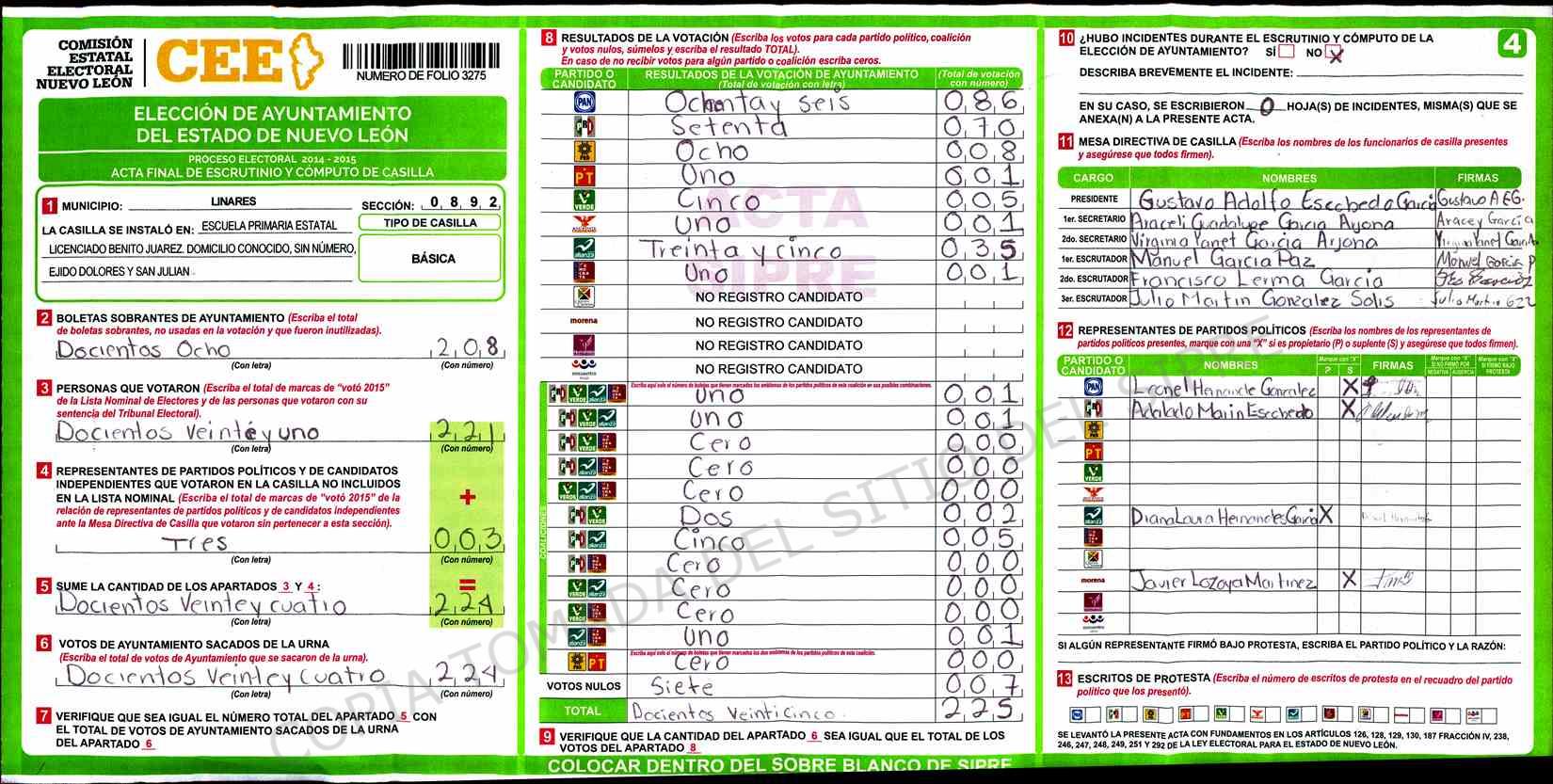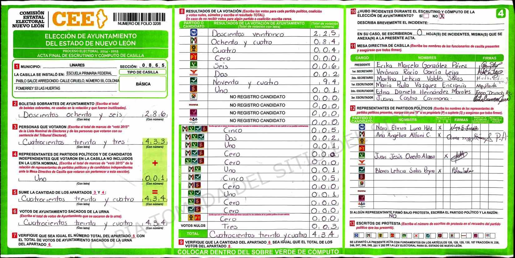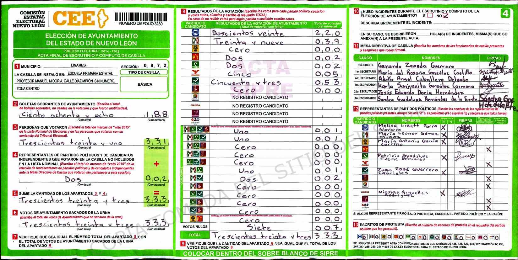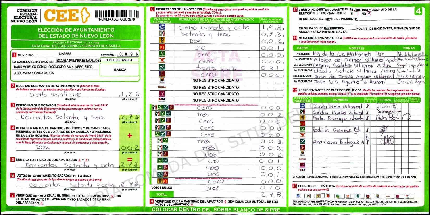 | Claves de Incidencia: | (1) Ilegible, (2) Mutilada, (3) Presenta Correcciones, (4) Presenta Borrones, (5) En Blanco, (6) Cifras Remarcadas, (7) Cifras de Mas, (8) Copiado Movido, (9) Con Signos Inválidos, (10) Excede Lista Nominal, (11) Otra |