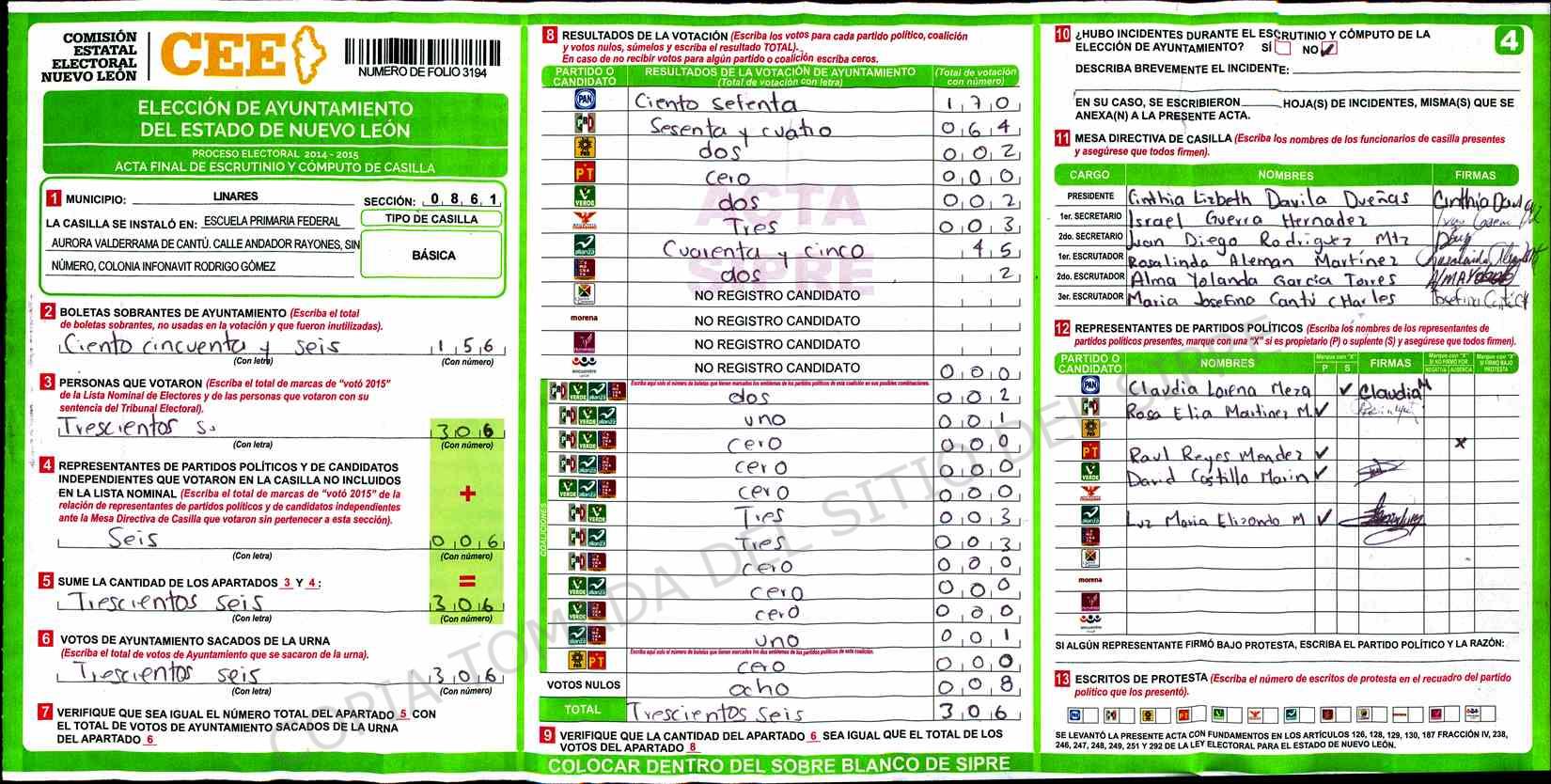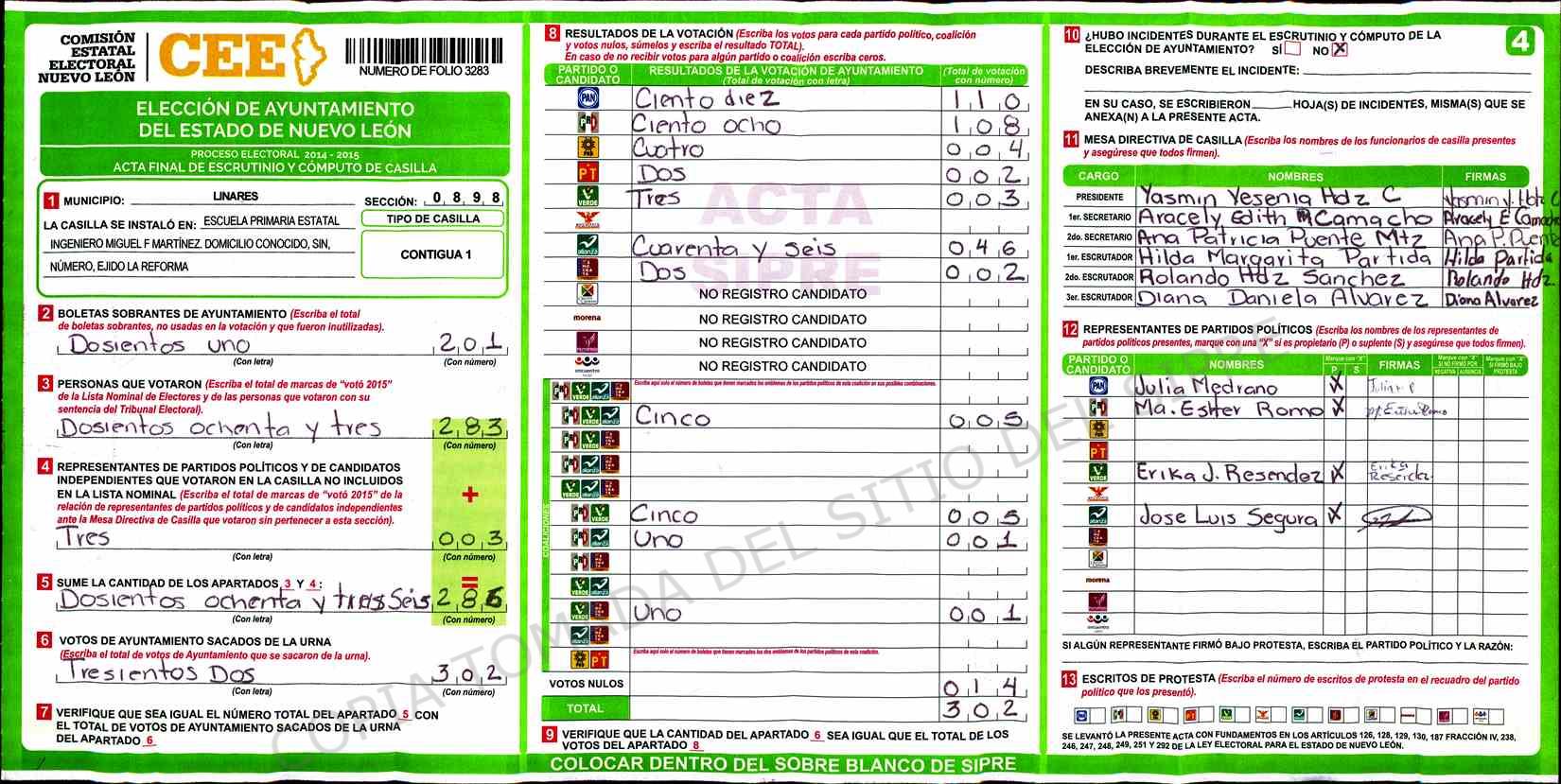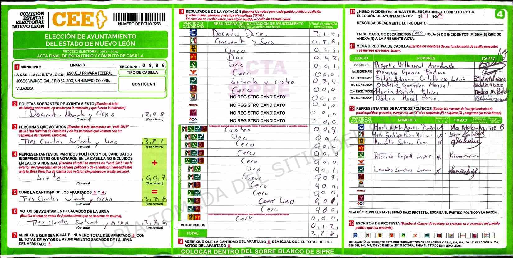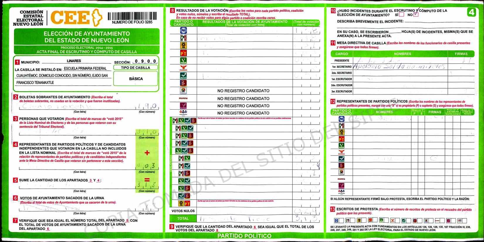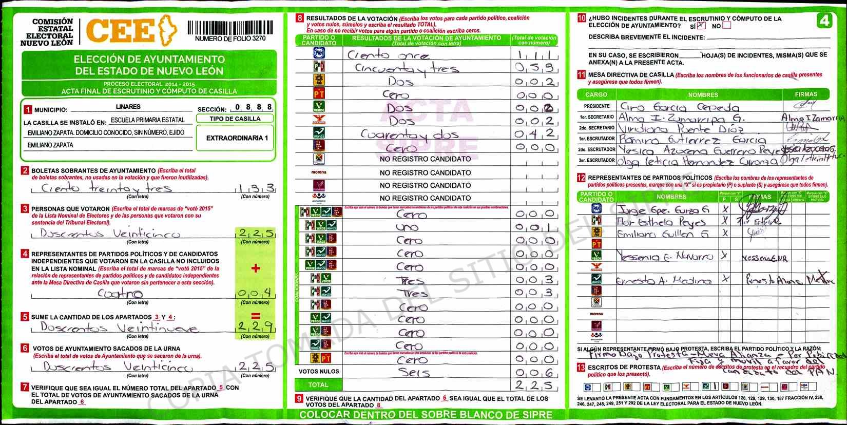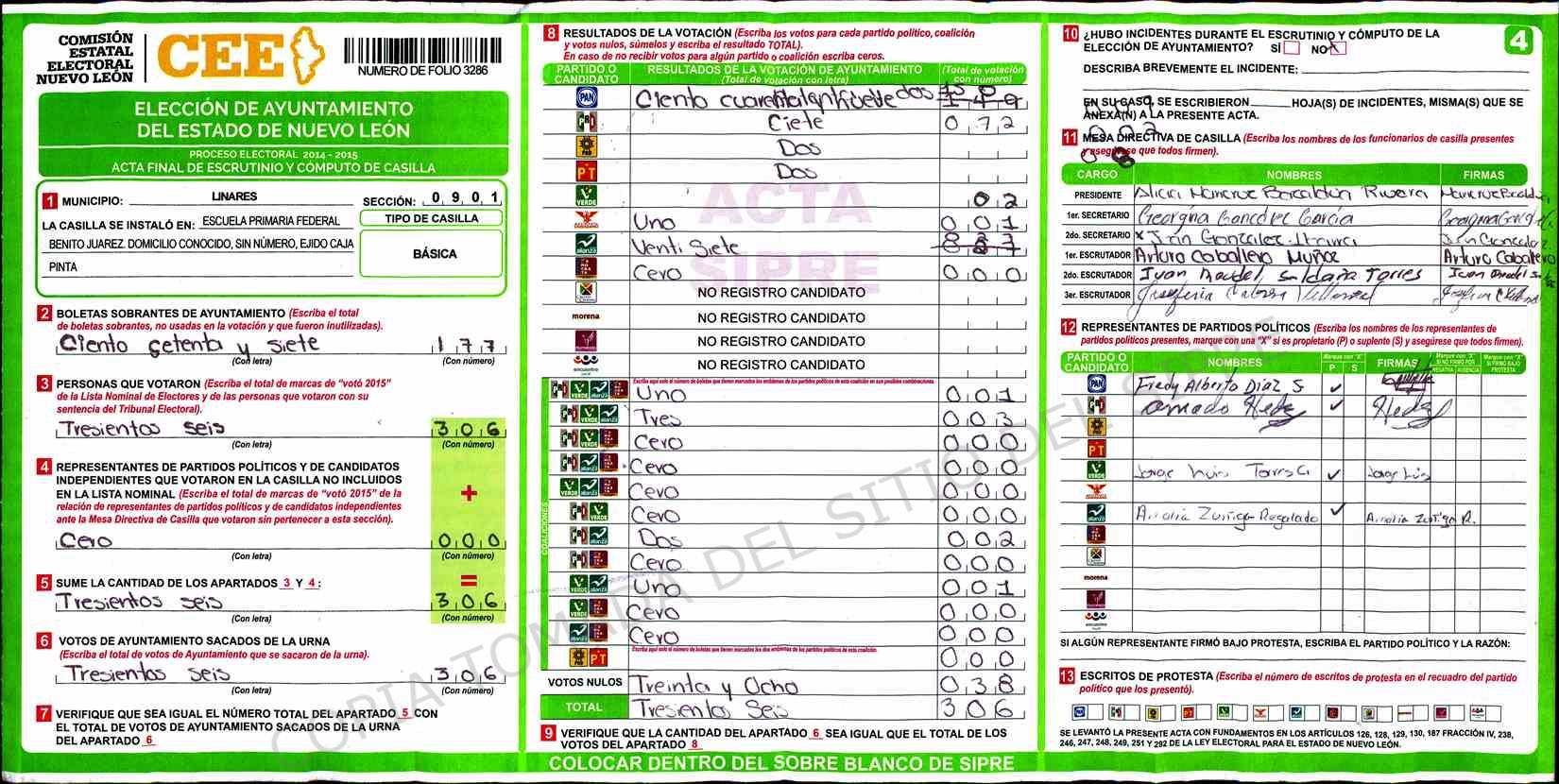 | Claves de Incidencia: | (1) Ilegible, (2) Mutilada, (3) Presenta Correcciones, (4) Presenta Borrones, (5) En Blanco, (6) Cifras Remarcadas, (7) Cifras de Mas, (8) Copiado Movido, (9) Con Signos Inválidos, (10) Excede Lista Nominal, (11) Otra |