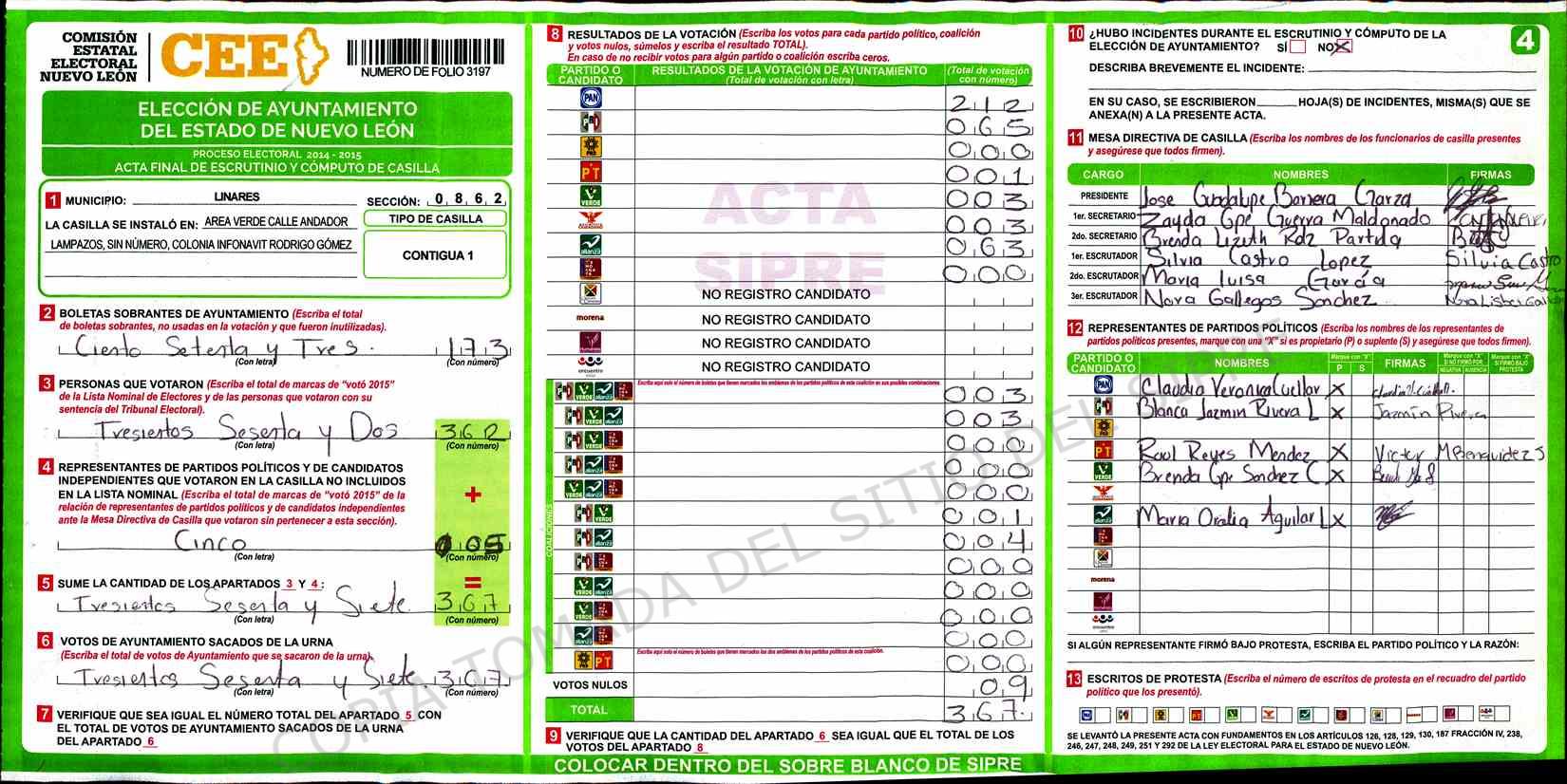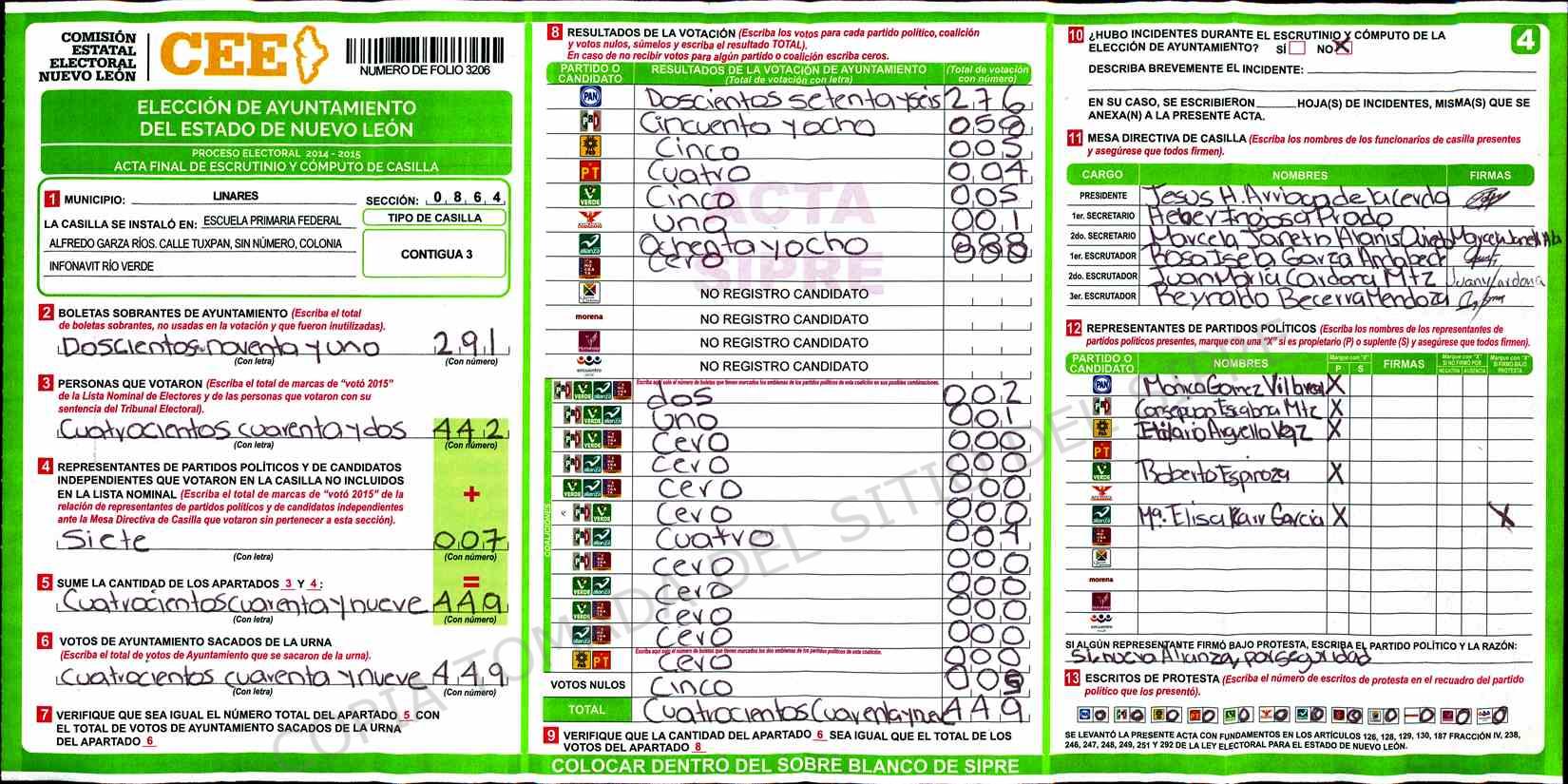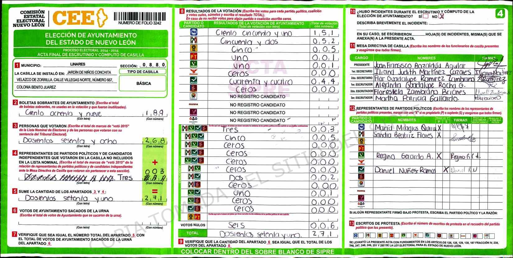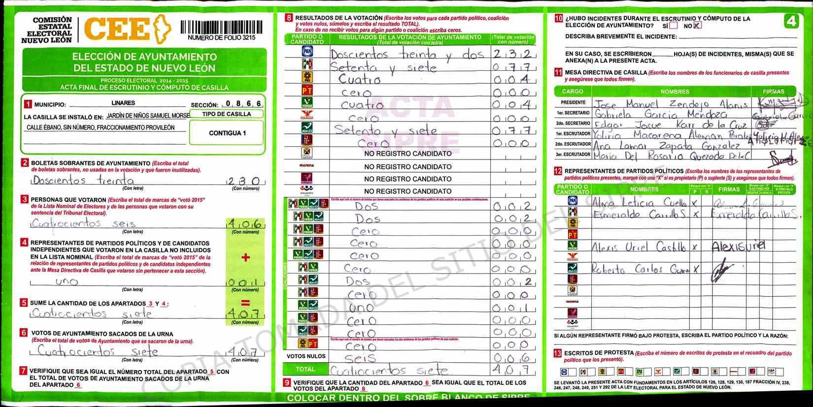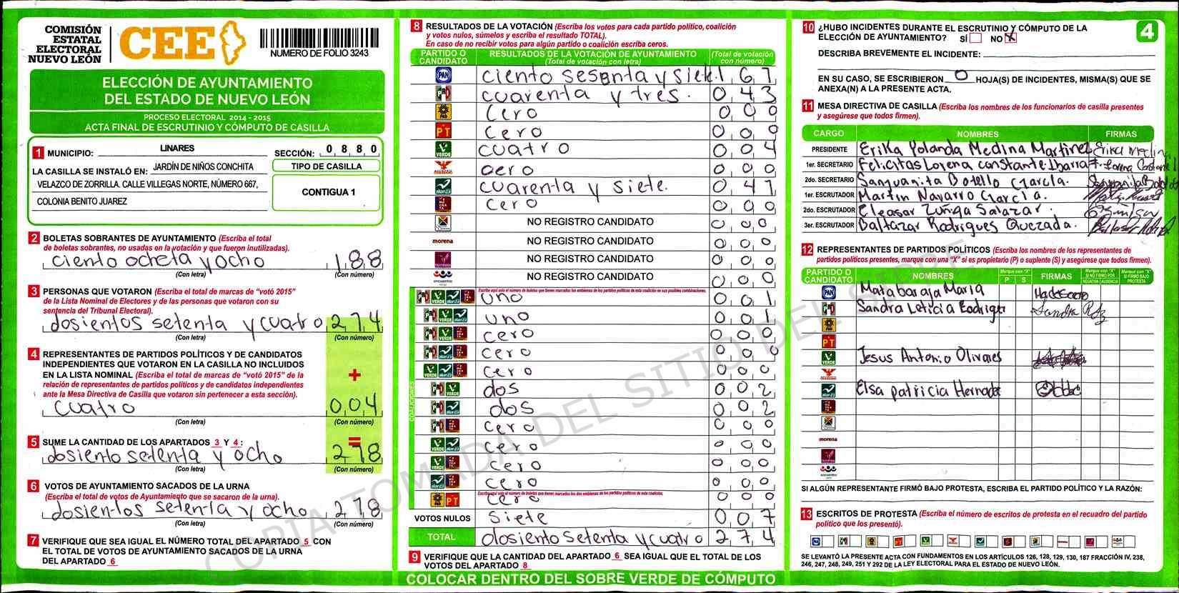 | Claves de Incidencia: | (1) Ilegible, (2) Mutilada, (3) Presenta Correcciones, (4) Presenta Borrones, (5) En Blanco, (6) Cifras Remarcadas, (7) Cifras de Mas, (8) Copiado Movido, (9) Con Signos Inválidos, (10) Excede Lista Nominal, (11) Otra |