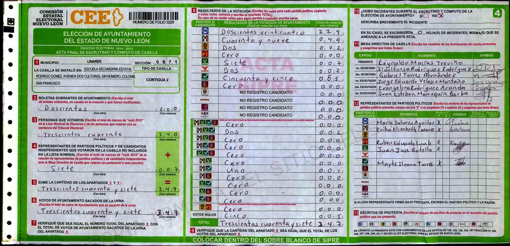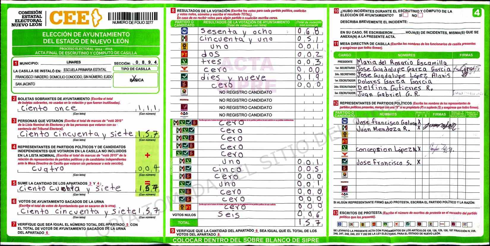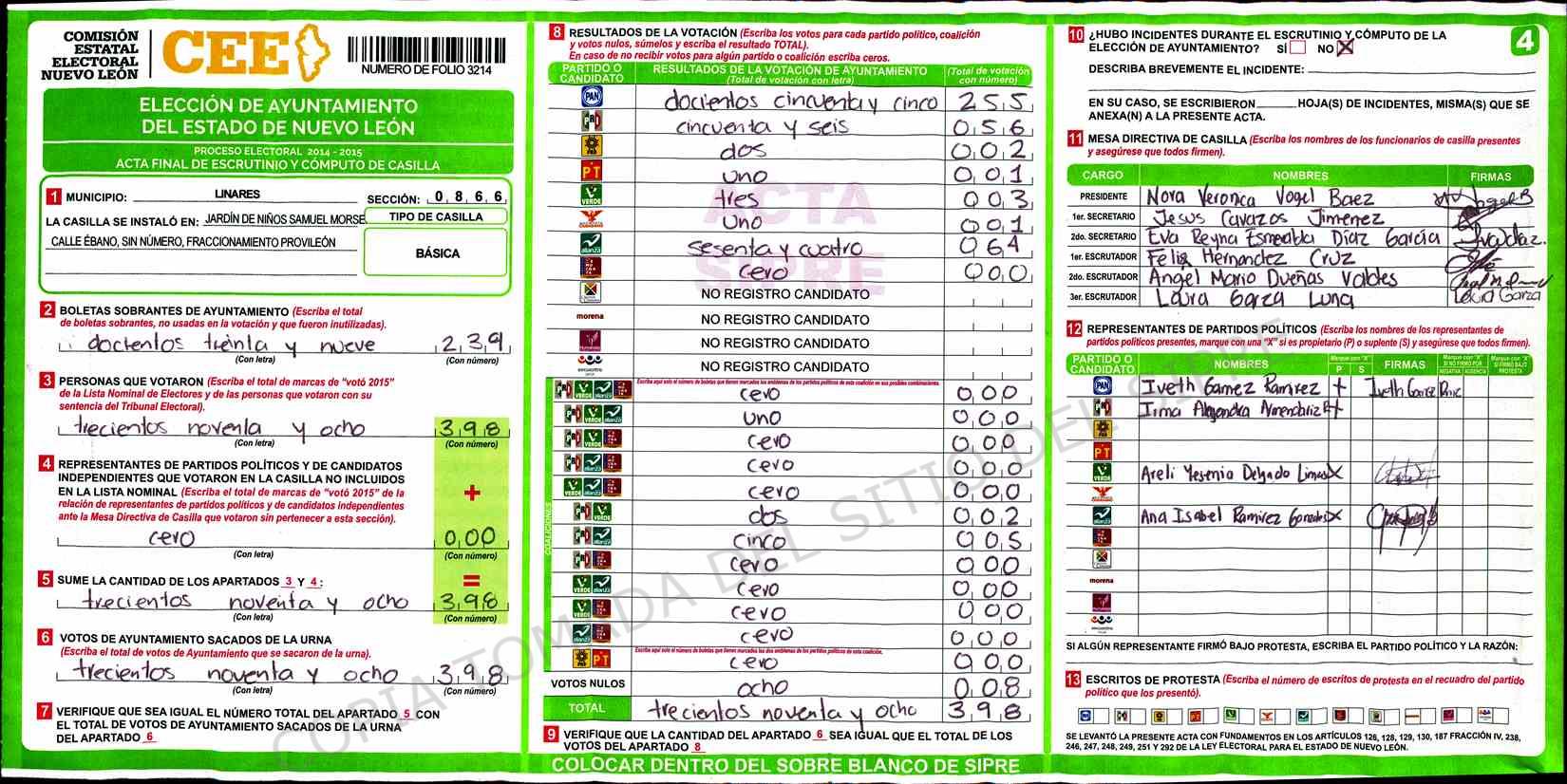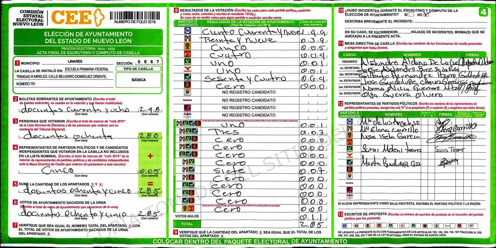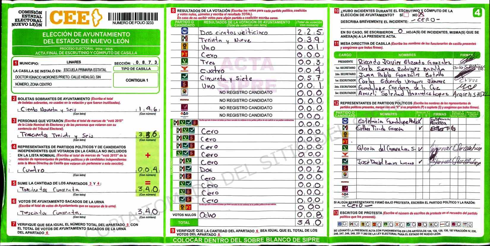 | Claves de Incidencia: | (1) Ilegible, (2) Mutilada, (3) Presenta Correcciones, (4) Presenta Borrones, (5) En Blanco, (6) Cifras Remarcadas, (7) Cifras de Mas, (8) Copiado Movido, (9) Con Signos Inválidos, (10) Excede Lista Nominal, (11) Otra |
