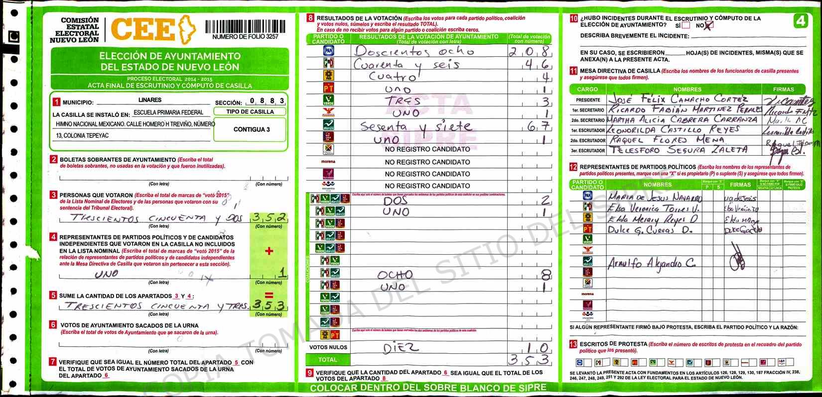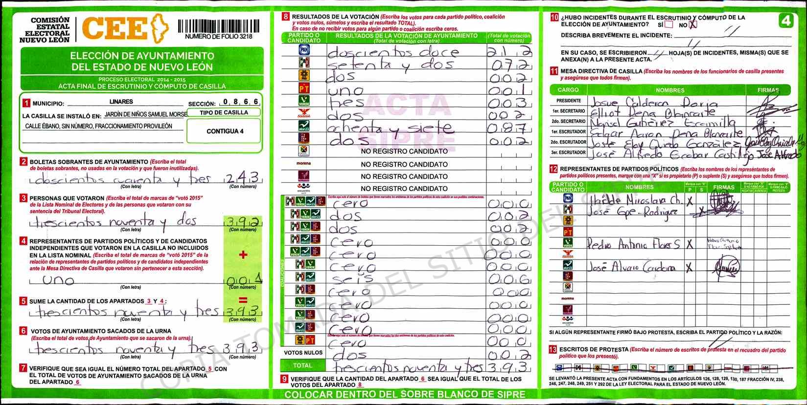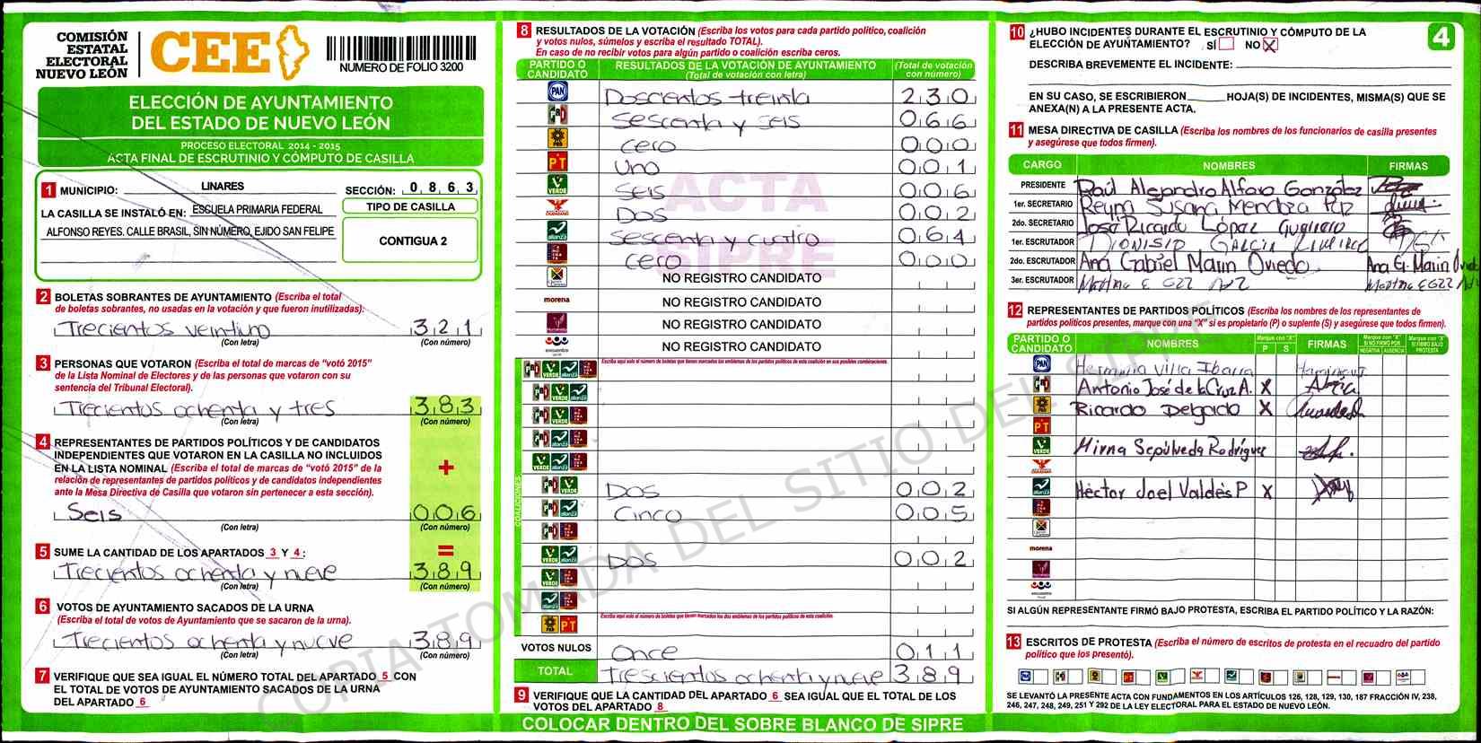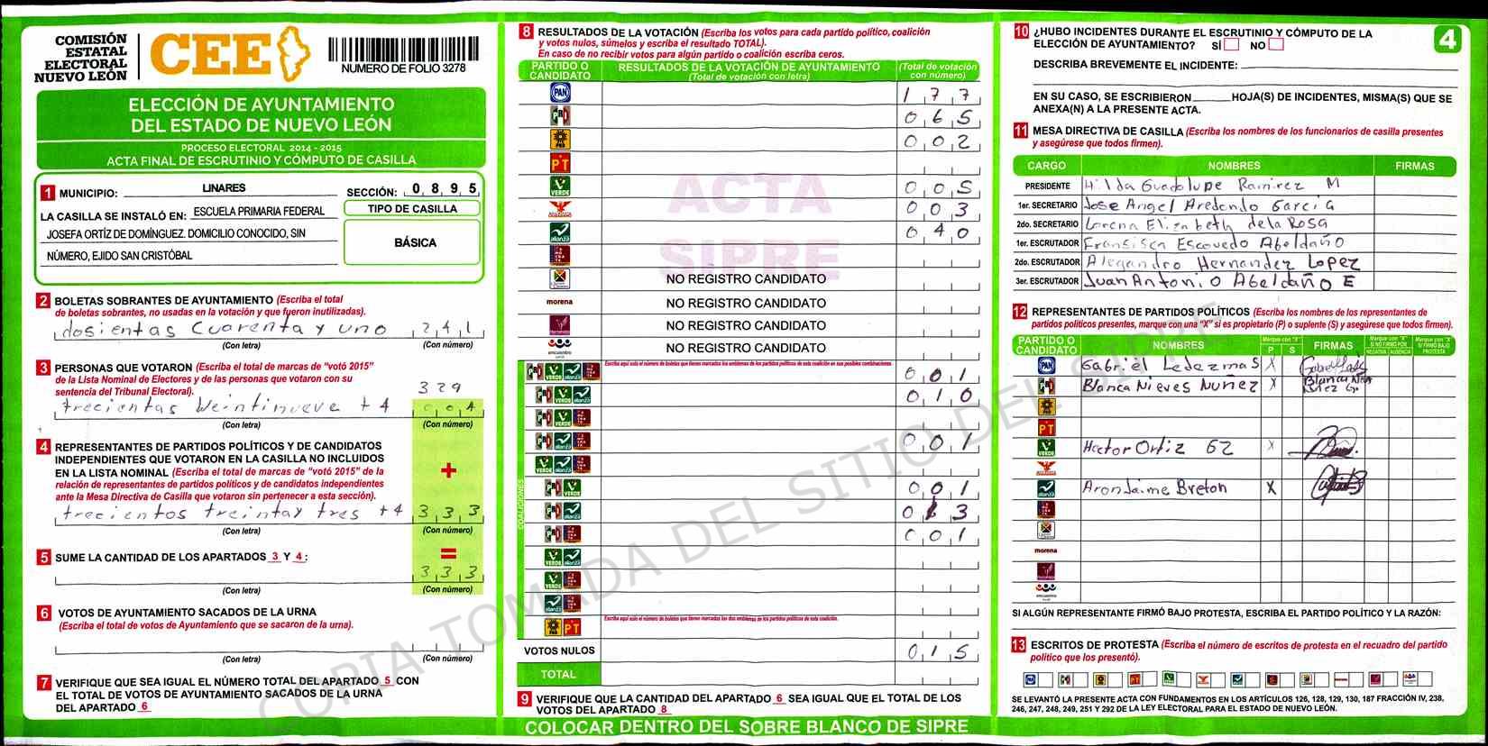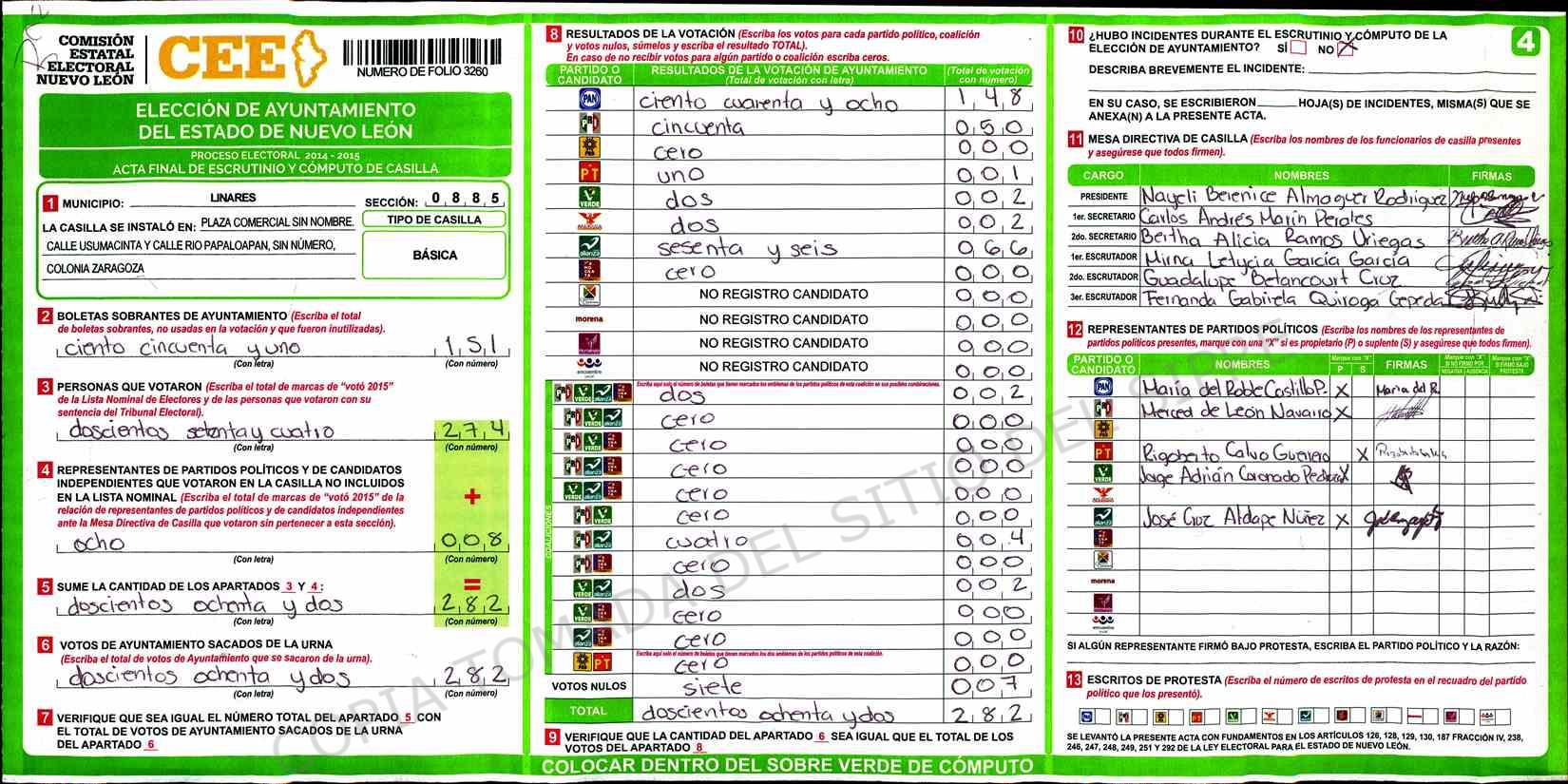 | Claves de Incidencia: | (1) Ilegible, (2) Mutilada, (3) Presenta Correcciones, (4) Presenta Borrones, (5) En Blanco, (6) Cifras Remarcadas, (7) Cifras de Mas, (8) Copiado Movido, (9) Con Signos Inválidos, (10) Excede Lista Nominal, (11) Otra |