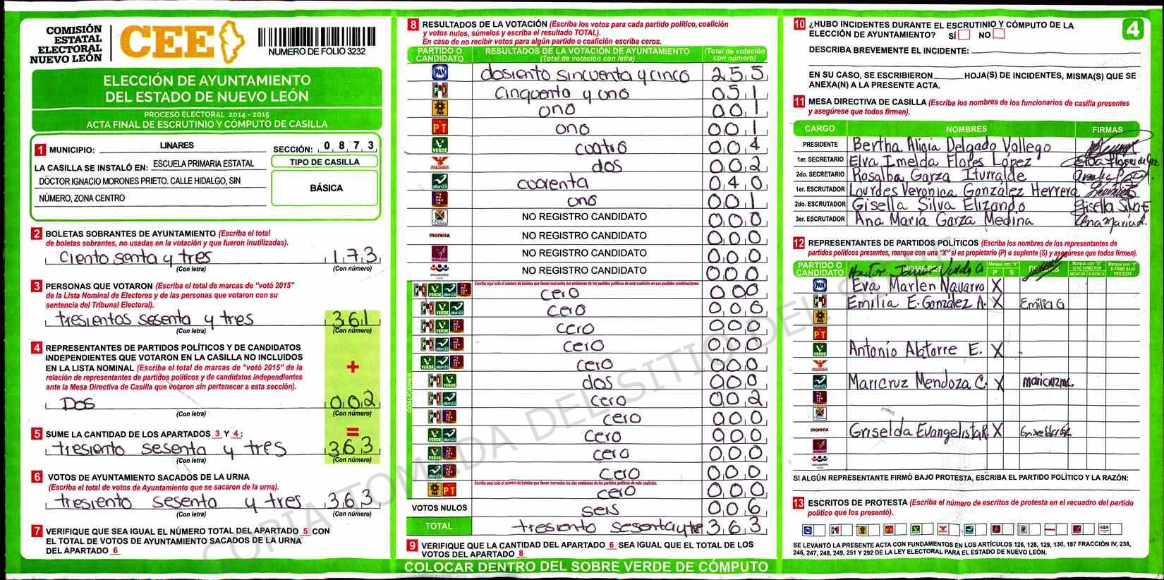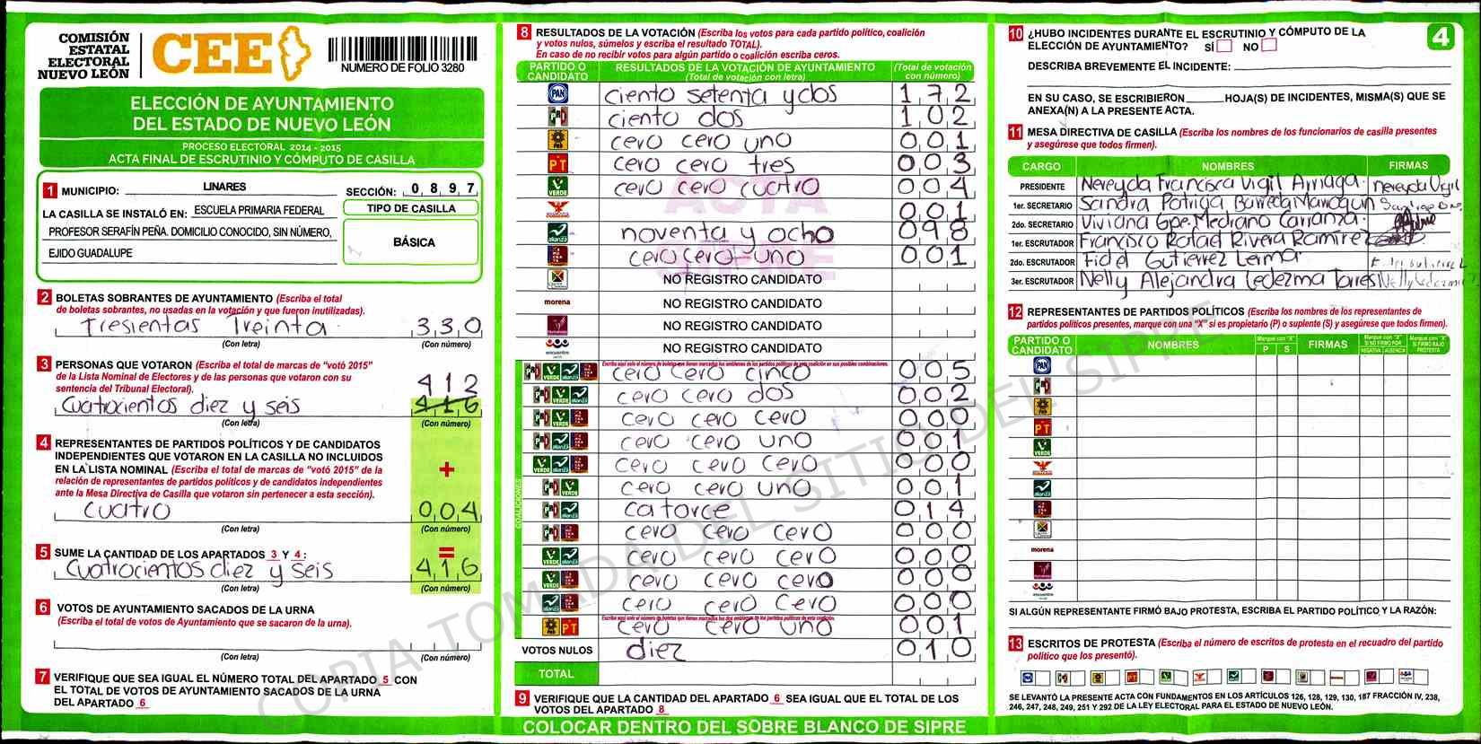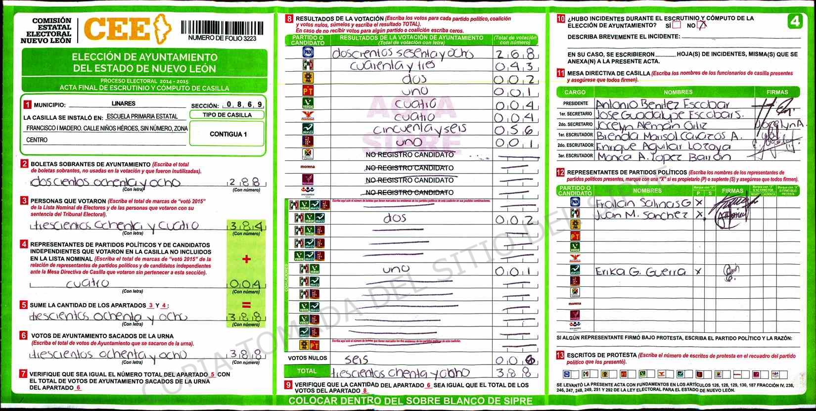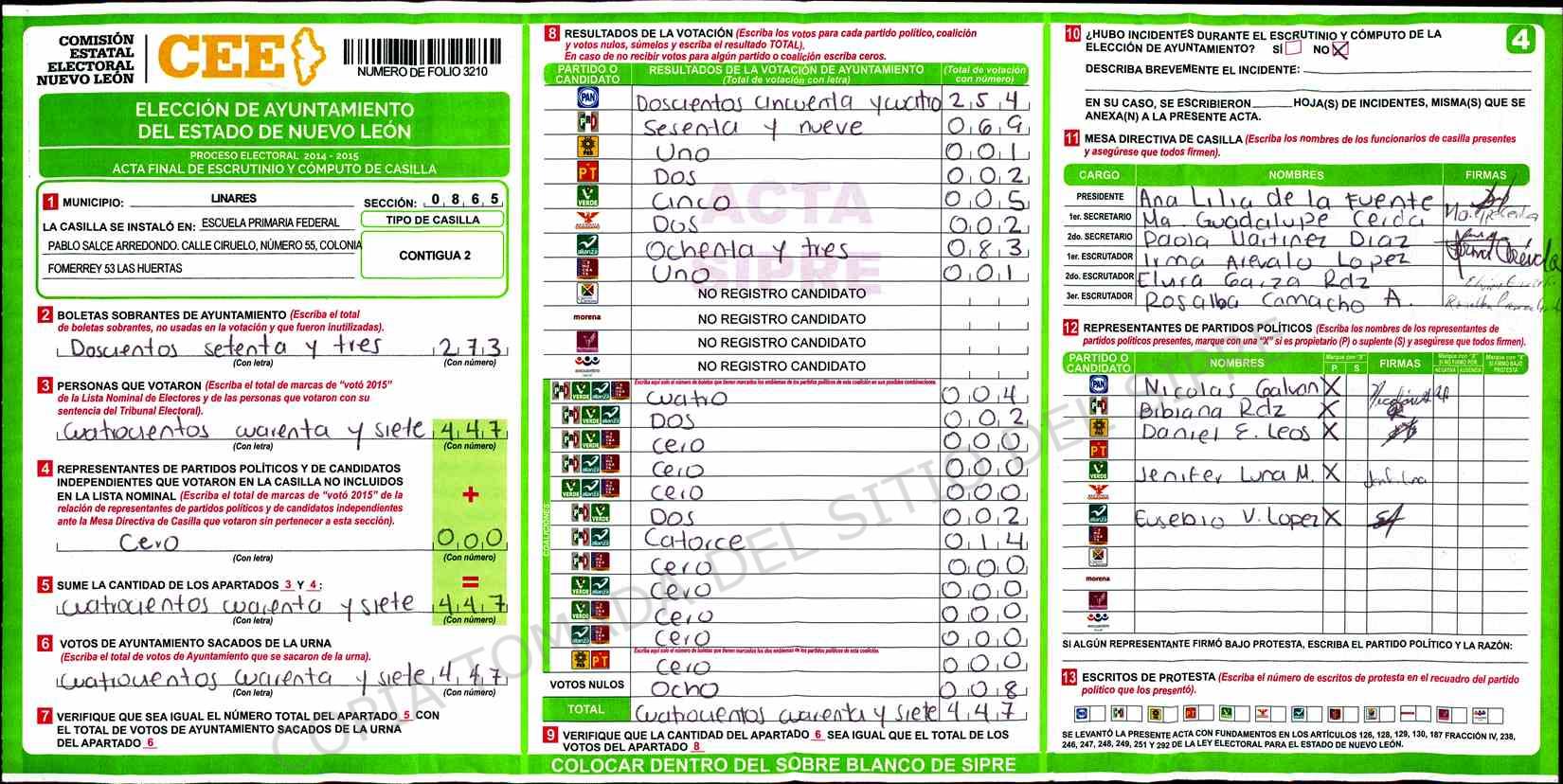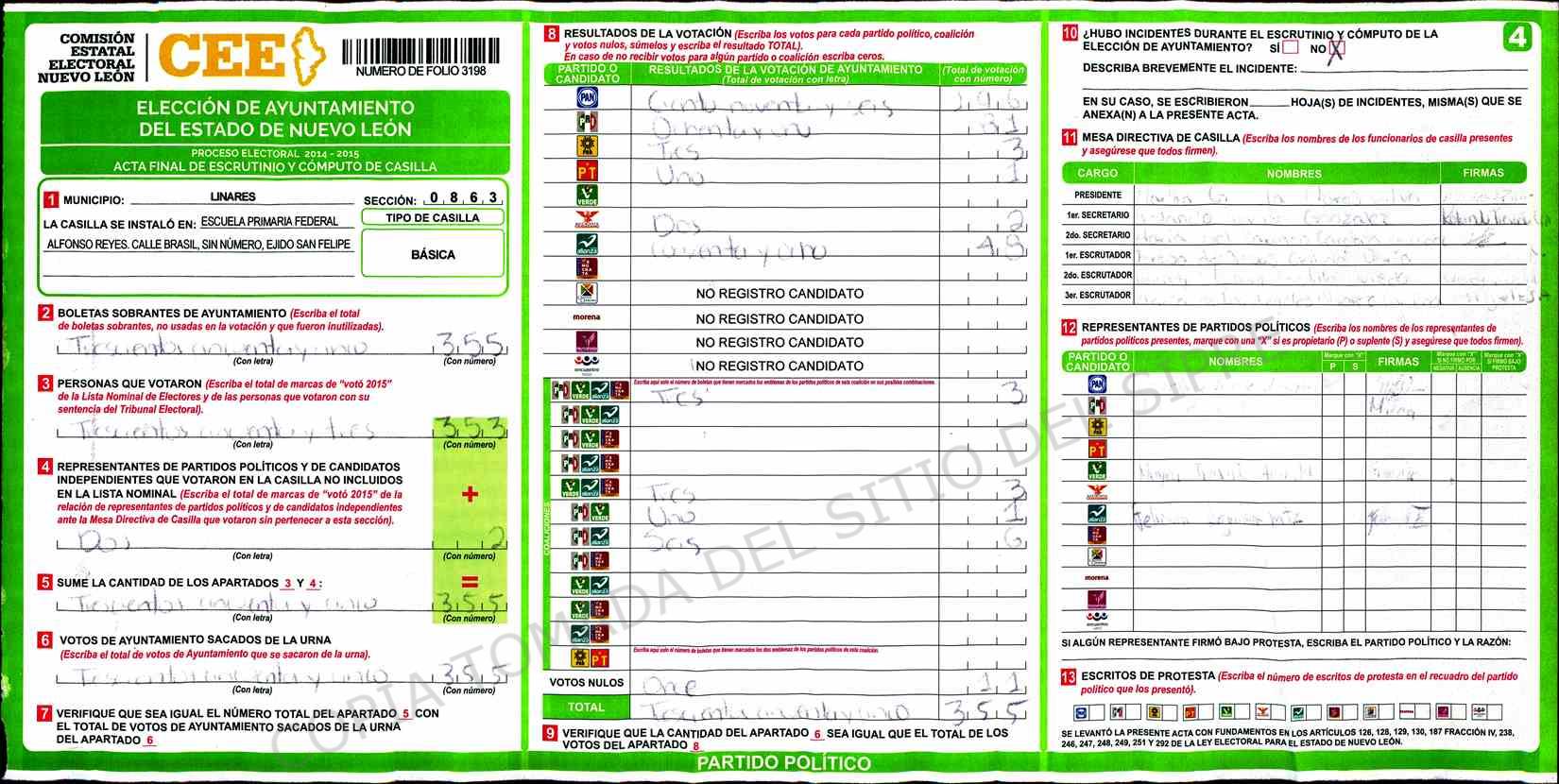 | Claves de Incidencia: | (1) Ilegible, (2) Mutilada, (3) Presenta Correcciones, (4) Presenta Borrones, (5) En Blanco, (6) Cifras Remarcadas, (7) Cifras de Mas, (8) Copiado Movido, (9) Con Signos Inválidos, (10) Excede Lista Nominal, (11) Otra |