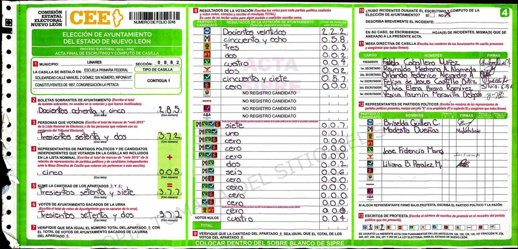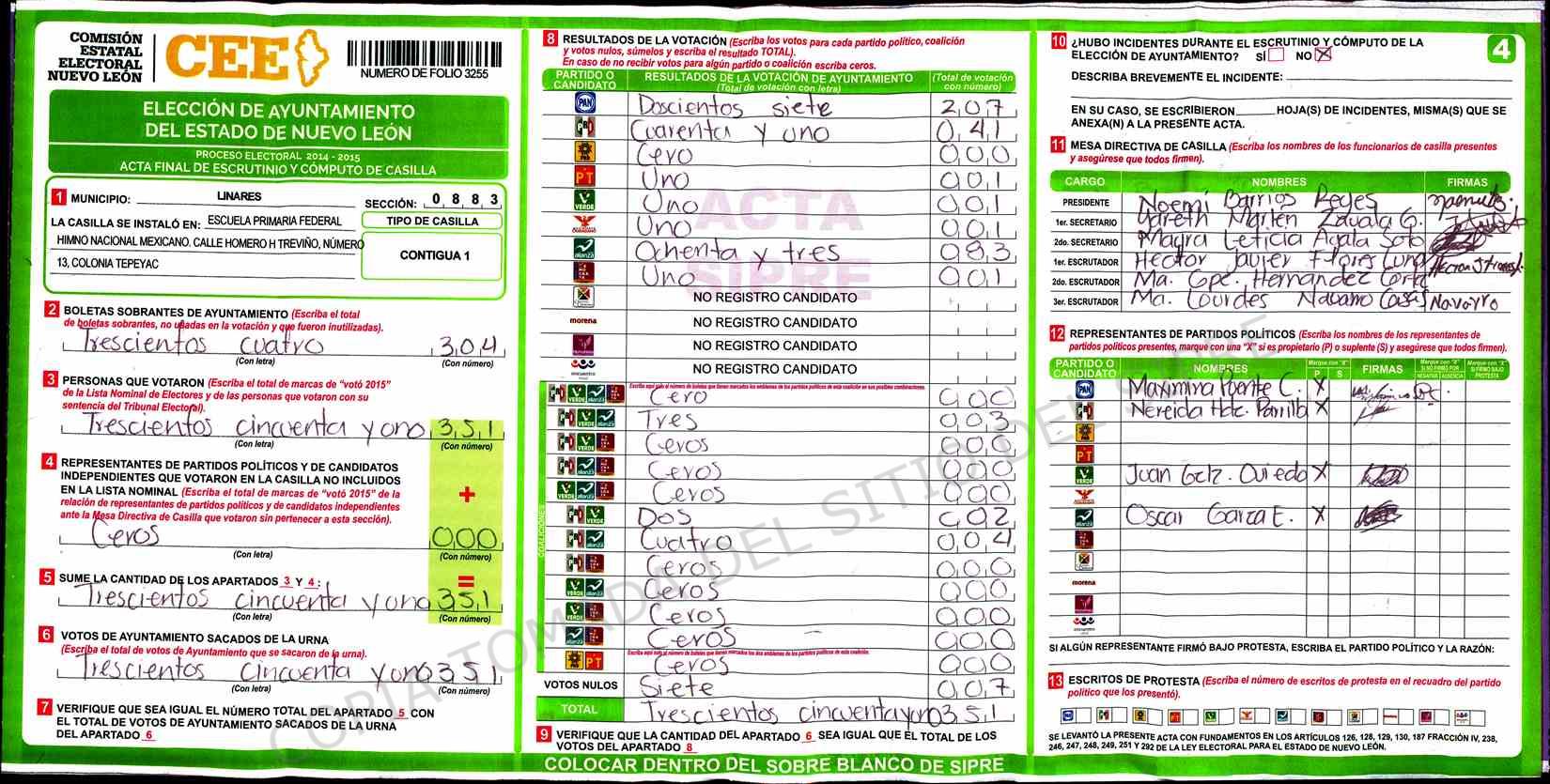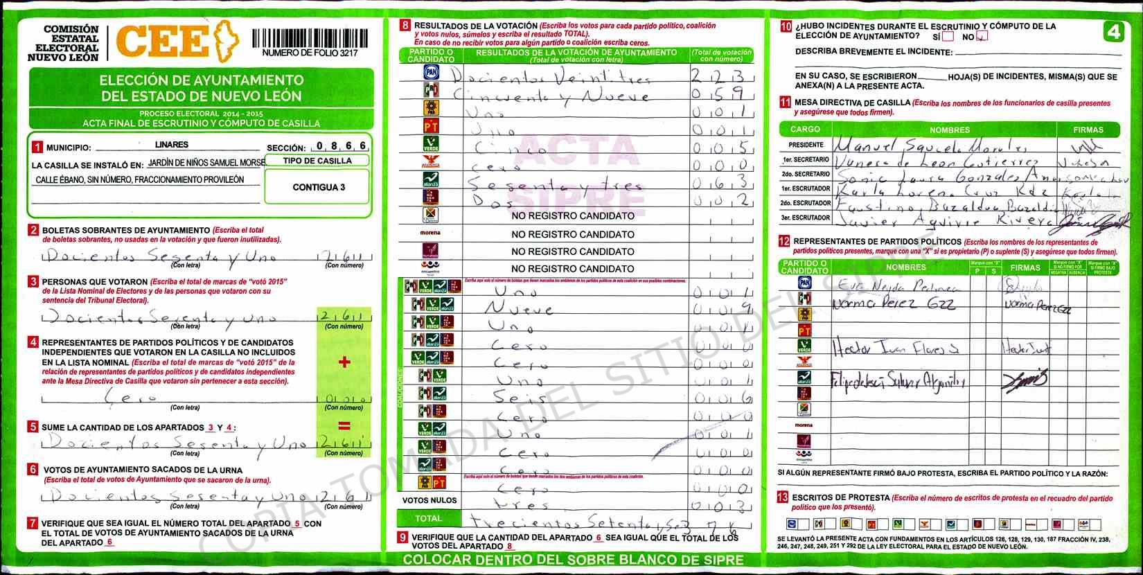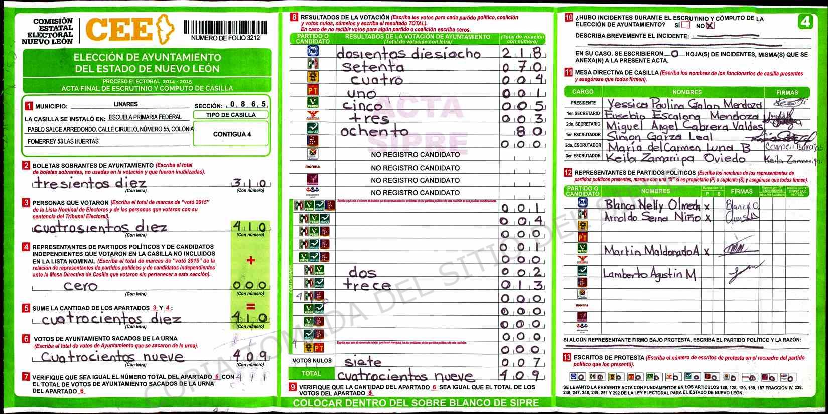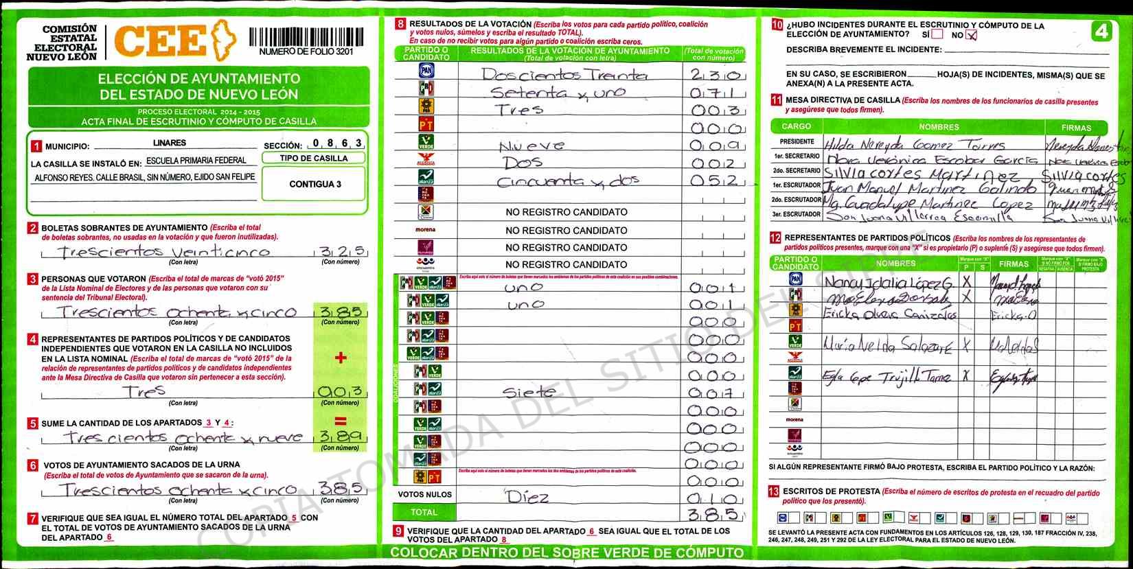 | Claves de Incidencia: | (1) Ilegible, (2) Mutilada, (3) Presenta Correcciones, (4) Presenta Borrones, (5) En Blanco, (6) Cifras Remarcadas, (7) Cifras de Mas, (8) Copiado Movido, (9) Con Signos Inválidos, (10) Excede Lista Nominal, (11) Otra |