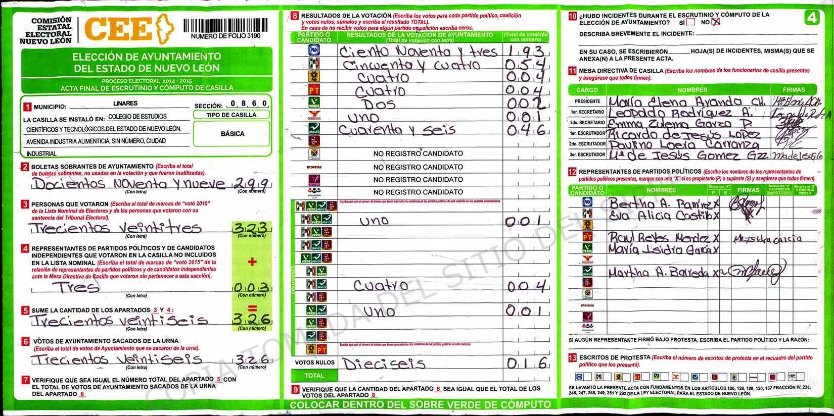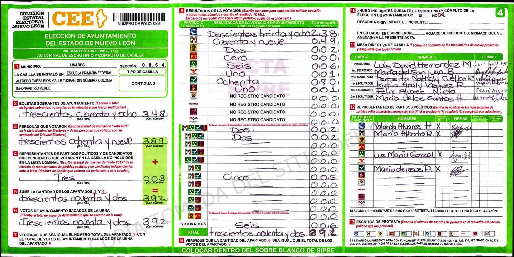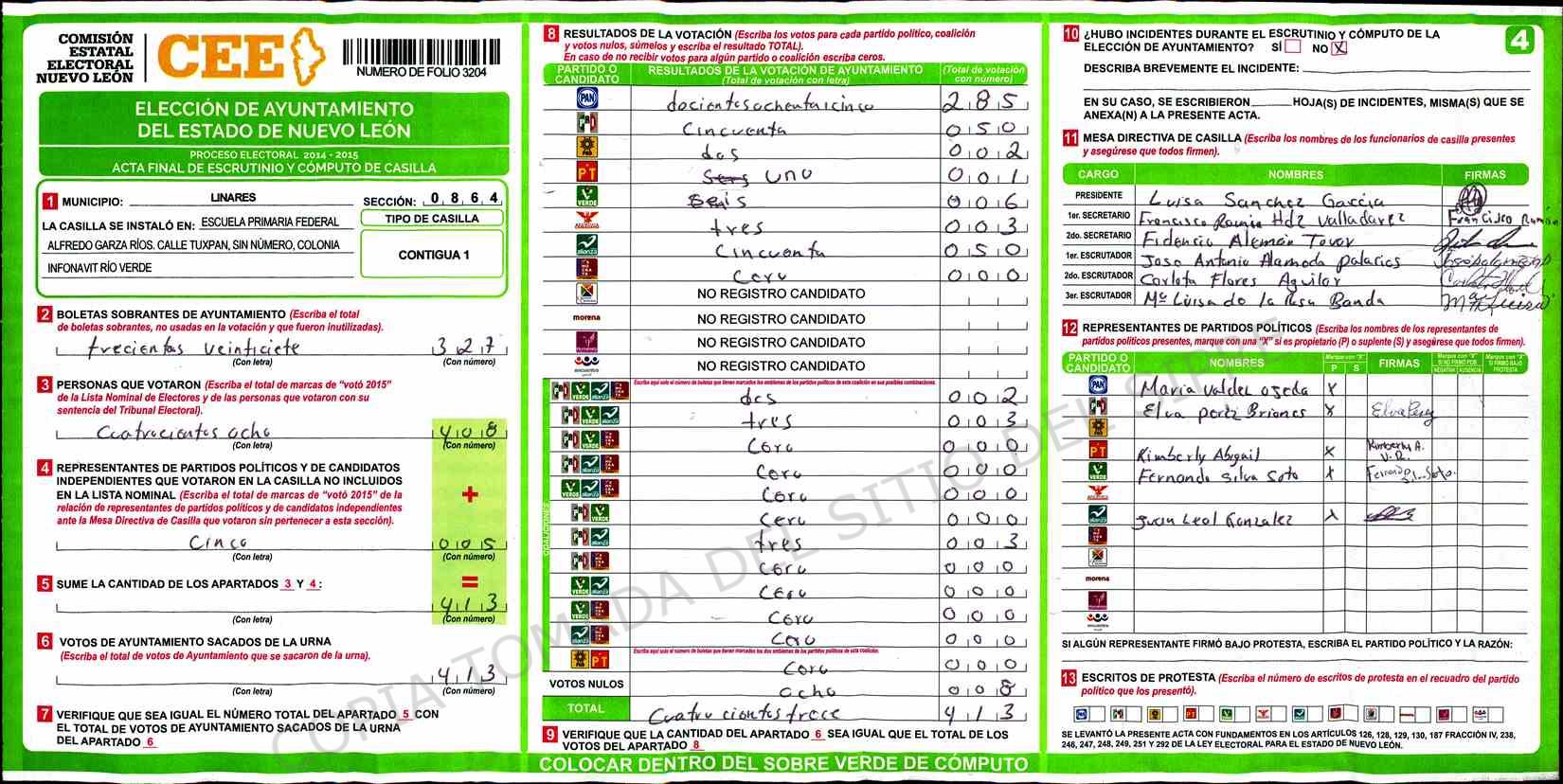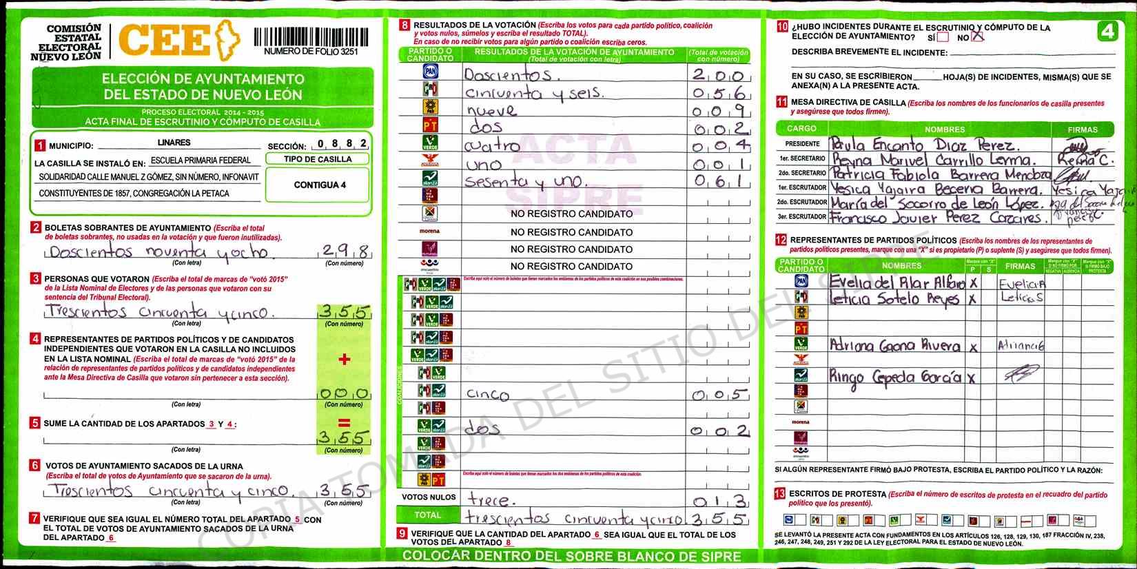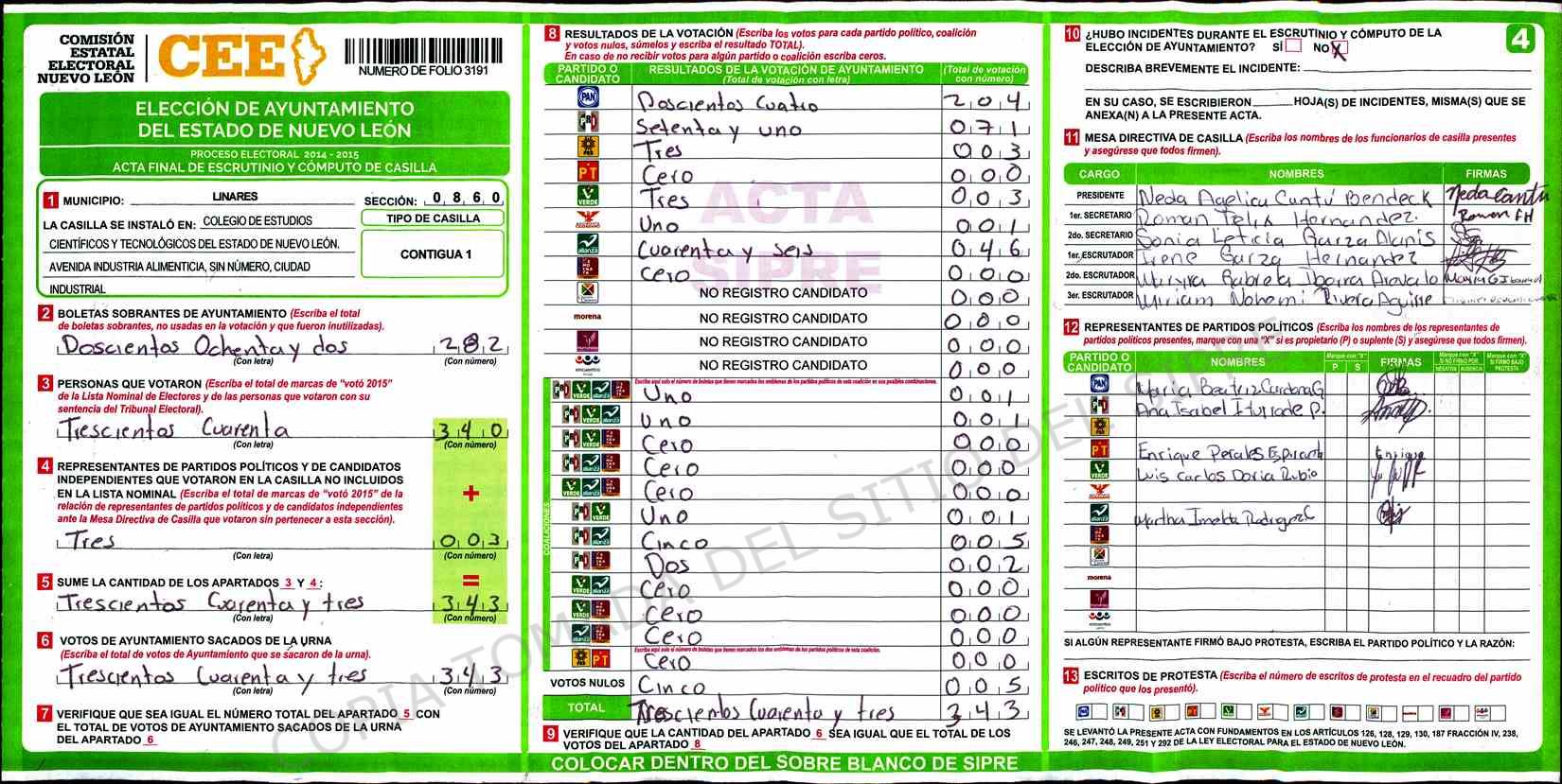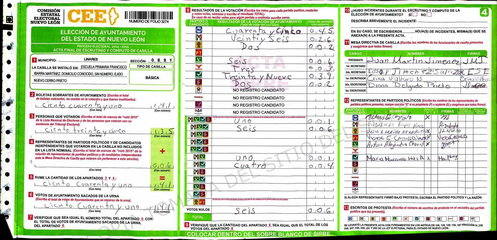 | Claves de Incidencia: | (1) Ilegible, (2) Mutilada, (3) Presenta Correcciones, (4) Presenta Borrones, (5) En Blanco, (6) Cifras Remarcadas, (7) Cifras de Mas, (8) Copiado Movido, (9) Con Signos Inválidos, (10) Excede Lista Nominal, (11) Otra |