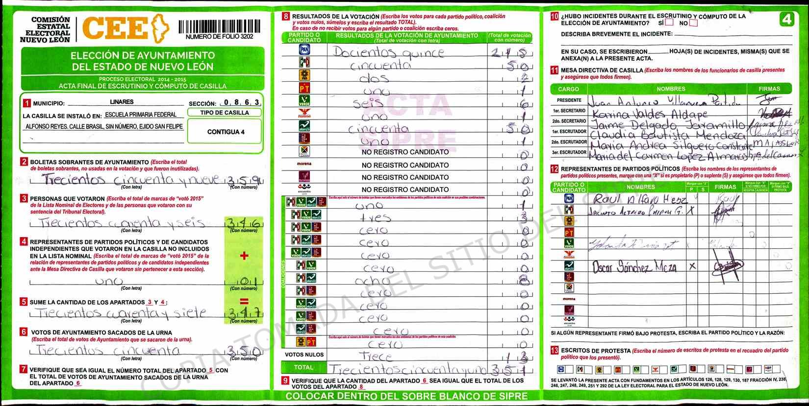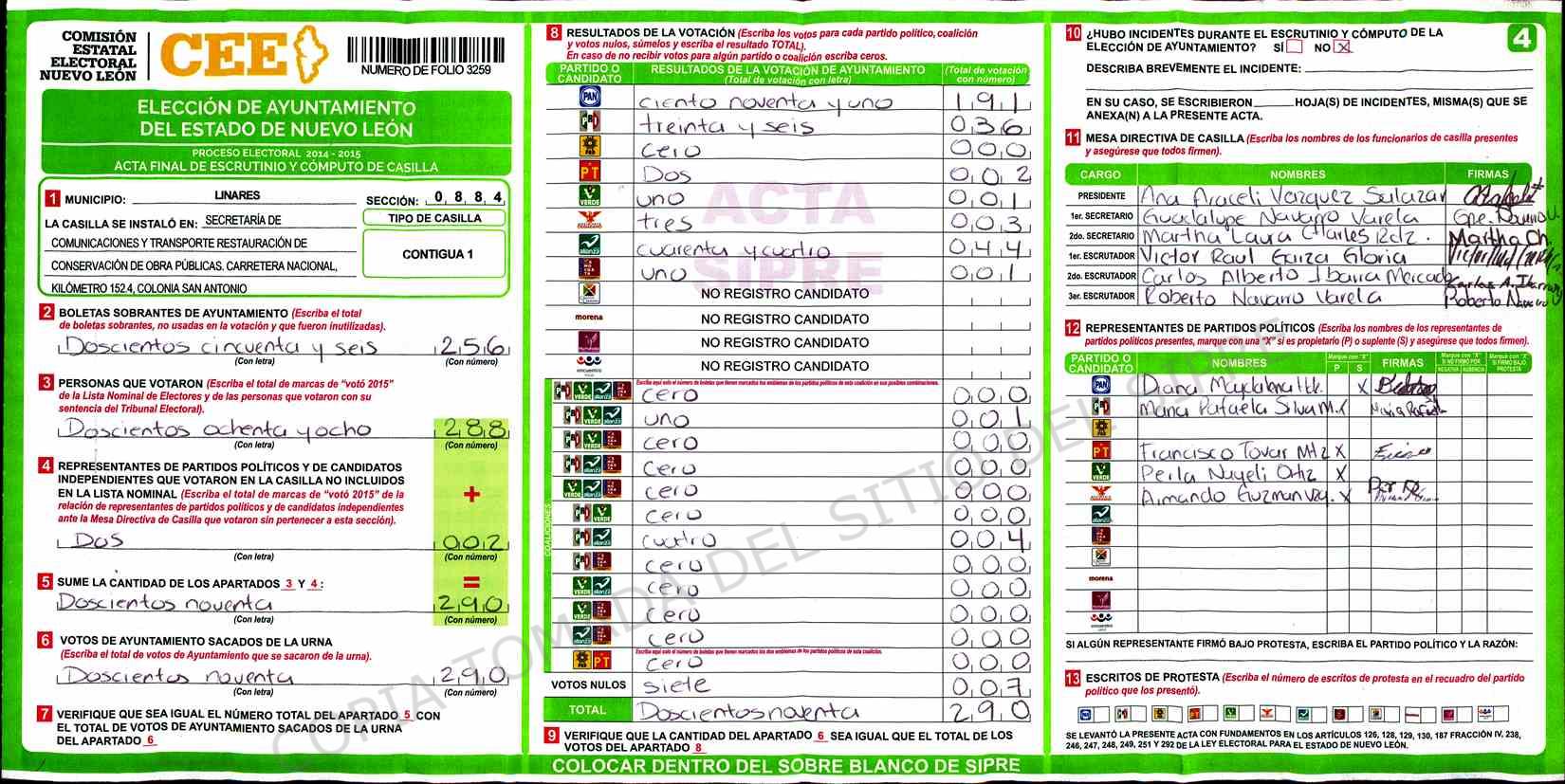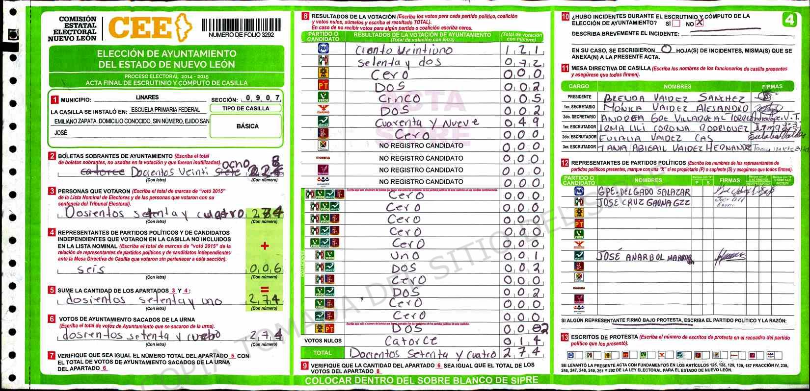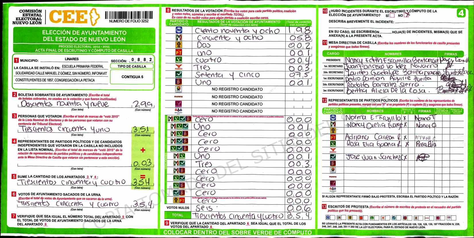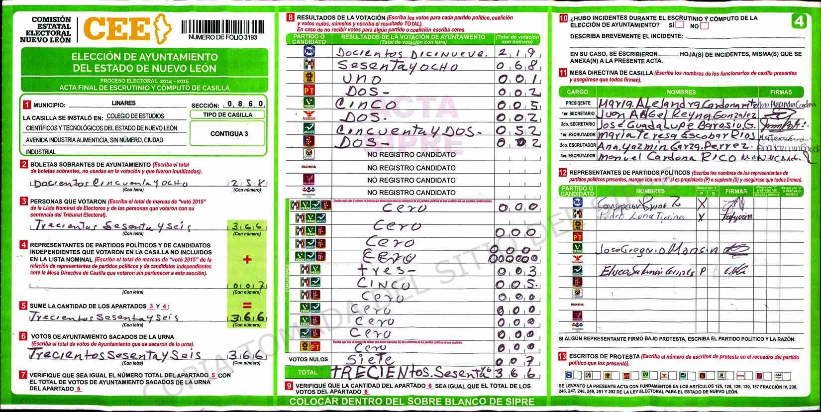 | Claves de Incidencia: | (1) Ilegible, (2) Mutilada, (3) Presenta Correcciones, (4) Presenta Borrones, (5) En Blanco, (6) Cifras Remarcadas, (7) Cifras de Mas, (8) Copiado Movido, (9) Con Signos Inválidos, (10) Excede Lista Nominal, (11) Otra |