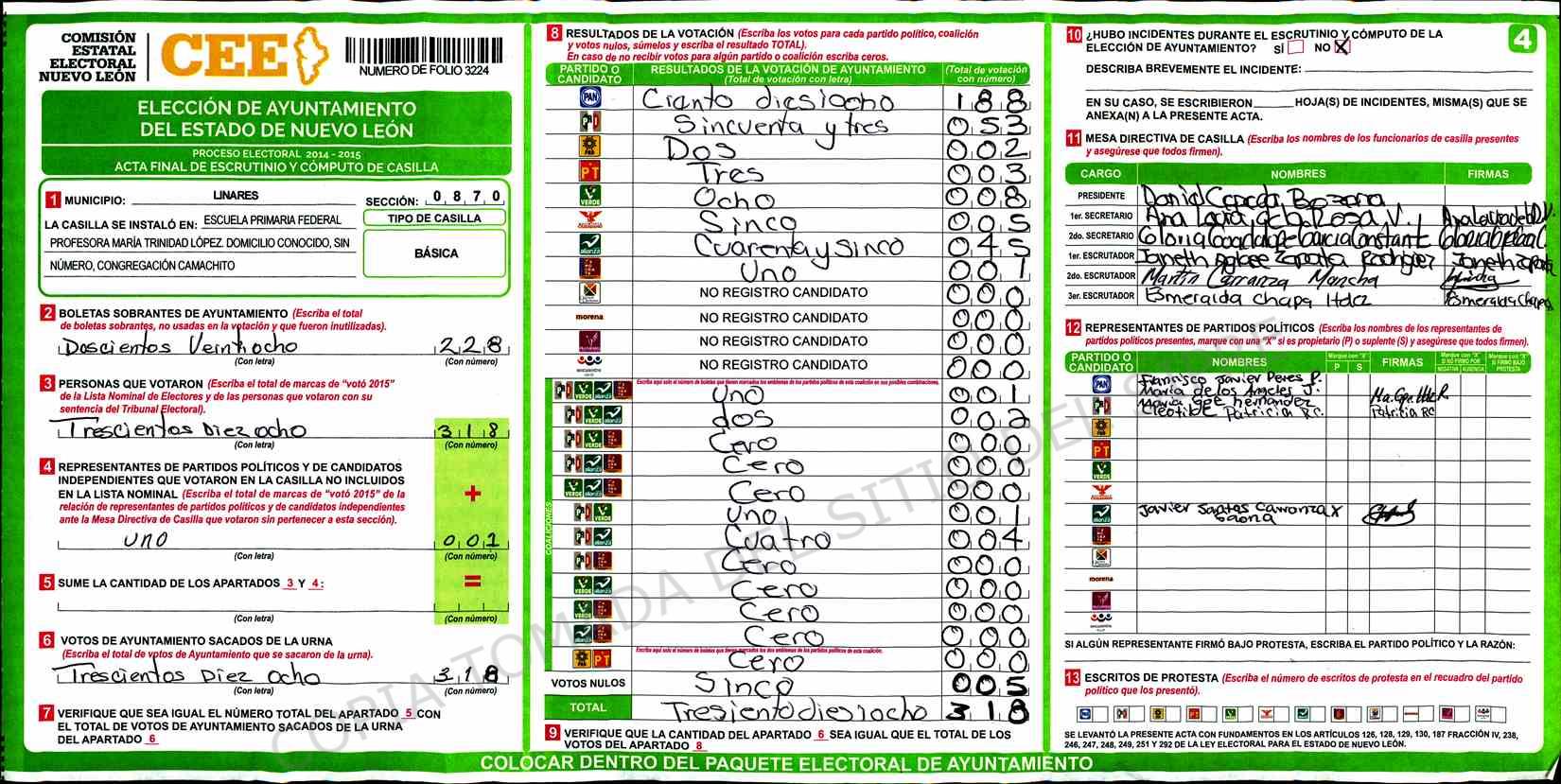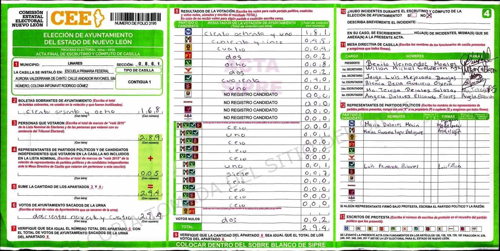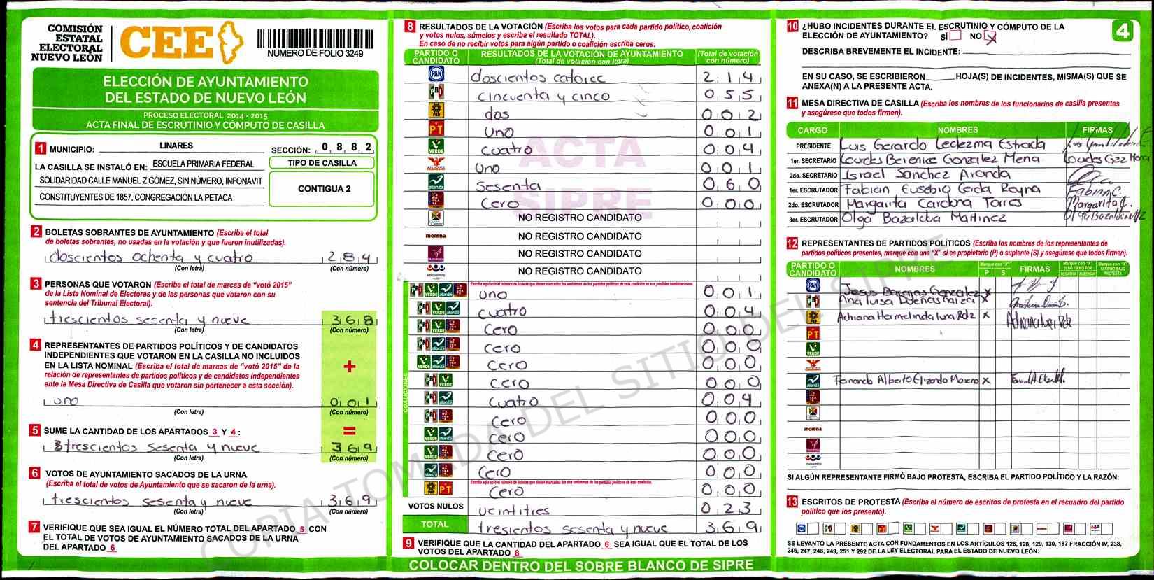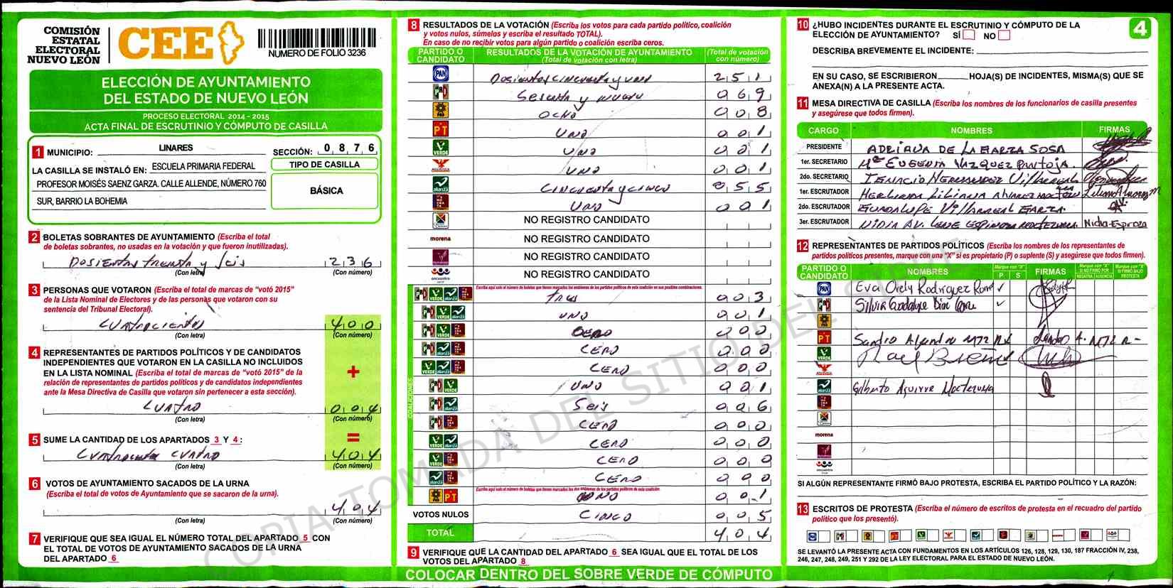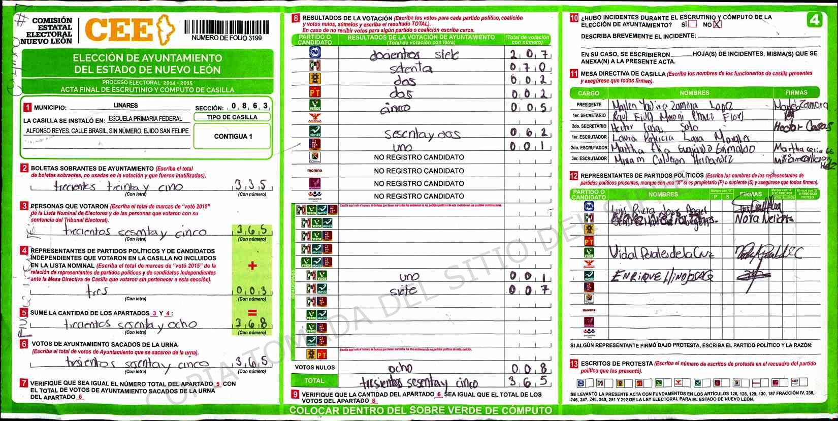| Claves de Incidencia: | (1) Ilegible, (2) Mutilada, (3) Presenta Correcciones, (4) Presenta Borrones, (5) En Blanco, (6) Cifras Remarcadas, (7) Cifras de Mas, (8) Copiado Movido, (9) Con Signos Inválidos, (10) Excede Lista Nominal, (11) Otra |