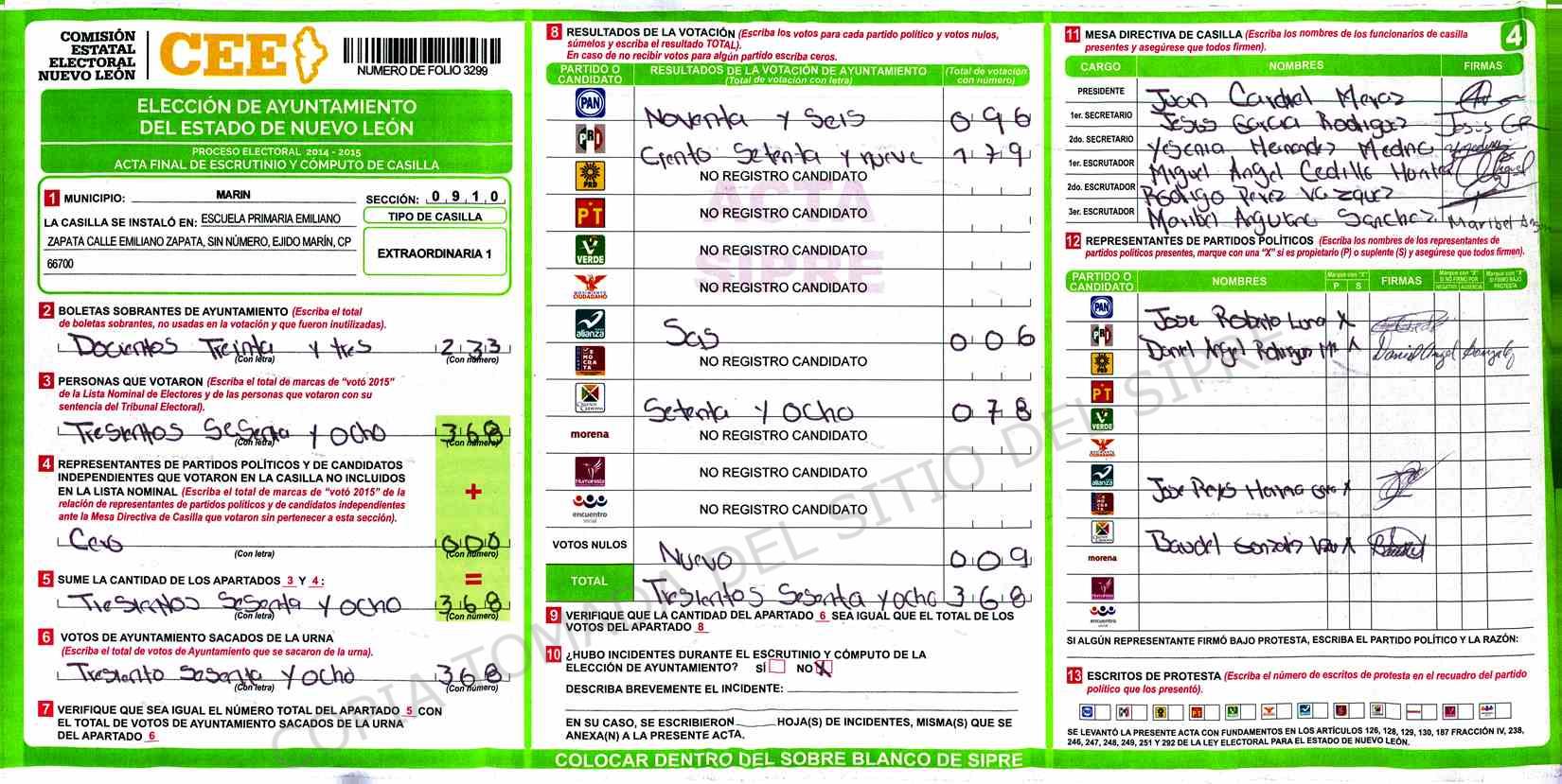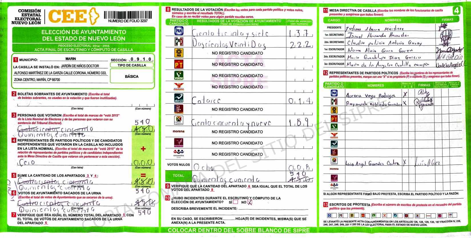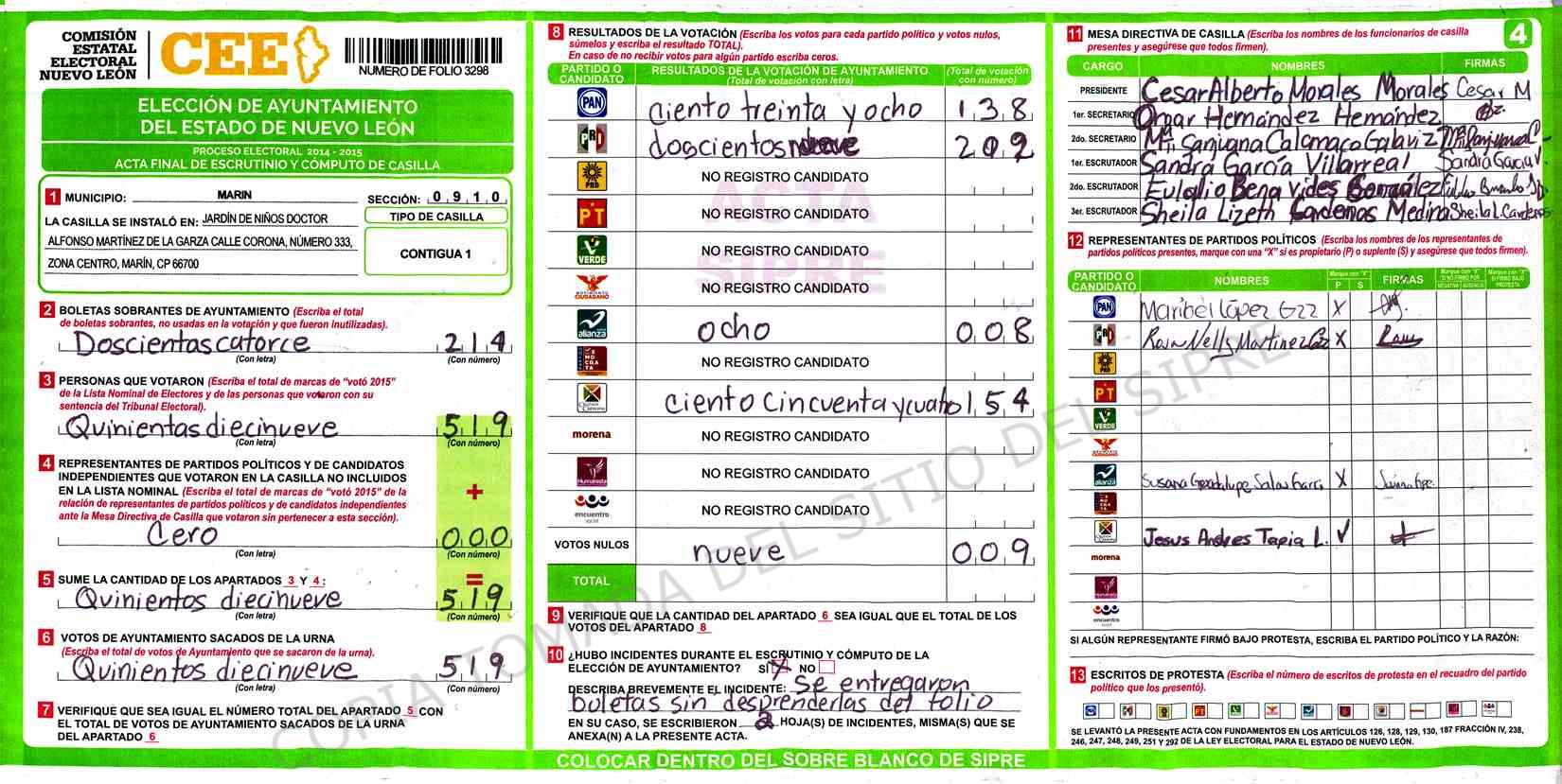 | Claves de Incidencia: | (1) Ilegible, (2) Mutilada, (3) Presenta Correcciones, (4) Presenta Borrones, (5) En Blanco, (6) Cifras Remarcadas, (7) Cifras de Mas, (8) Copiado Movido, (9) Con Signos Inválidos, (10) Excede Lista Nominal, (11) Otra |