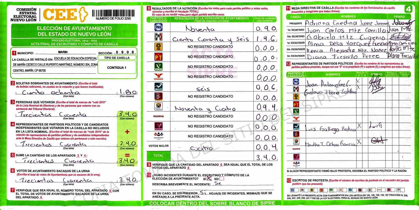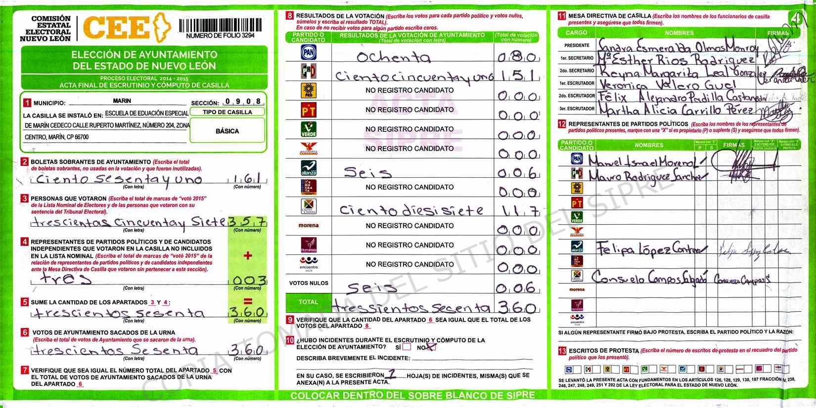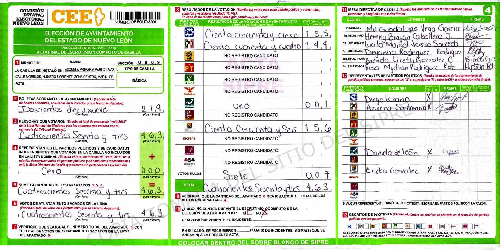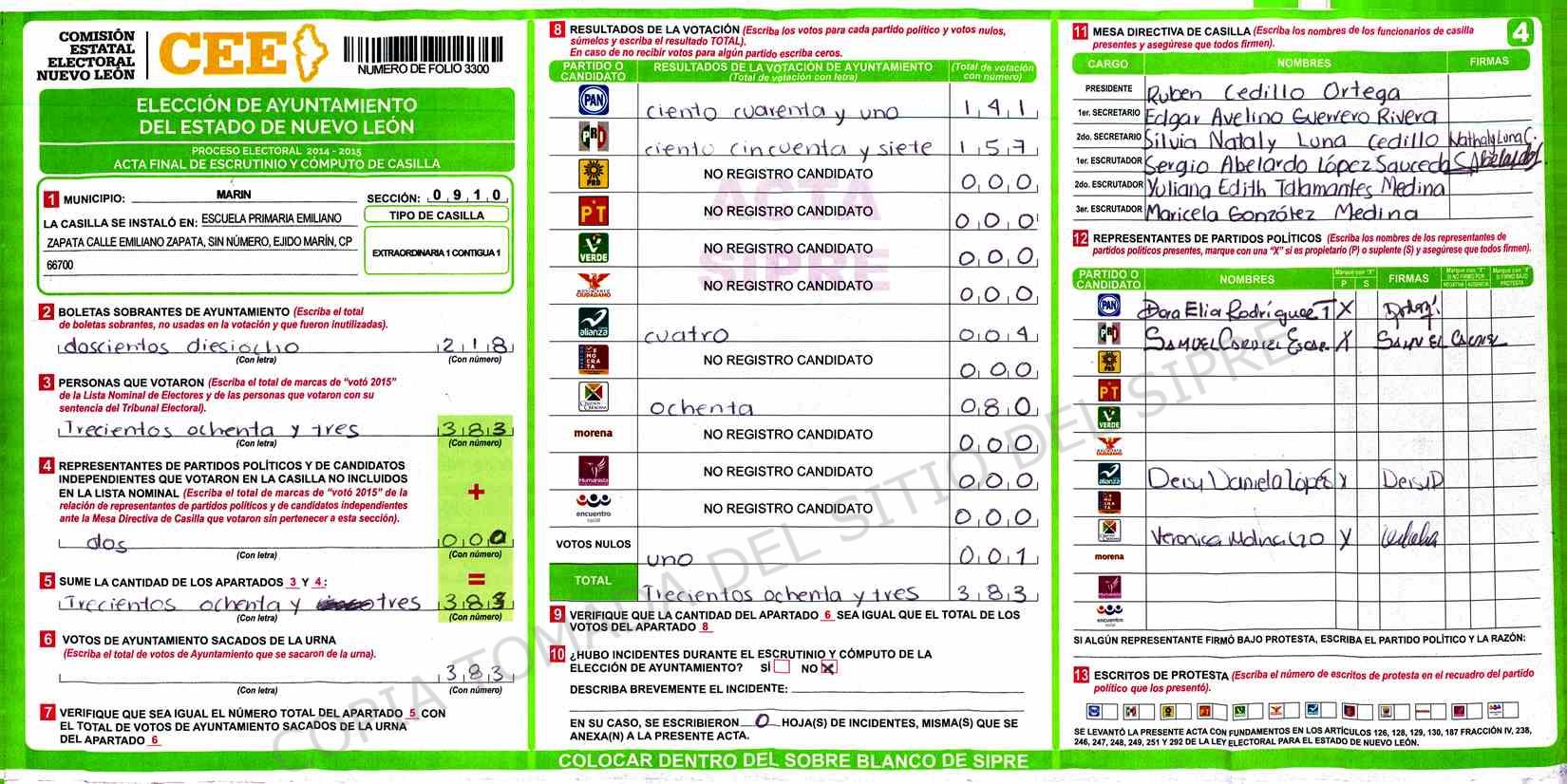 | Claves de Incidencia: | (1) Ilegible, (2) Mutilada, (3) Presenta Correcciones, (4) Presenta Borrones, (5) En Blanco, (6) Cifras Remarcadas, (7) Cifras de Mas, (8) Copiado Movido, (9) Con Signos Inválidos, (10) Excede Lista Nominal, (11) Otra |