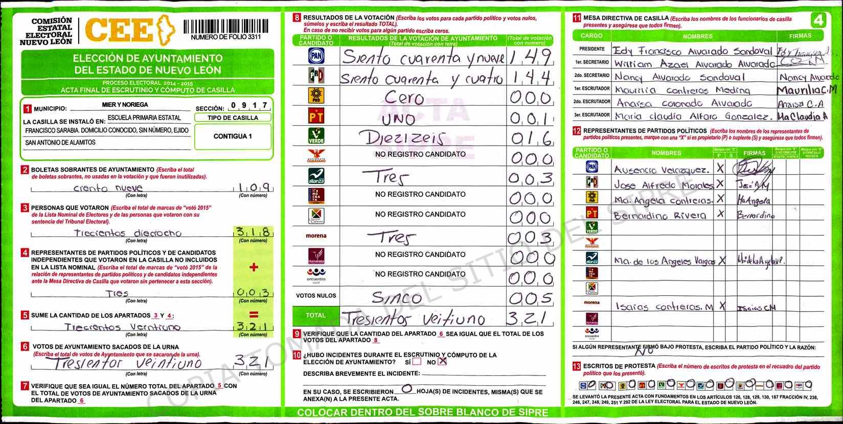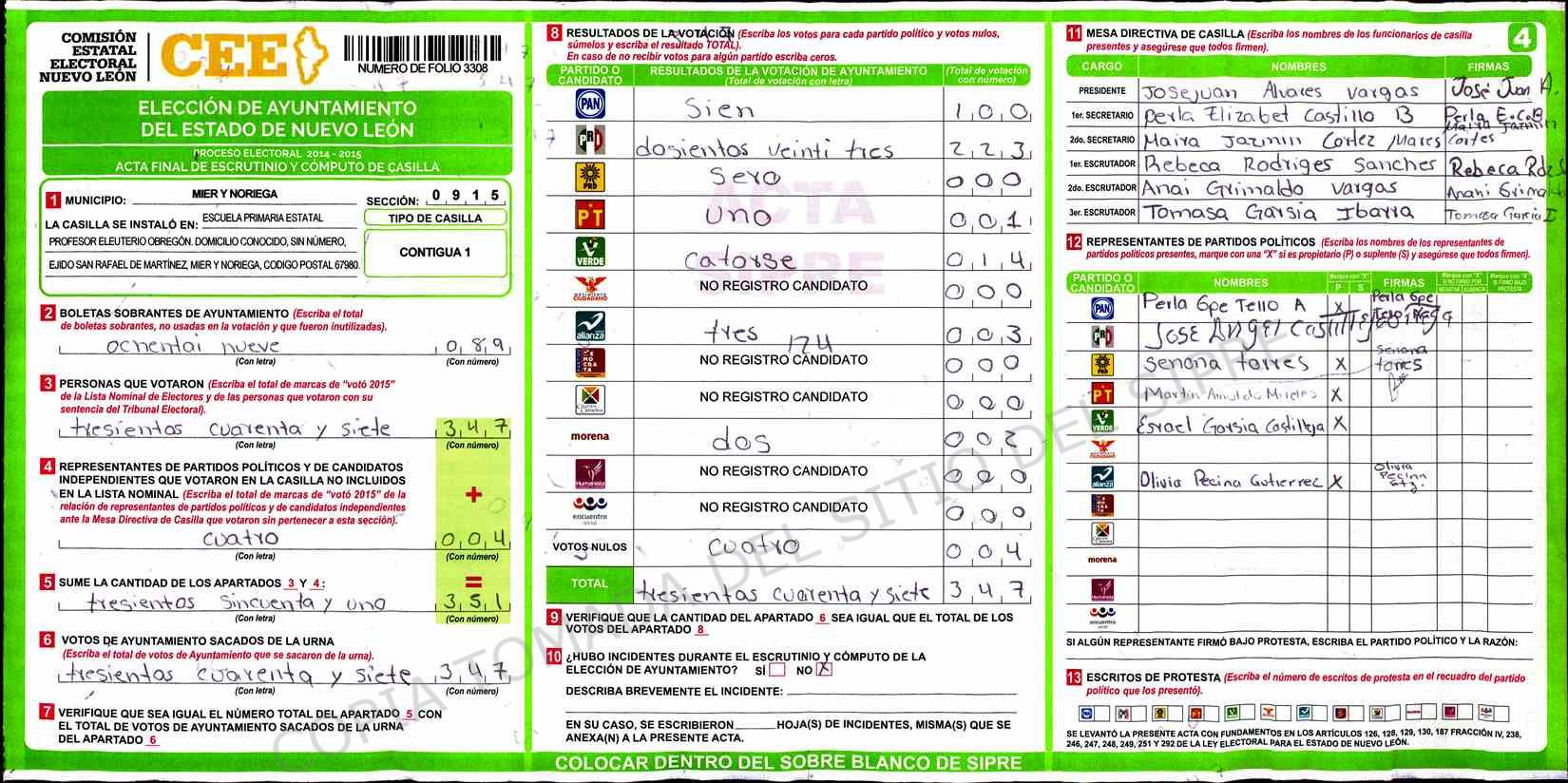 | Claves de Incidencia: | (1) Ilegible, (2) Mutilada, (3) Presenta Correcciones, (4) Presenta Borrones, (5) En Blanco, (6) Cifras Remarcadas, (7) Cifras de Mas, (8) Copiado Movido, (9) Con Signos Inválidos, (10) Excede Lista Nominal, (11) Otra |