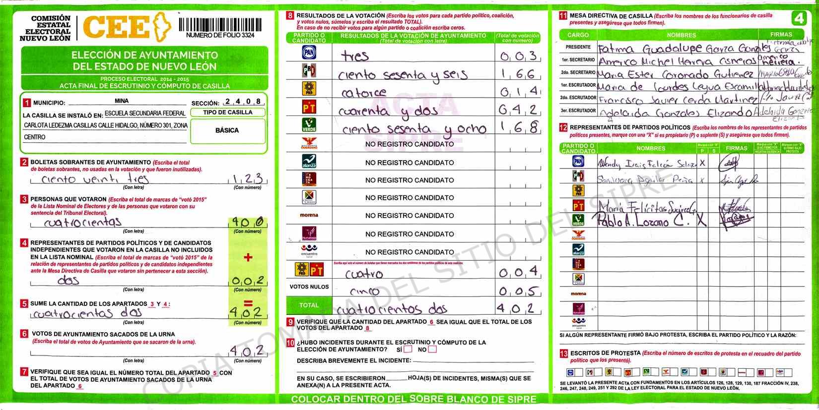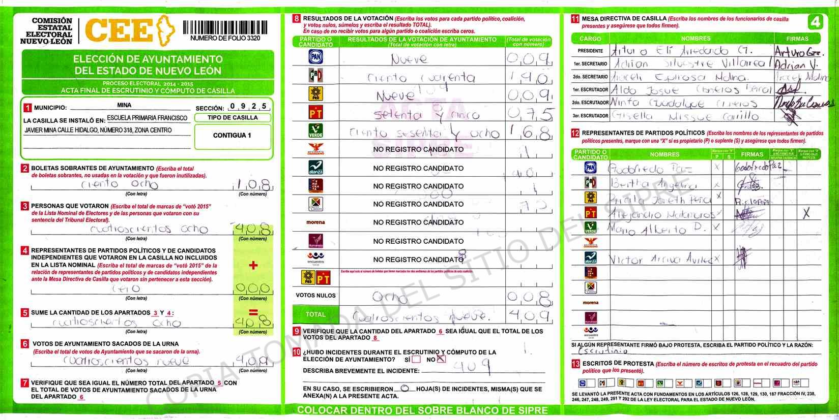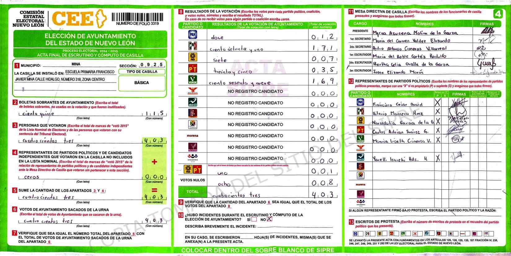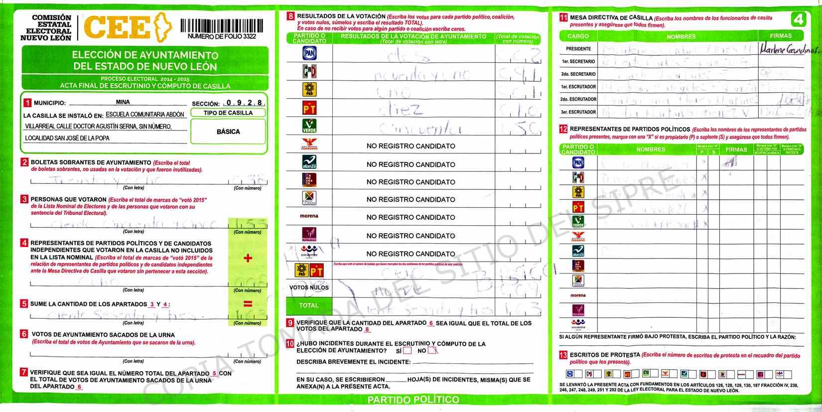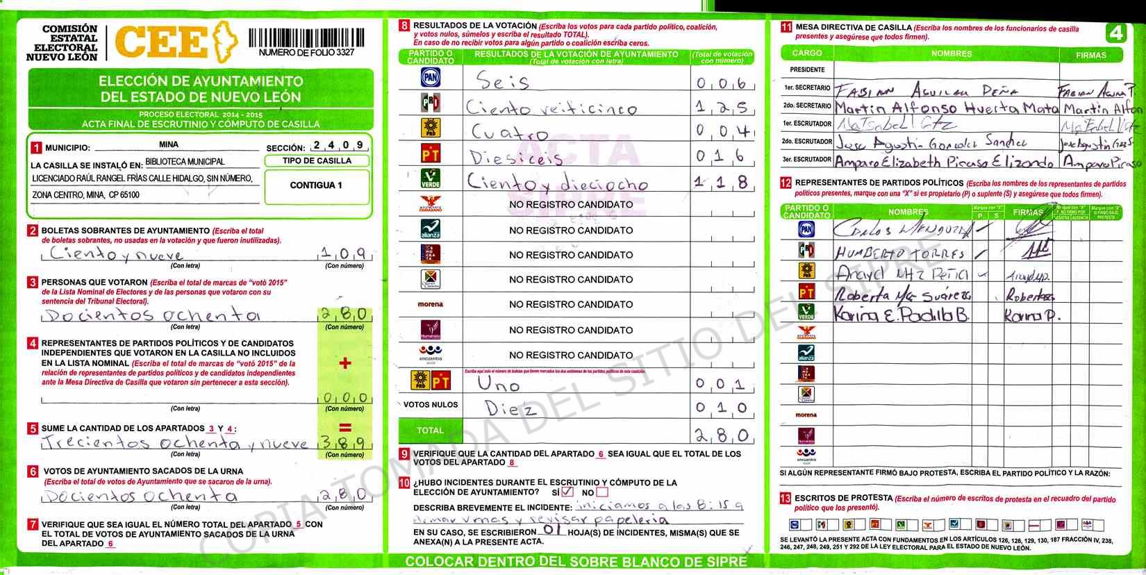 | Claves de Incidencia: | (1) Ilegible, (2) Mutilada, (3) Presenta Correcciones, (4) Presenta Borrones, (5) En Blanco, (6) Cifras Remarcadas, (7) Cifras de Mas, (8) Copiado Movido, (9) Con Signos Inválidos, (10) Excede Lista Nominal, (11) Otra |