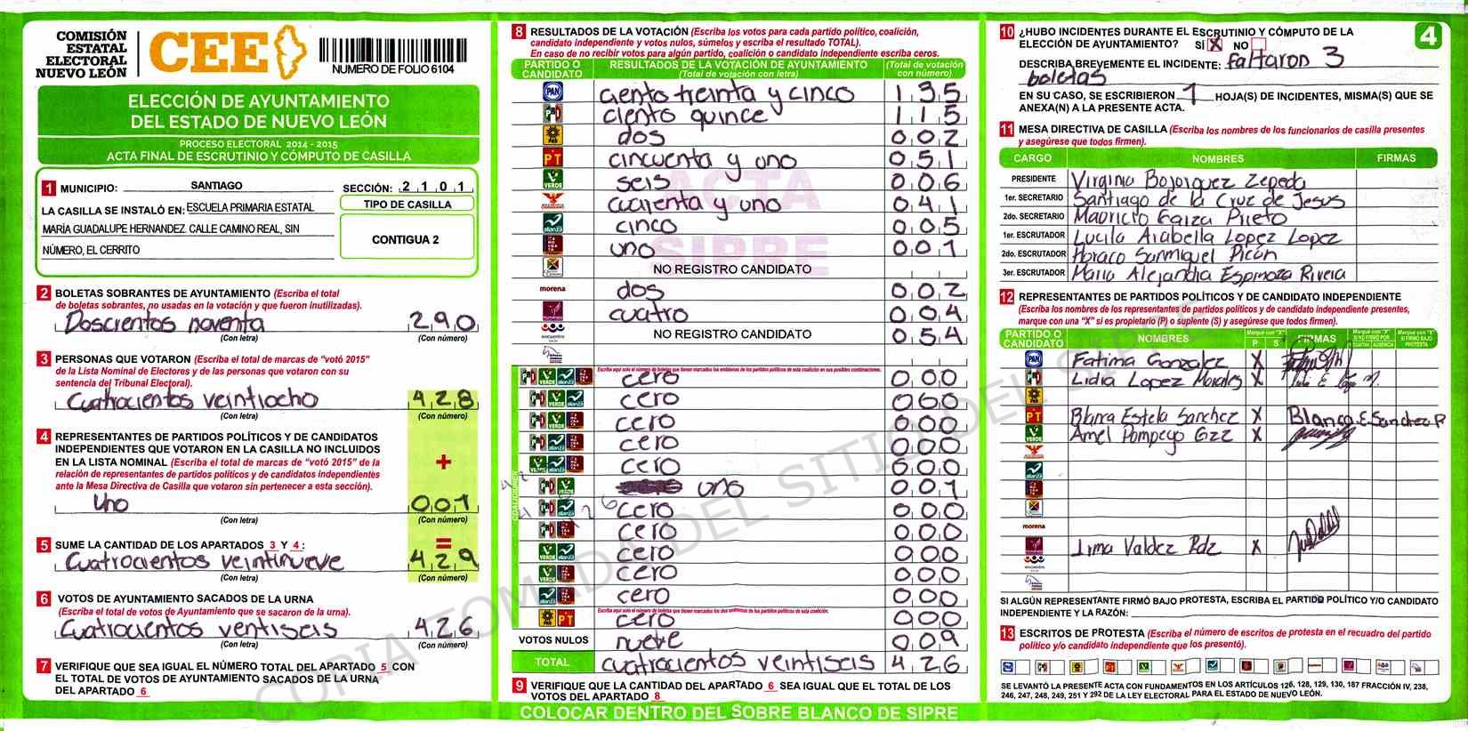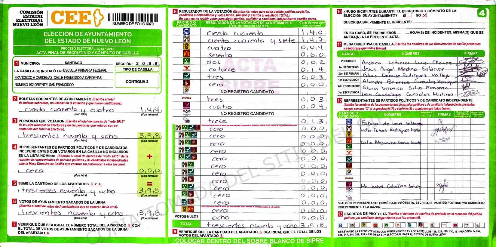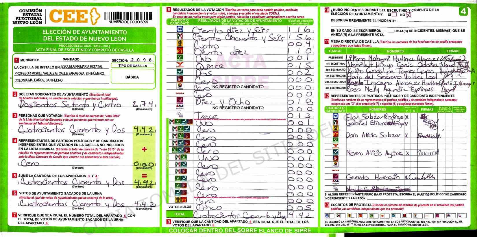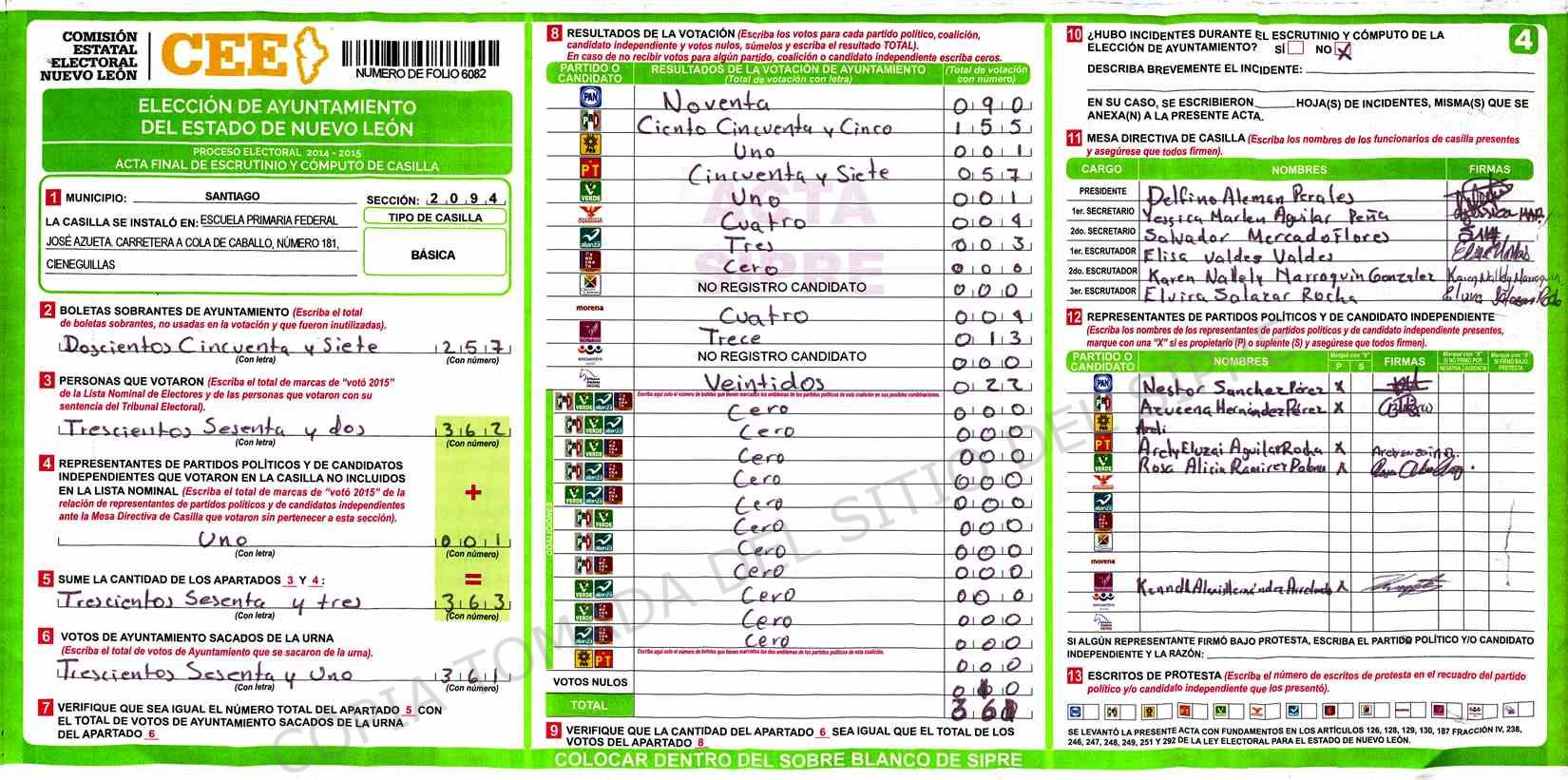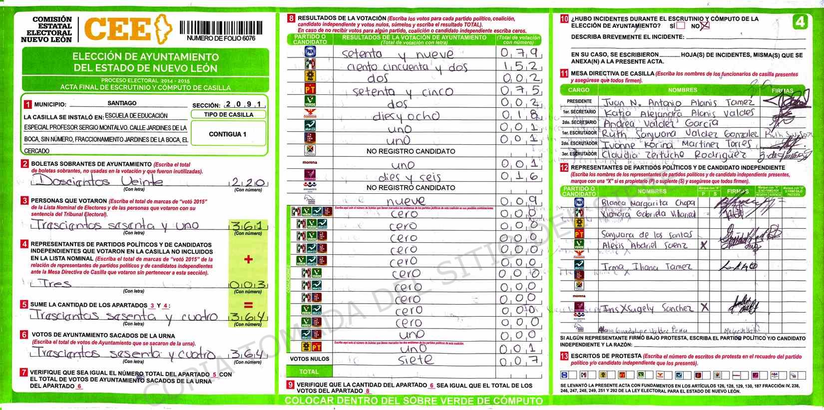 | Claves de Incidencia: | (1) Ilegible, (2) Mutilada, (3) Presenta Correcciones, (4) Presenta Borrones, (5) En Blanco, (6) Cifras Remarcadas, (7) Cifras de Mas, (8) Copiado Movido, (9) Con Signos Inválidos, (10) Excede Lista Nominal, (11) Otra |