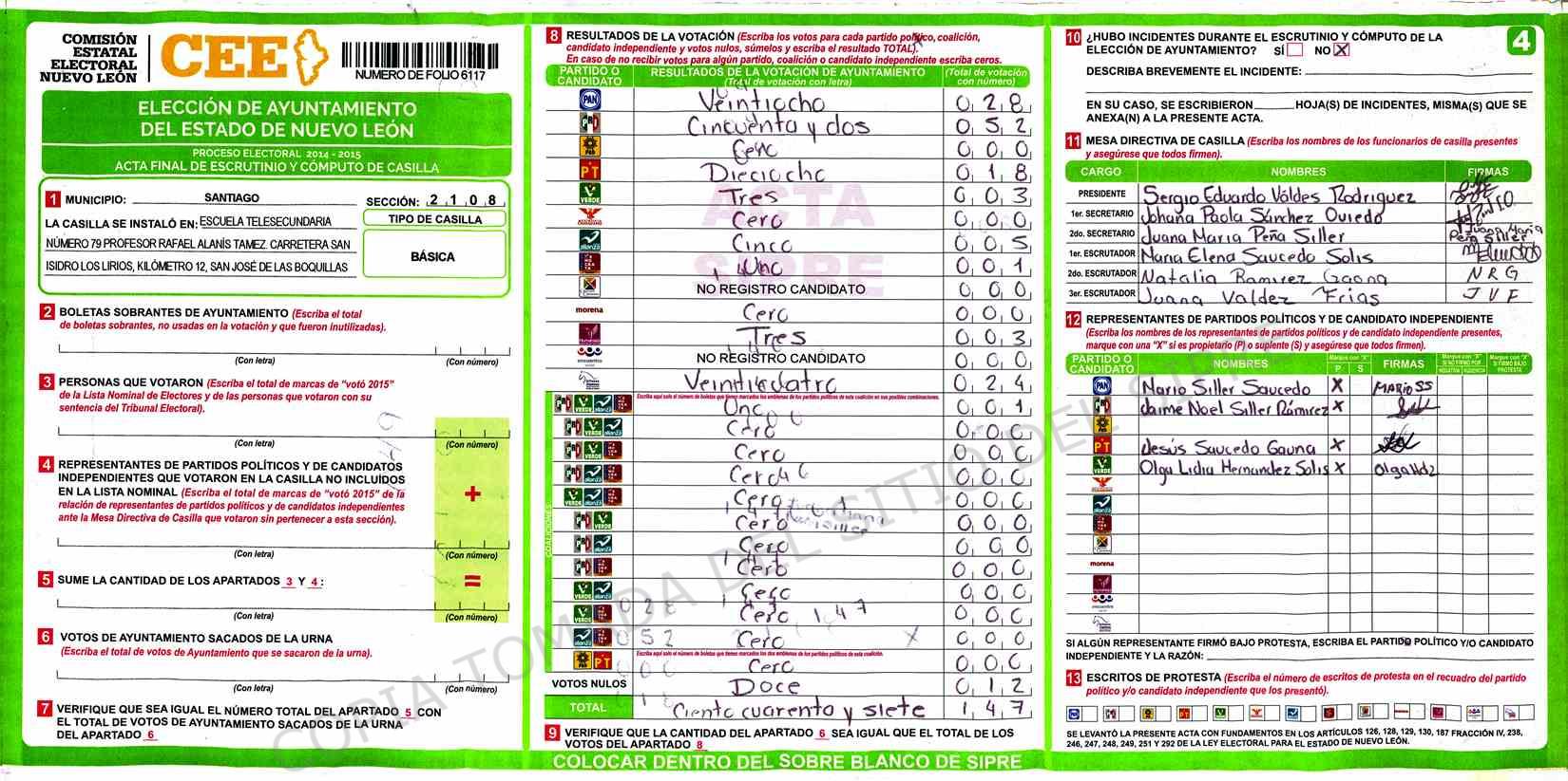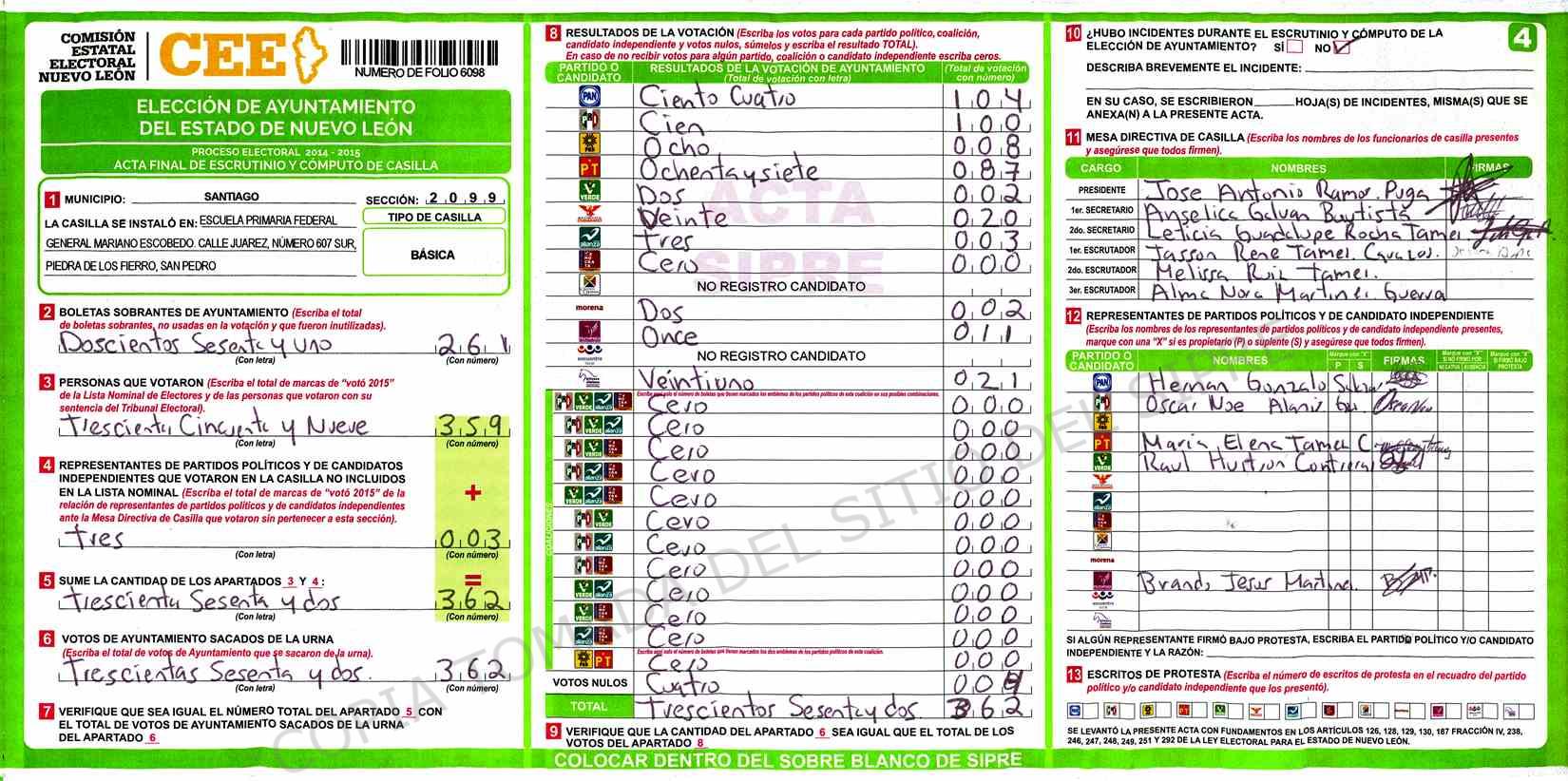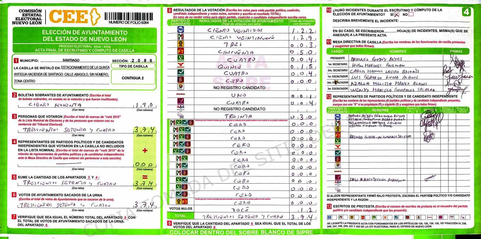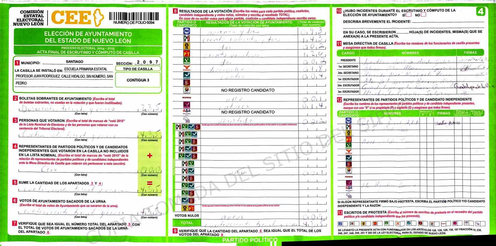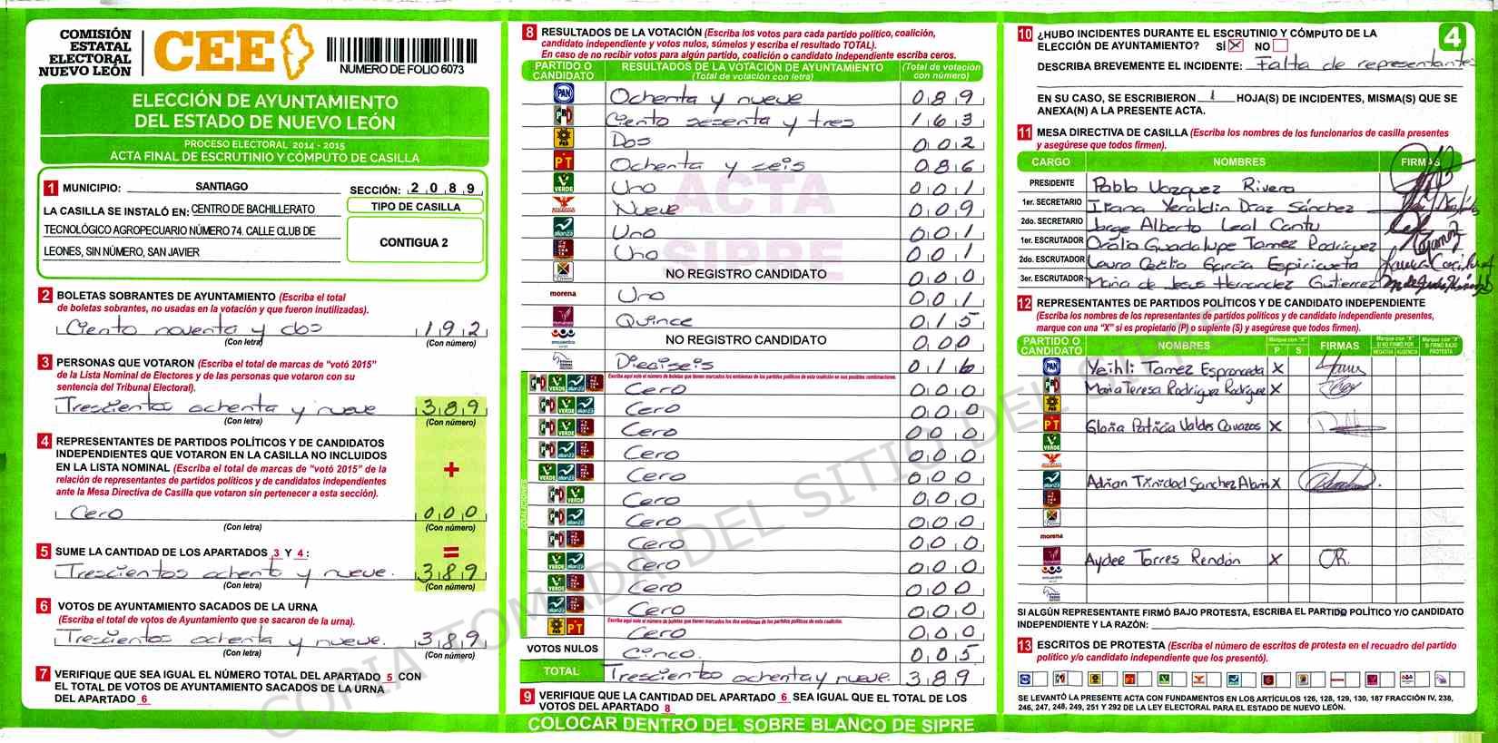 | Claves de Incidencia: | (1) Ilegible, (2) Mutilada, (3) Presenta Correcciones, (4) Presenta Borrones, (5) En Blanco, (6) Cifras Remarcadas, (7) Cifras de Mas, (8) Copiado Movido, (9) Con Signos Inválidos, (10) Excede Lista Nominal, (11) Otra |