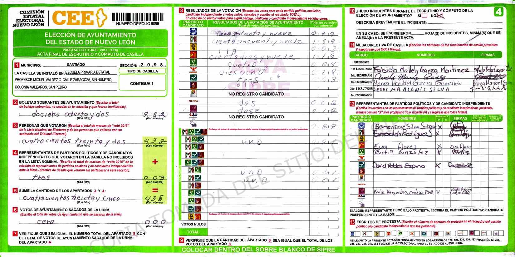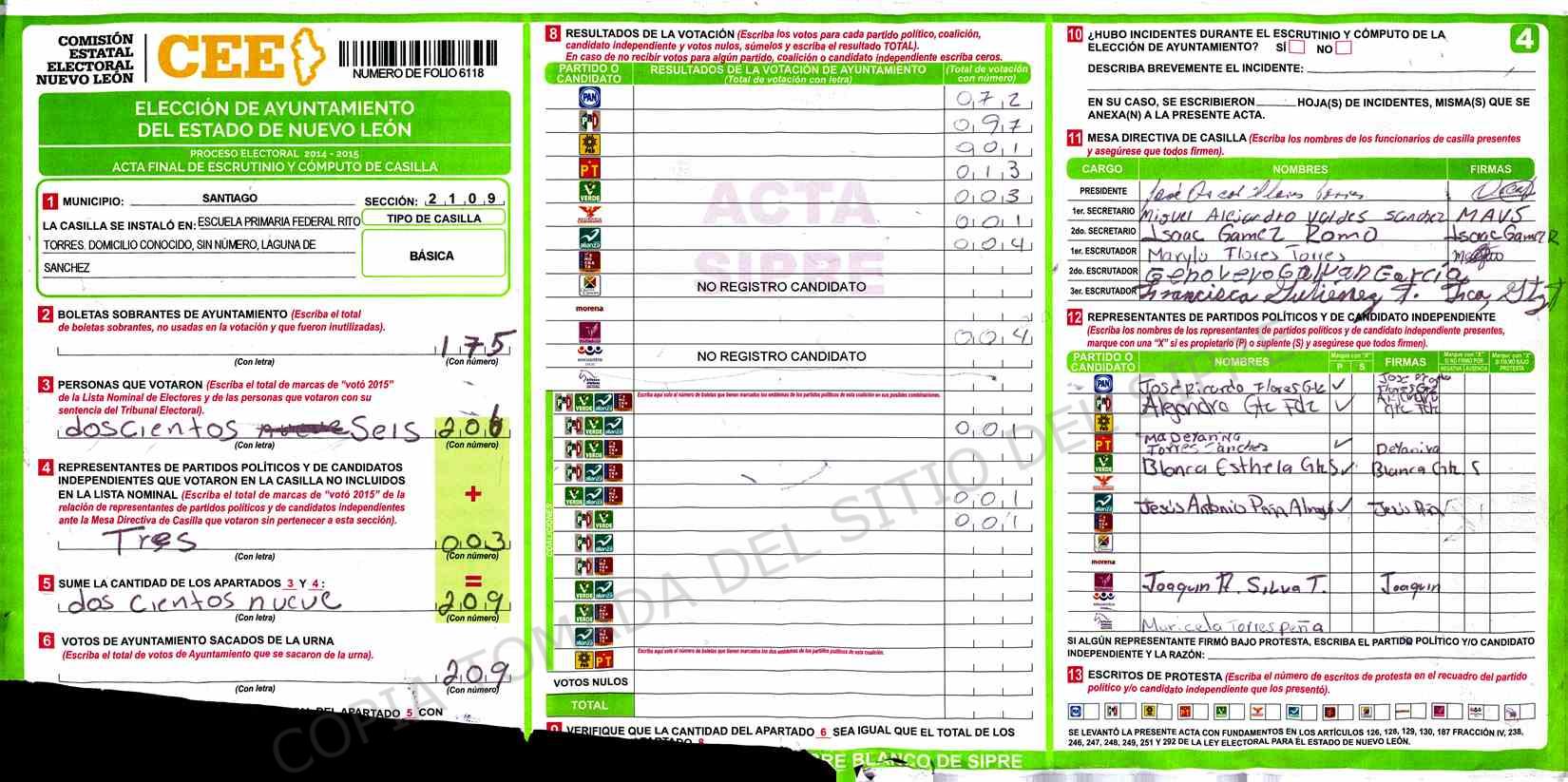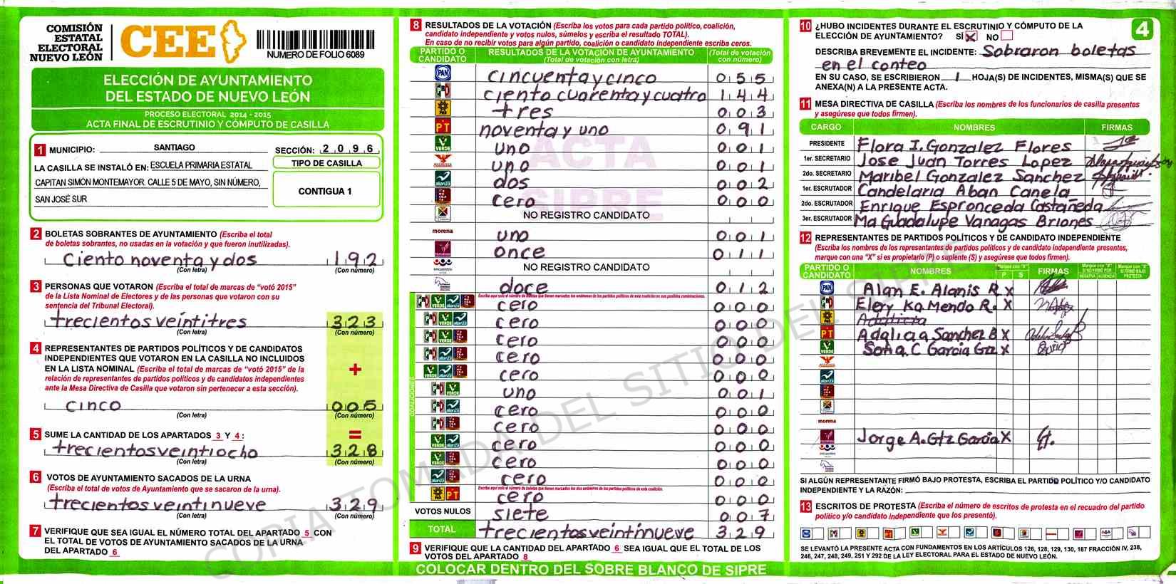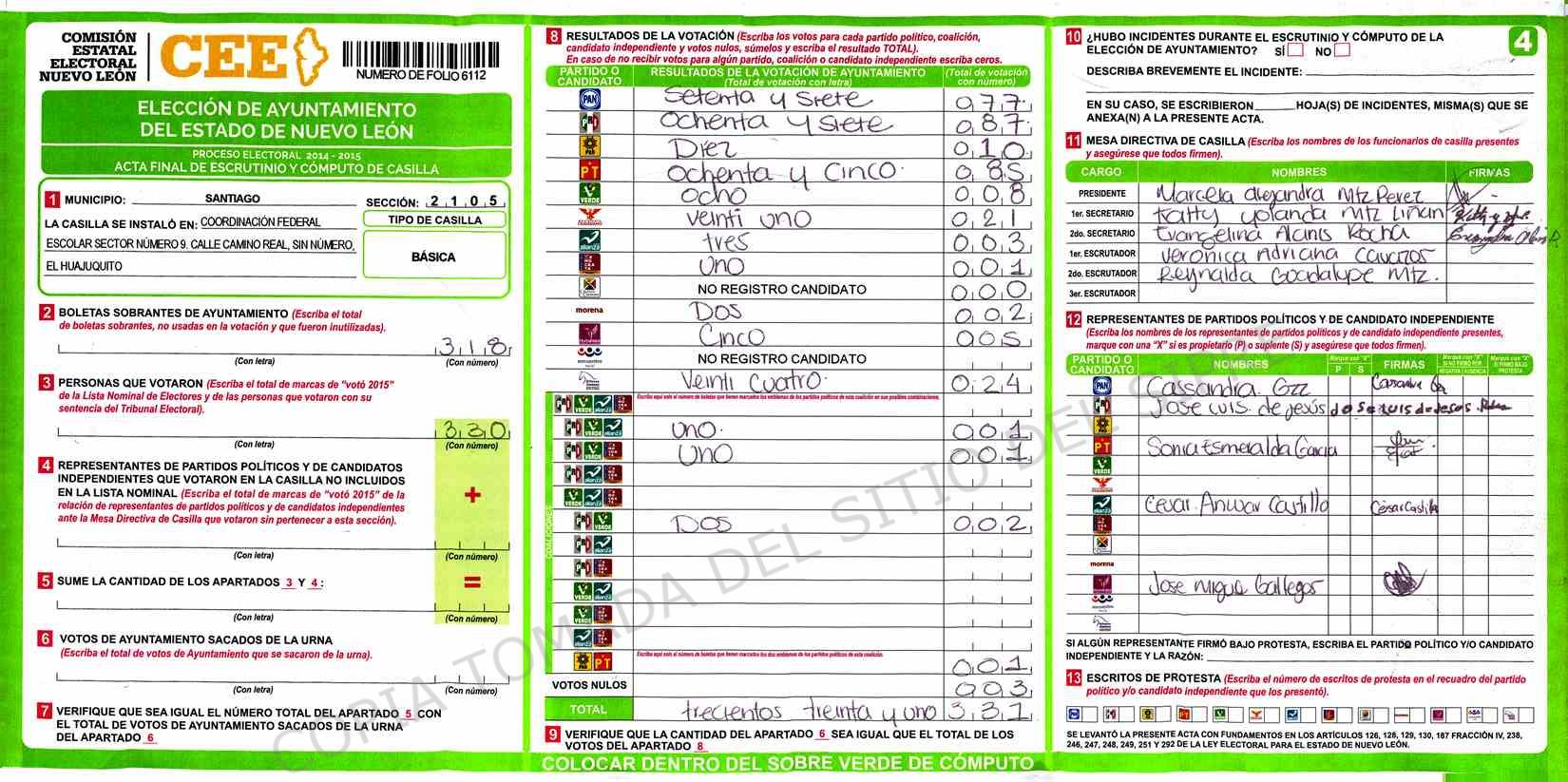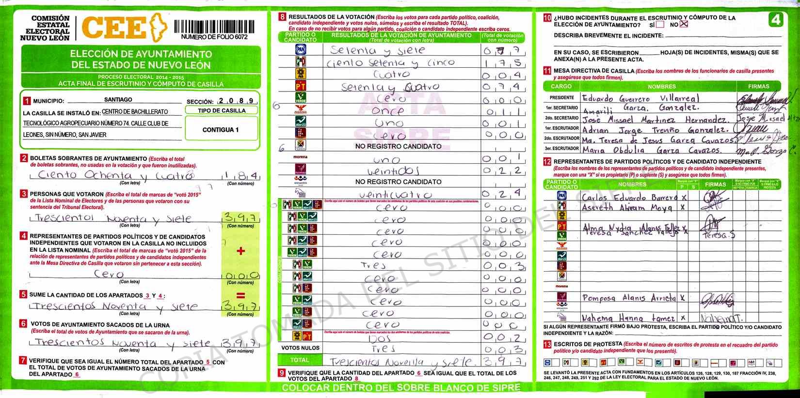 | Claves de Incidencia: | (1) Ilegible, (2) Mutilada, (3) Presenta Correcciones, (4) Presenta Borrones, (5) En Blanco, (6) Cifras Remarcadas, (7) Cifras de Mas, (8) Copiado Movido, (9) Con Signos Inválidos, (10) Excede Lista Nominal, (11) Otra |