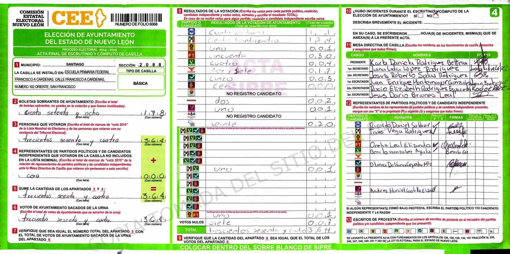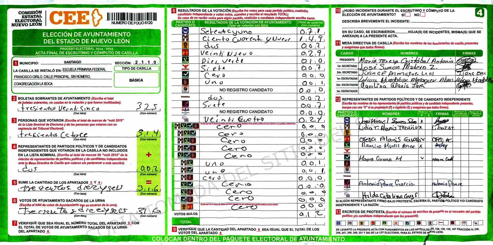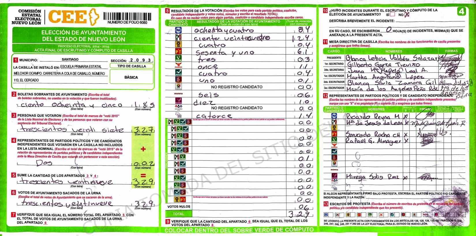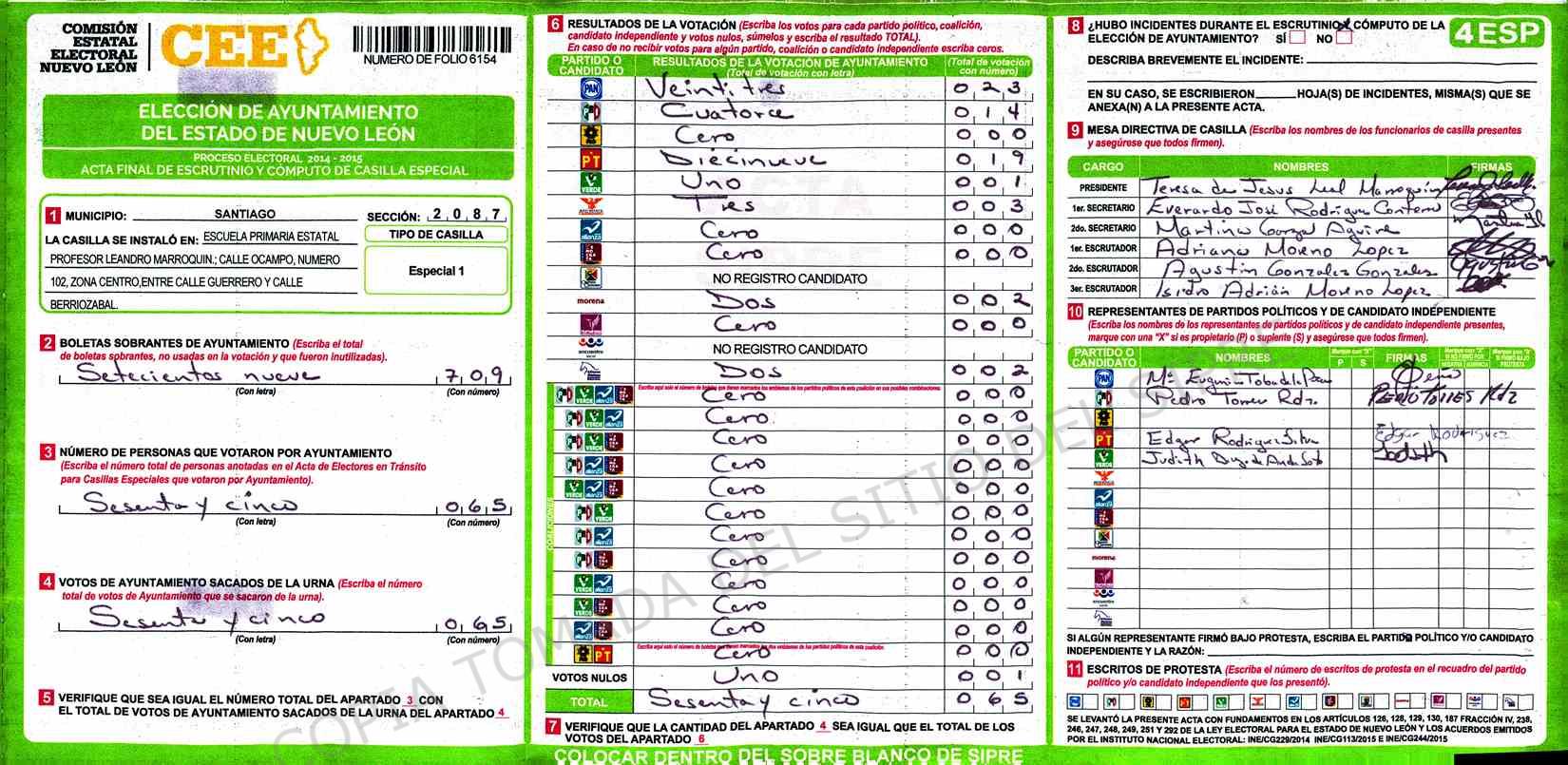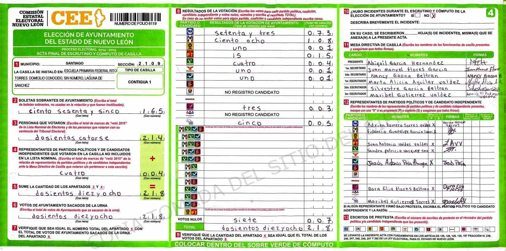 | Claves de Incidencia: | (1) Ilegible, (2) Mutilada, (3) Presenta Correcciones, (4) Presenta Borrones, (5) En Blanco, (6) Cifras Remarcadas, (7) Cifras de Mas, (8) Copiado Movido, (9) Con Signos Inválidos, (10) Excede Lista Nominal, (11) Otra |