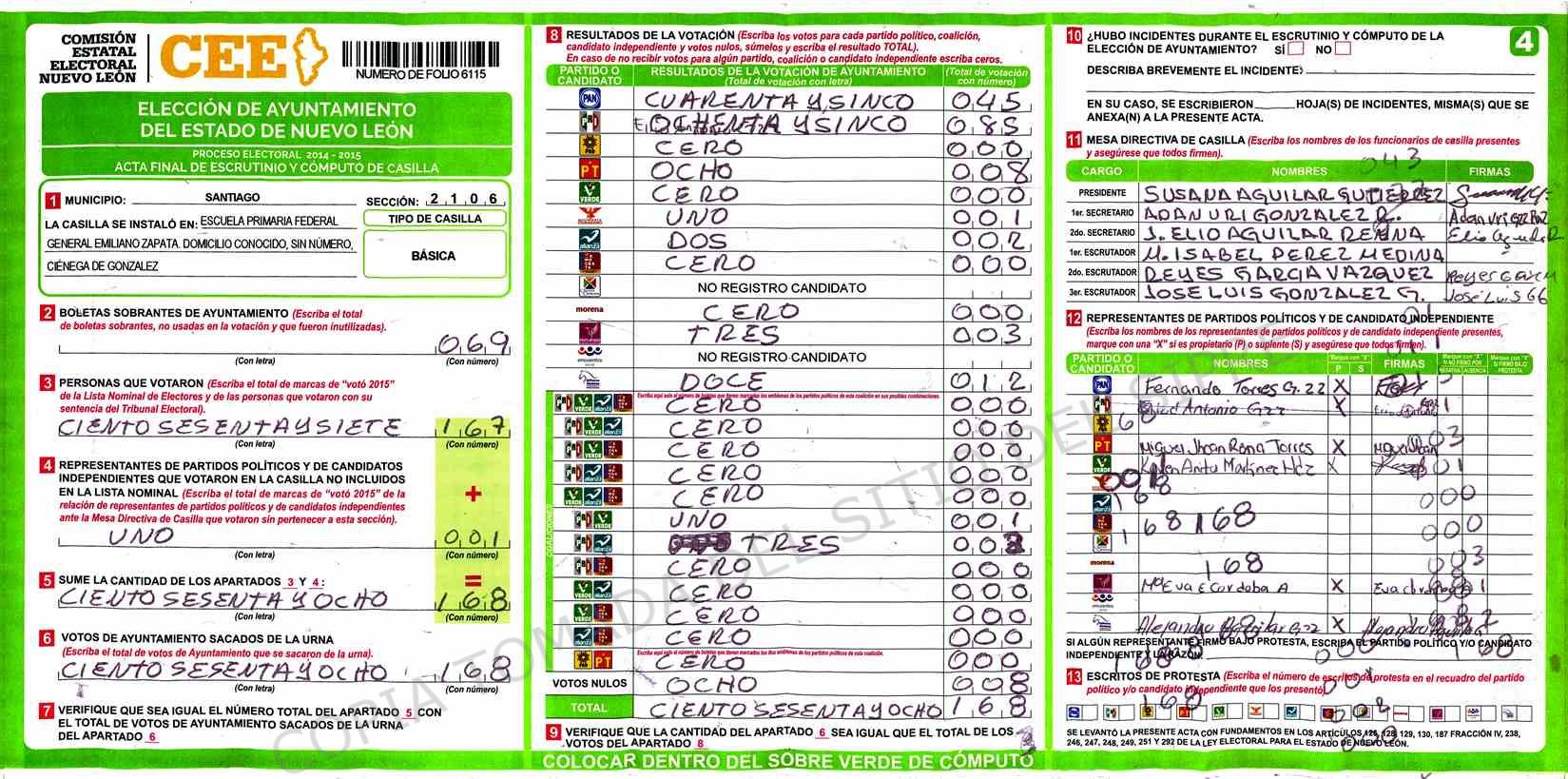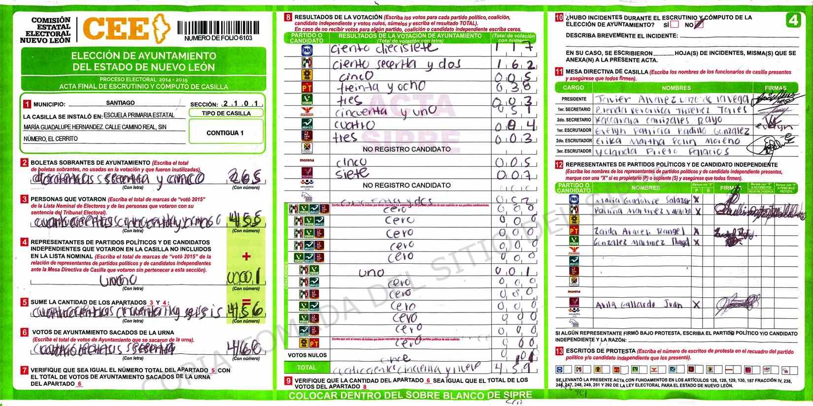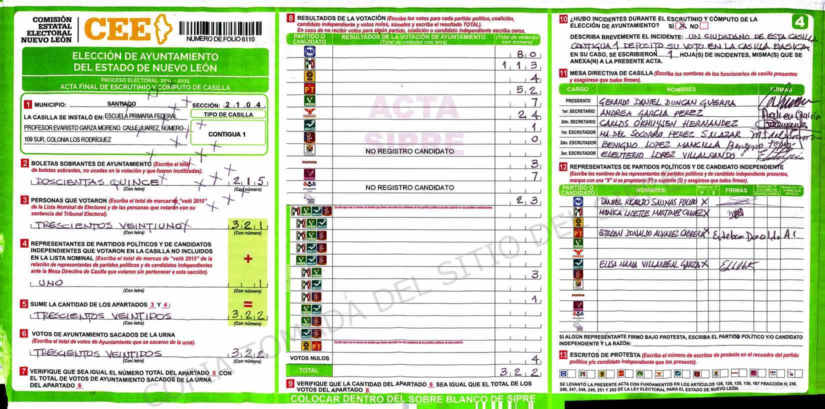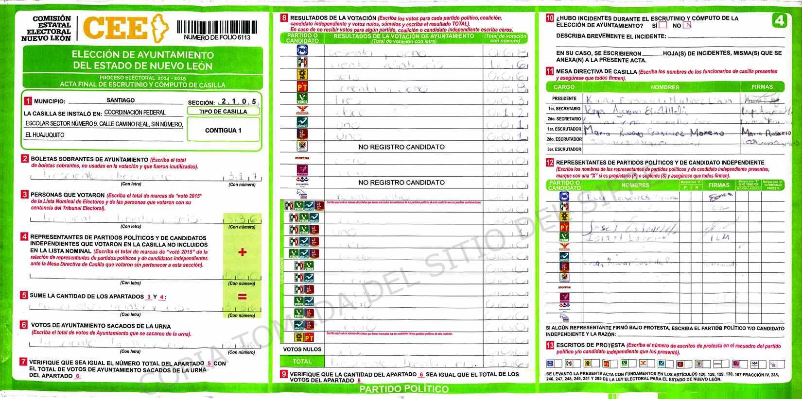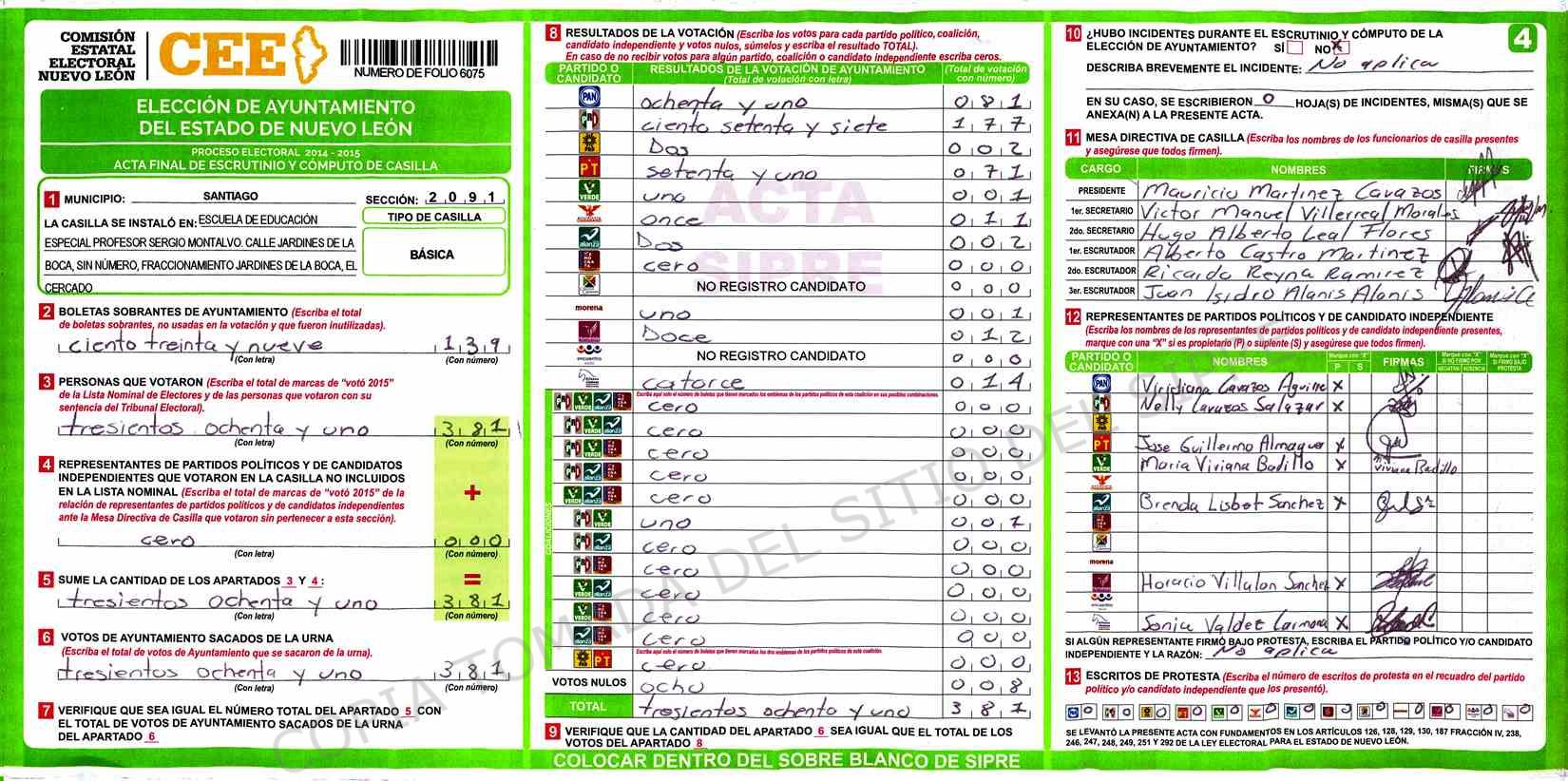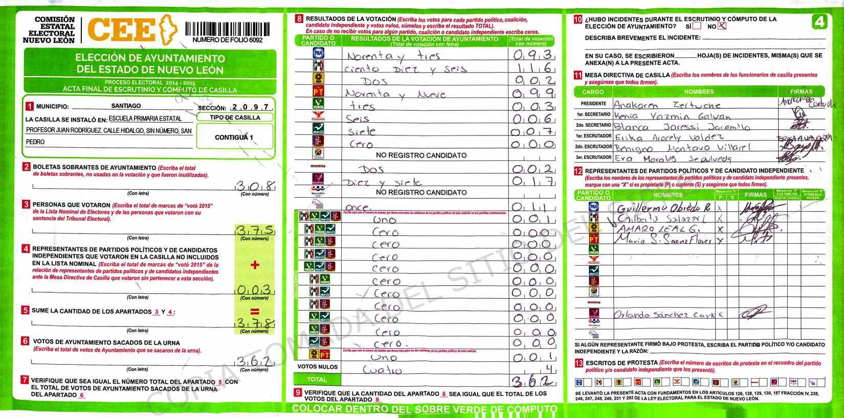 | Claves de Incidencia: | (1) Ilegible, (2) Mutilada, (3) Presenta Correcciones, (4) Presenta Borrones, (5) En Blanco, (6) Cifras Remarcadas, (7) Cifras de Mas, (8) Copiado Movido, (9) Con Signos Inválidos, (10) Excede Lista Nominal, (11) Otra |
