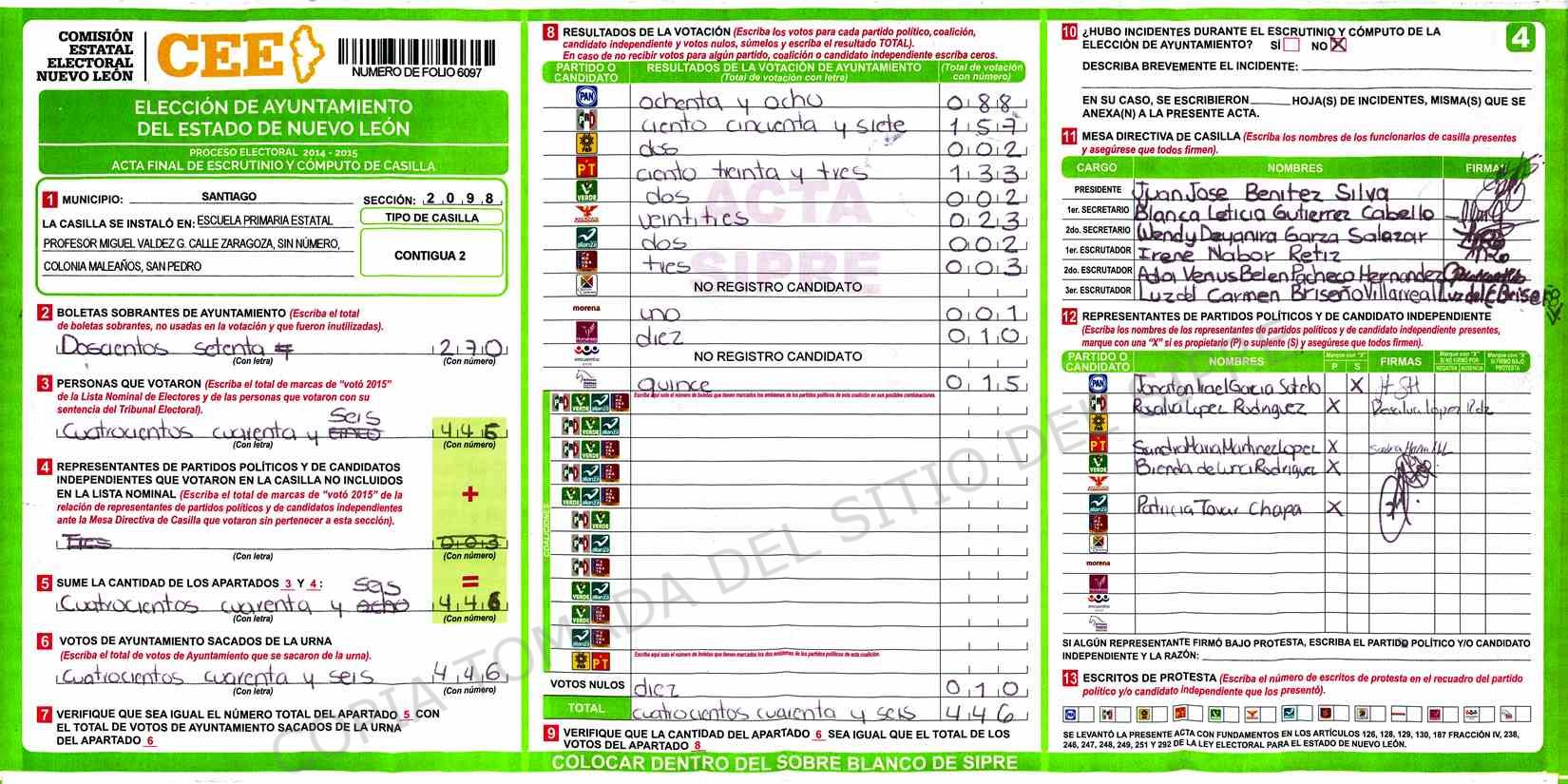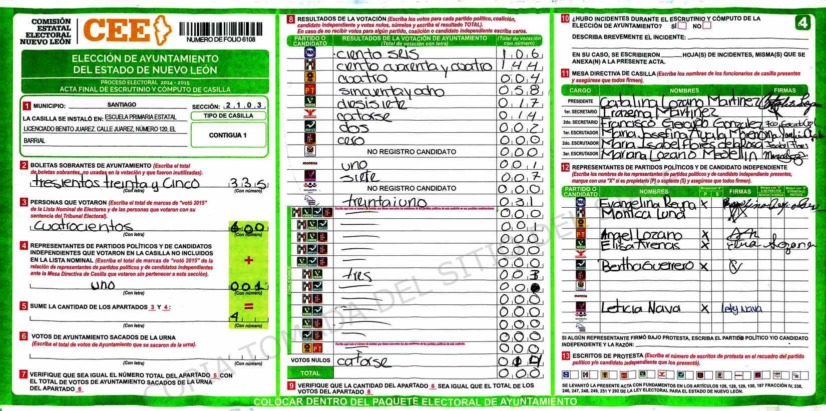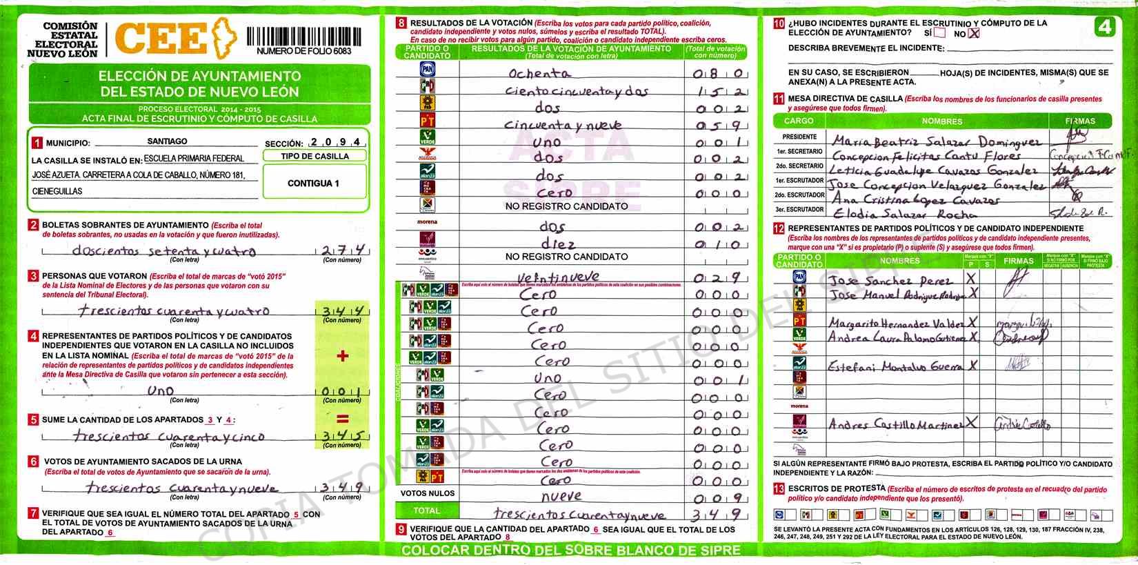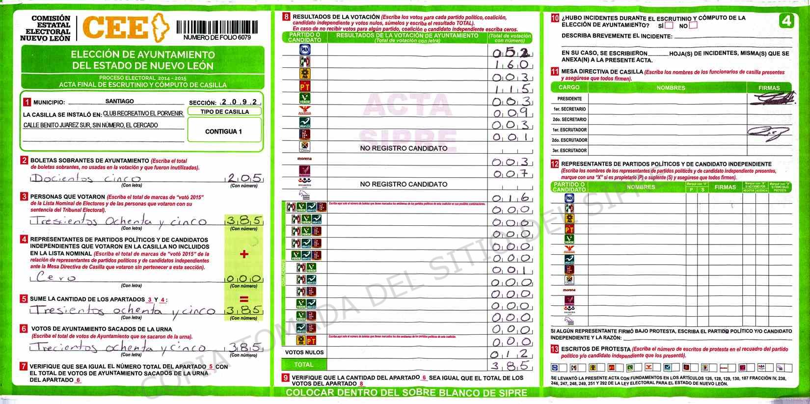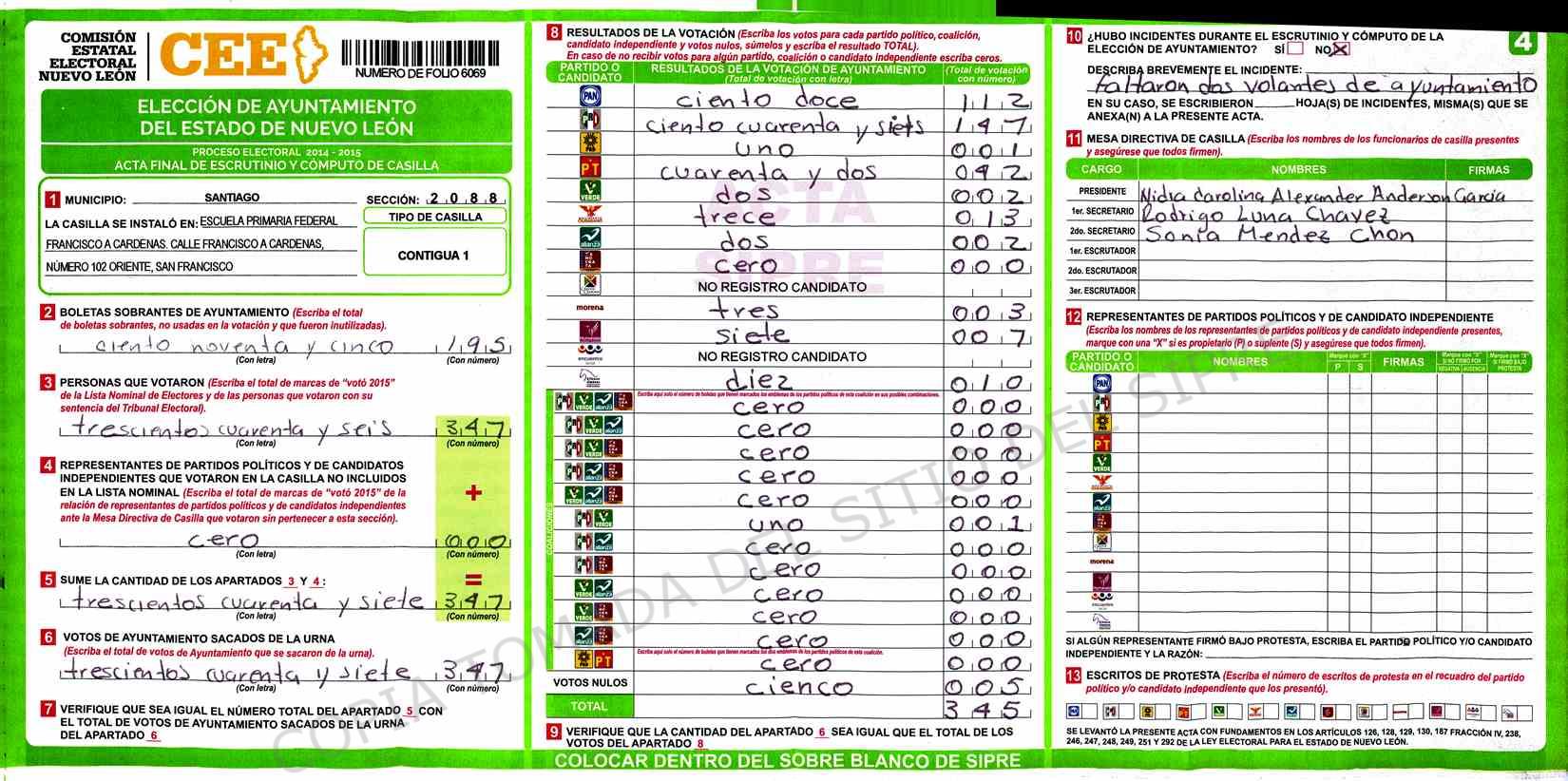 | Claves de Incidencia: | (1) Ilegible, (2) Mutilada, (3) Presenta Correcciones, (4) Presenta Borrones, (5) En Blanco, (6) Cifras Remarcadas, (7) Cifras de Mas, (8) Copiado Movido, (9) Con Signos Inválidos, (10) Excede Lista Nominal, (11) Otra |