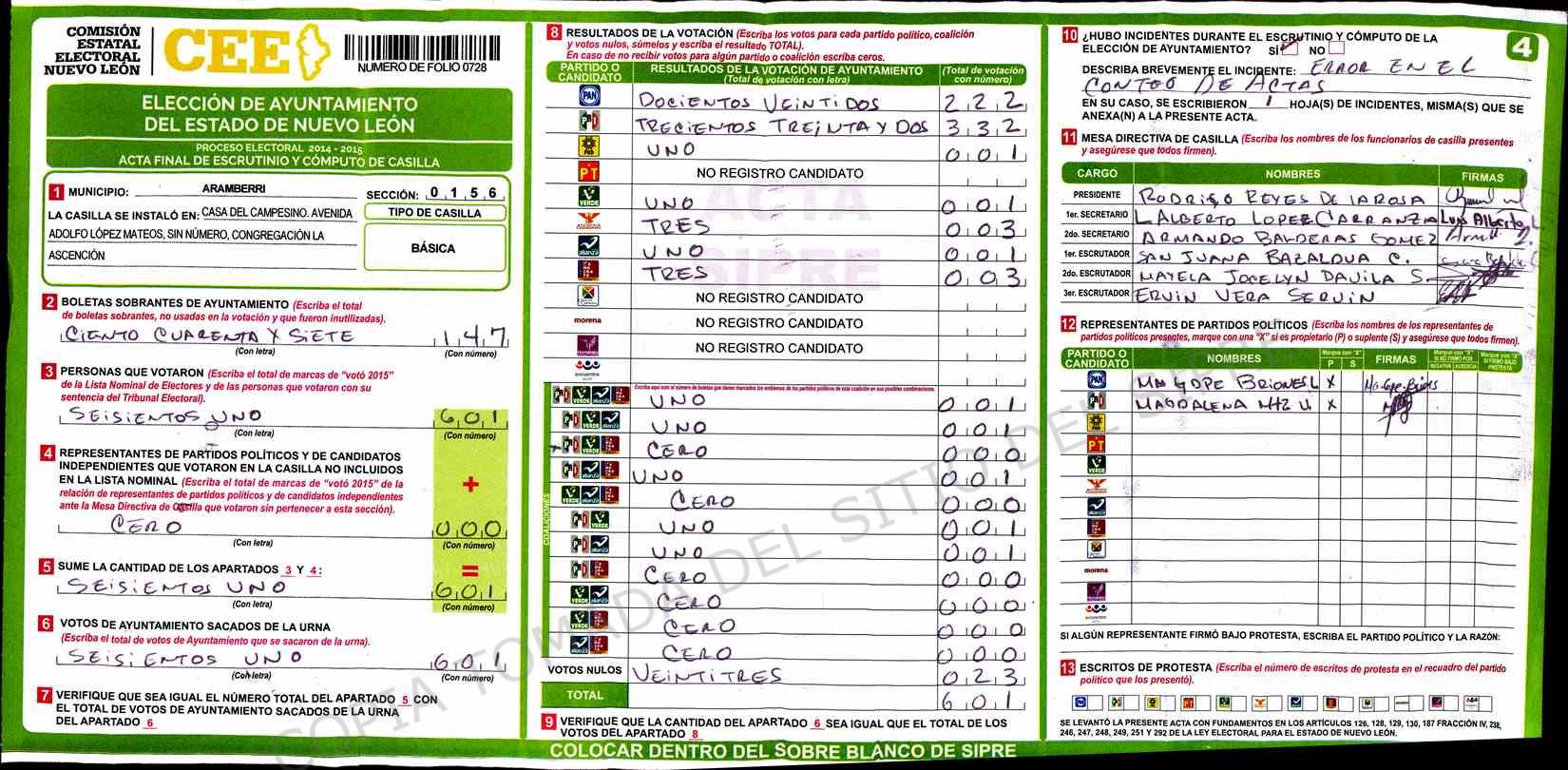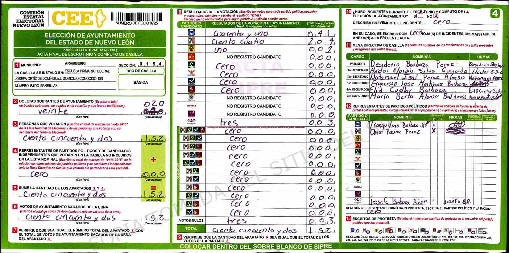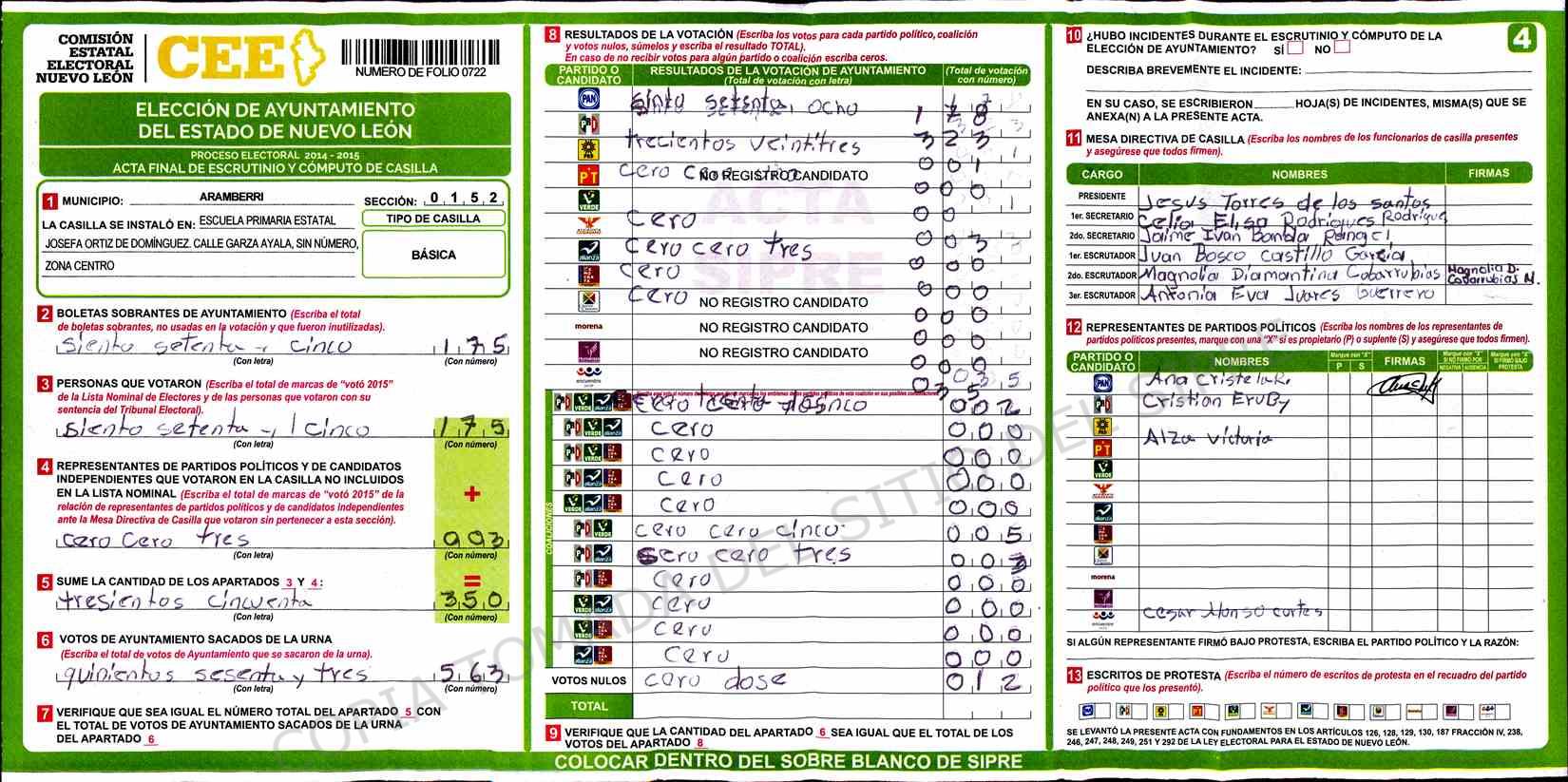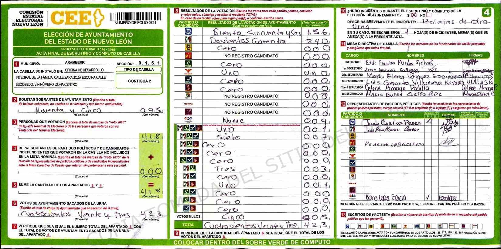 | Claves de Incidencia: | (1) Ilegible, (2) Mutilada, (3) Presenta Correcciones, (4) Presenta Borrones, (5) En Blanco, (6) Cifras Remarcadas, (7) Cifras de Mas, (8) Copiado Movido, (9) Con Signos Inválidos, (10) Excede Lista Nominal, (11) Otra |