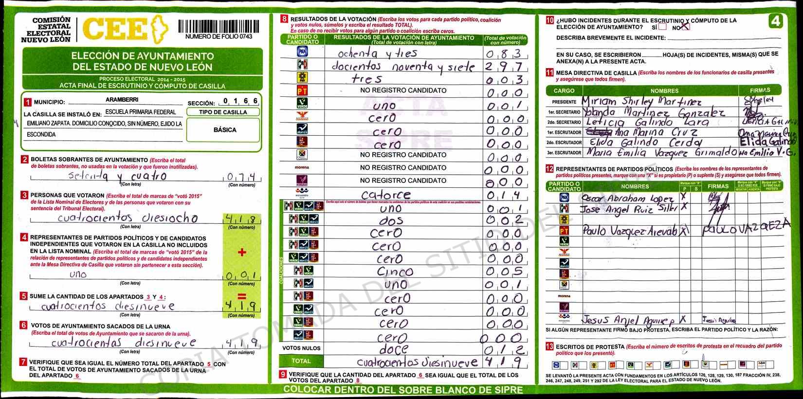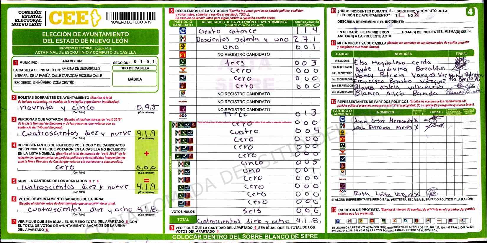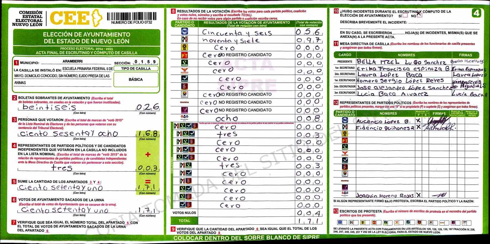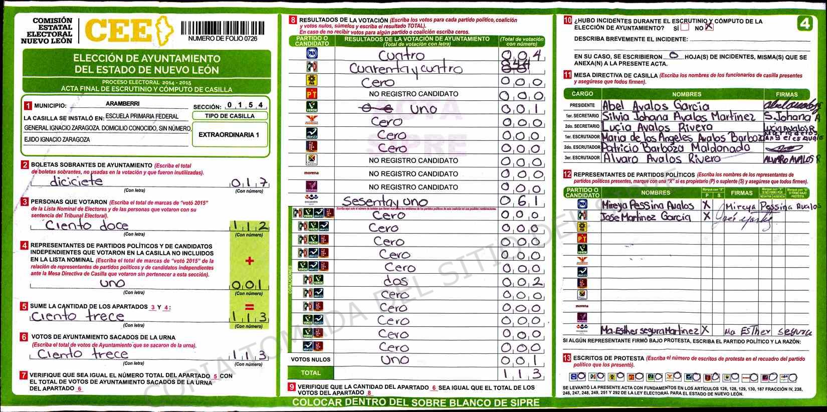 | Claves de Incidencia: | (1) Ilegible, (2) Mutilada, (3) Presenta Correcciones, (4) Presenta Borrones, (5) En Blanco, (6) Cifras Remarcadas, (7) Cifras de Mas, (8) Copiado Movido, (9) Con Signos Inválidos, (10) Excede Lista Nominal, (11) Otra |