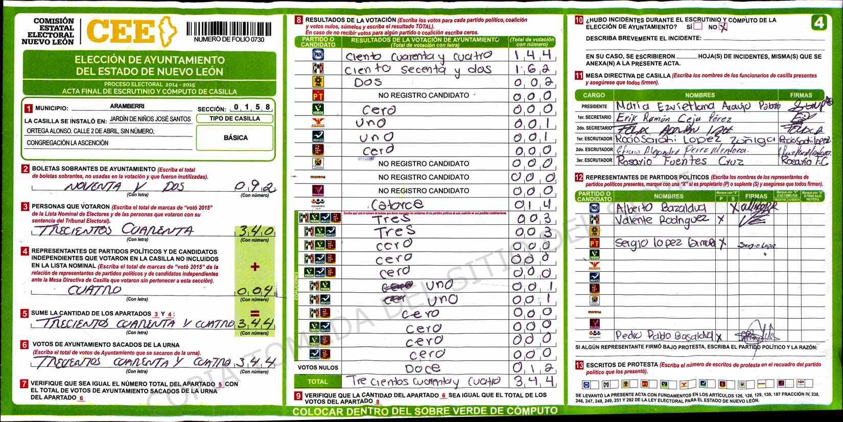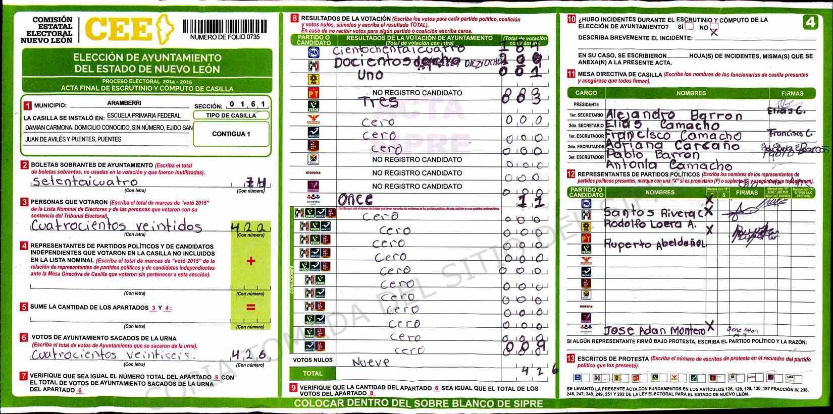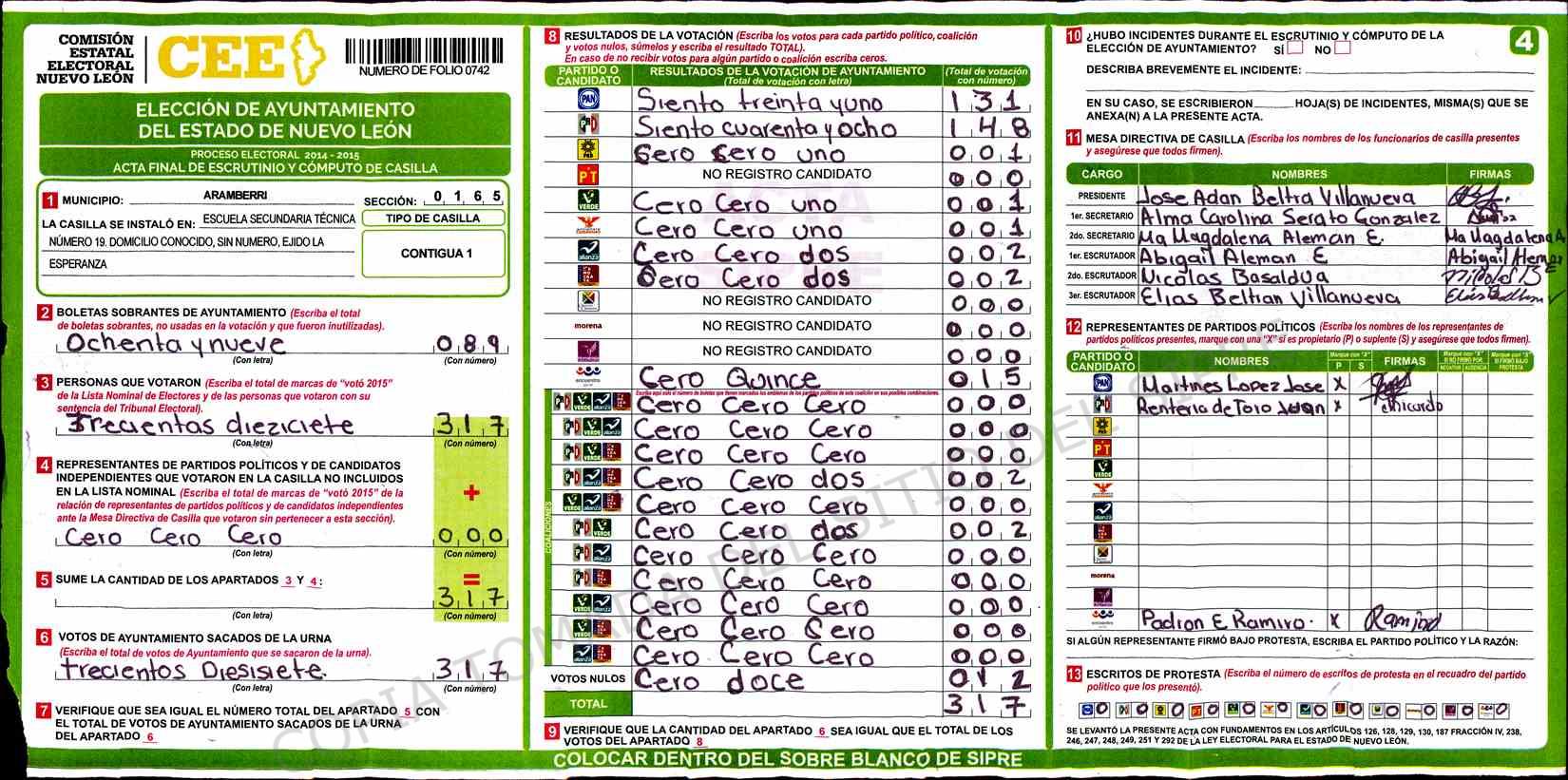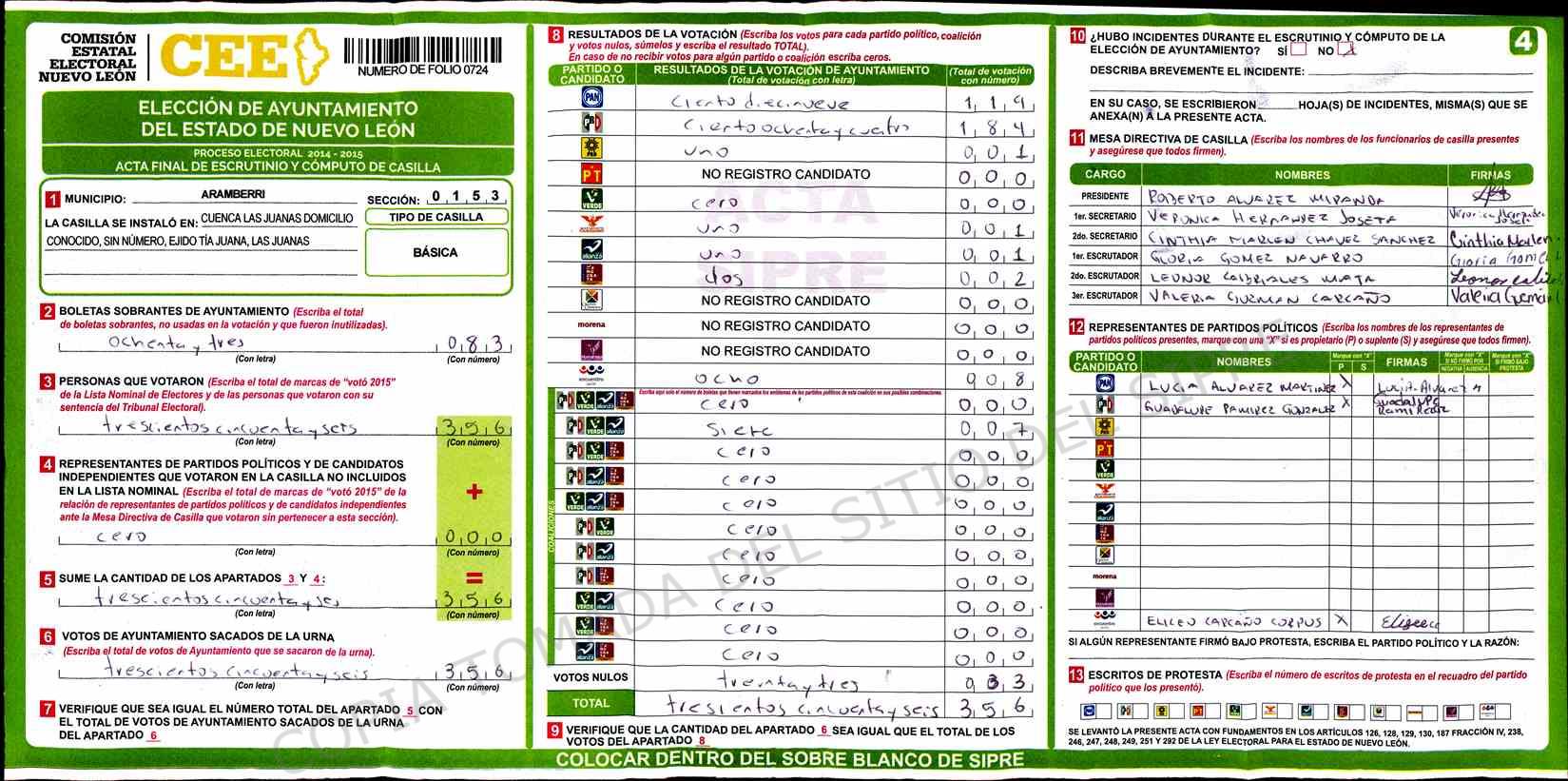 | Claves de Incidencia: | (1) Ilegible, (2) Mutilada, (3) Presenta Correcciones, (4) Presenta Borrones, (5) En Blanco, (6) Cifras Remarcadas, (7) Cifras de Mas, (8) Copiado Movido, (9) Con Signos Inválidos, (10) Excede Lista Nominal, (11) Otra |