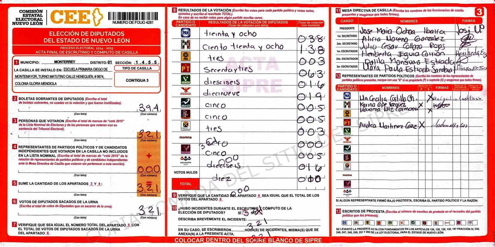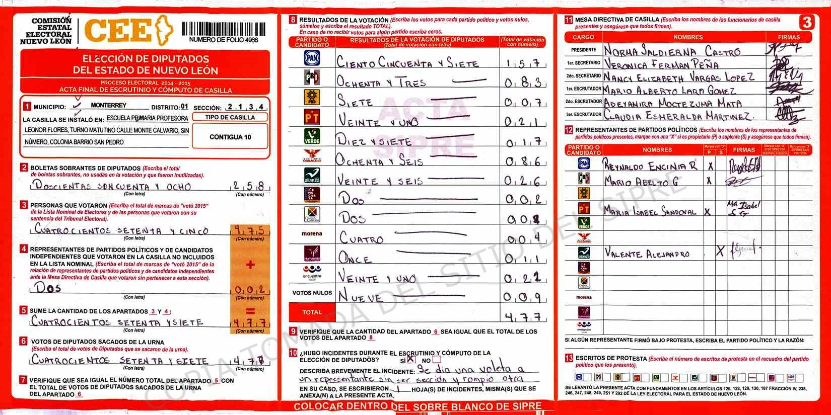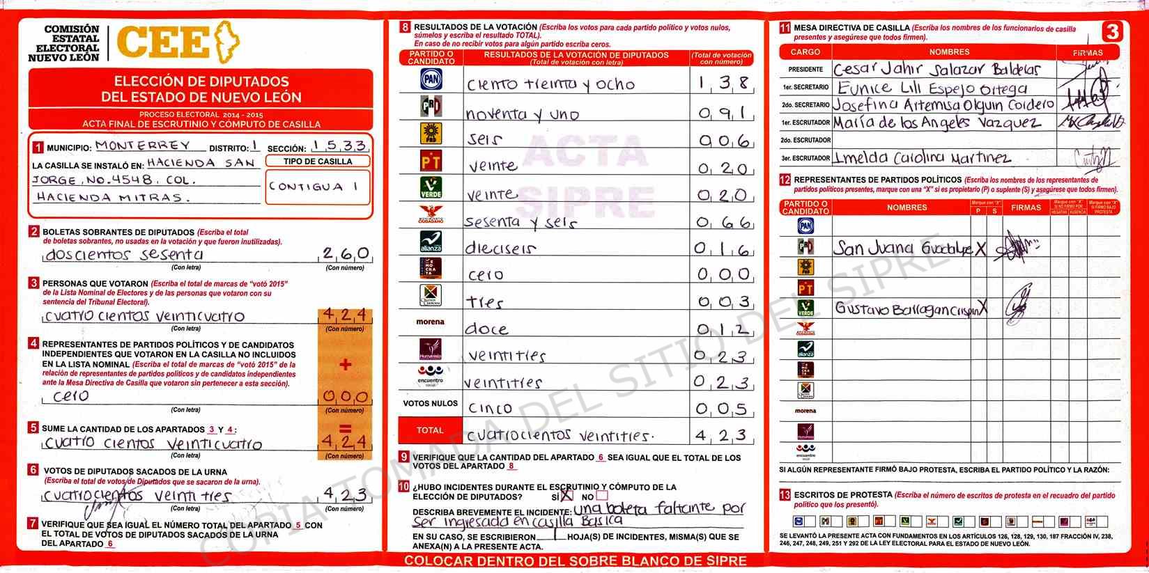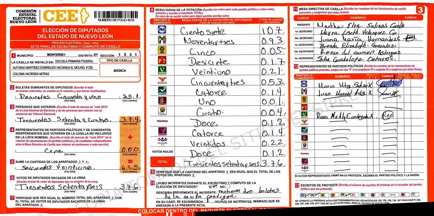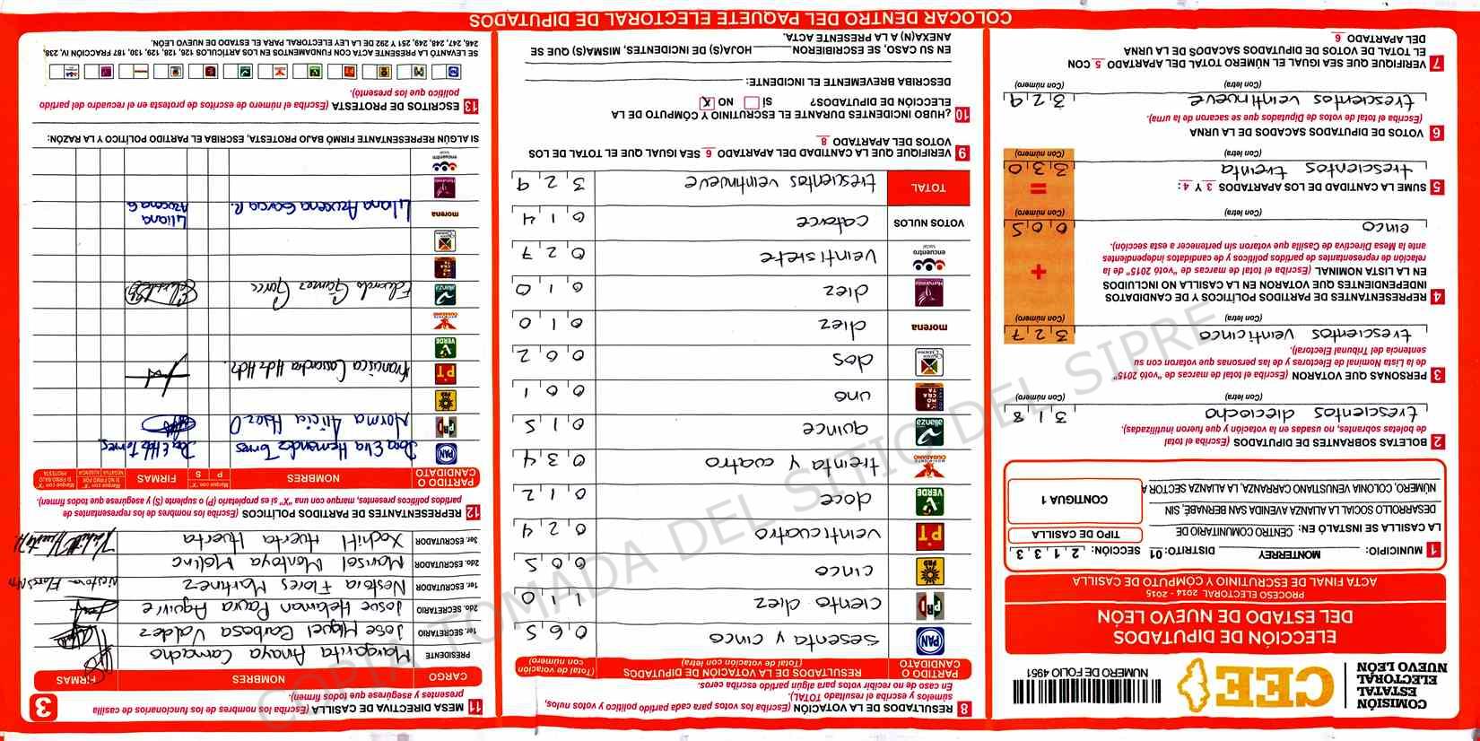 | Claves de Incidencia: | (1) Ilegible, (2) Mutilada, (3) Presenta Correcciones, (4) Presenta Borrones, (5) En Blanco, (6) Cifras Remarcadas, (7) Cifras de Mas, (8) Copiado Movido, (9) Con Signos Inválidos, (10) Excede Lista Nominal, (11) Otra |