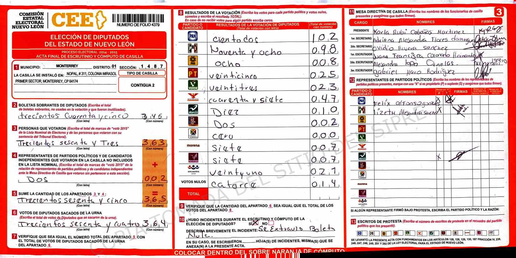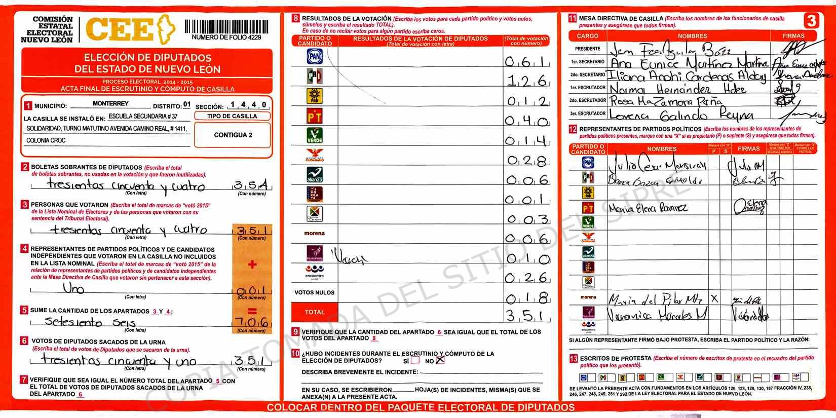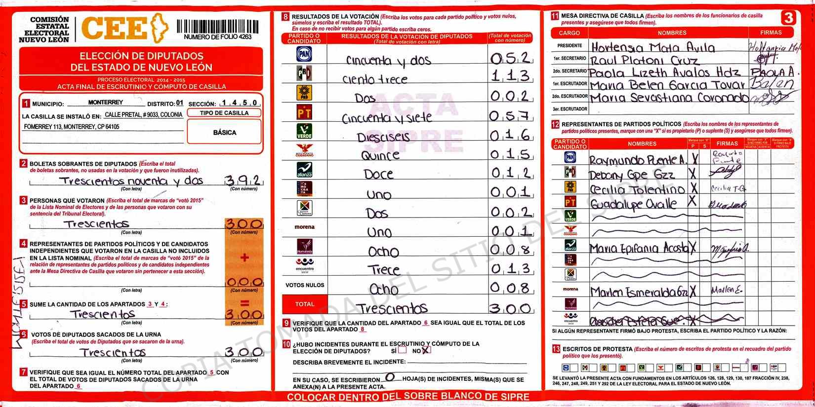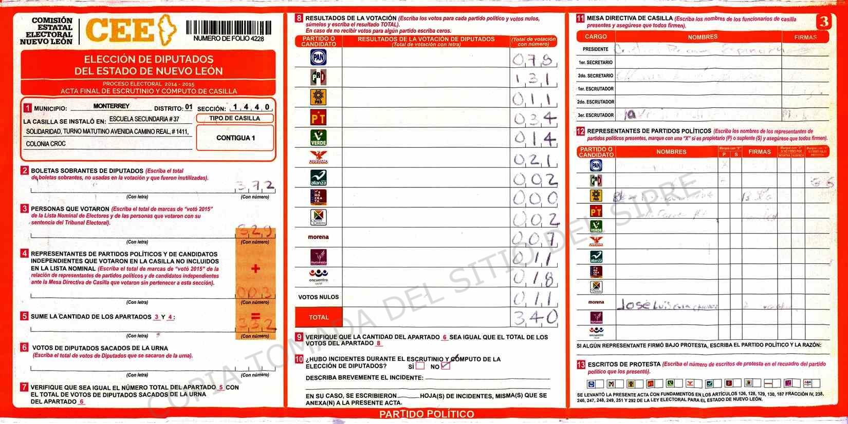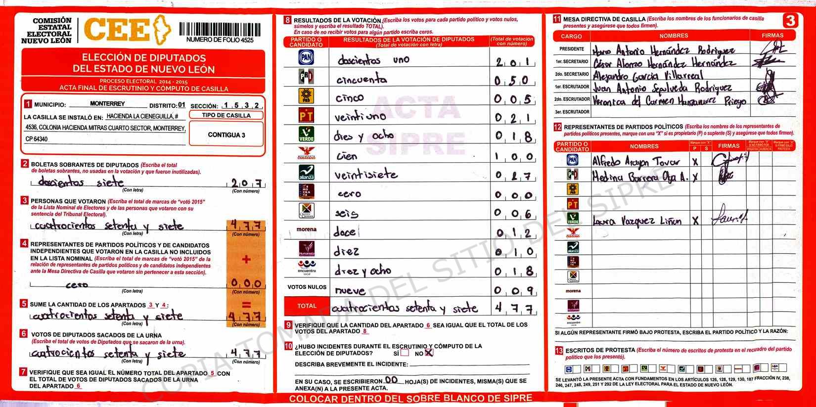 | Claves de Incidencia: | (1) Ilegible, (2) Mutilada, (3) Presenta Correcciones, (4) Presenta Borrones, (5) En Blanco, (6) Cifras Remarcadas, (7) Cifras de Mas, (8) Copiado Movido, (9) Con Signos Inválidos, (10) Excede Lista Nominal, (11) Otra |