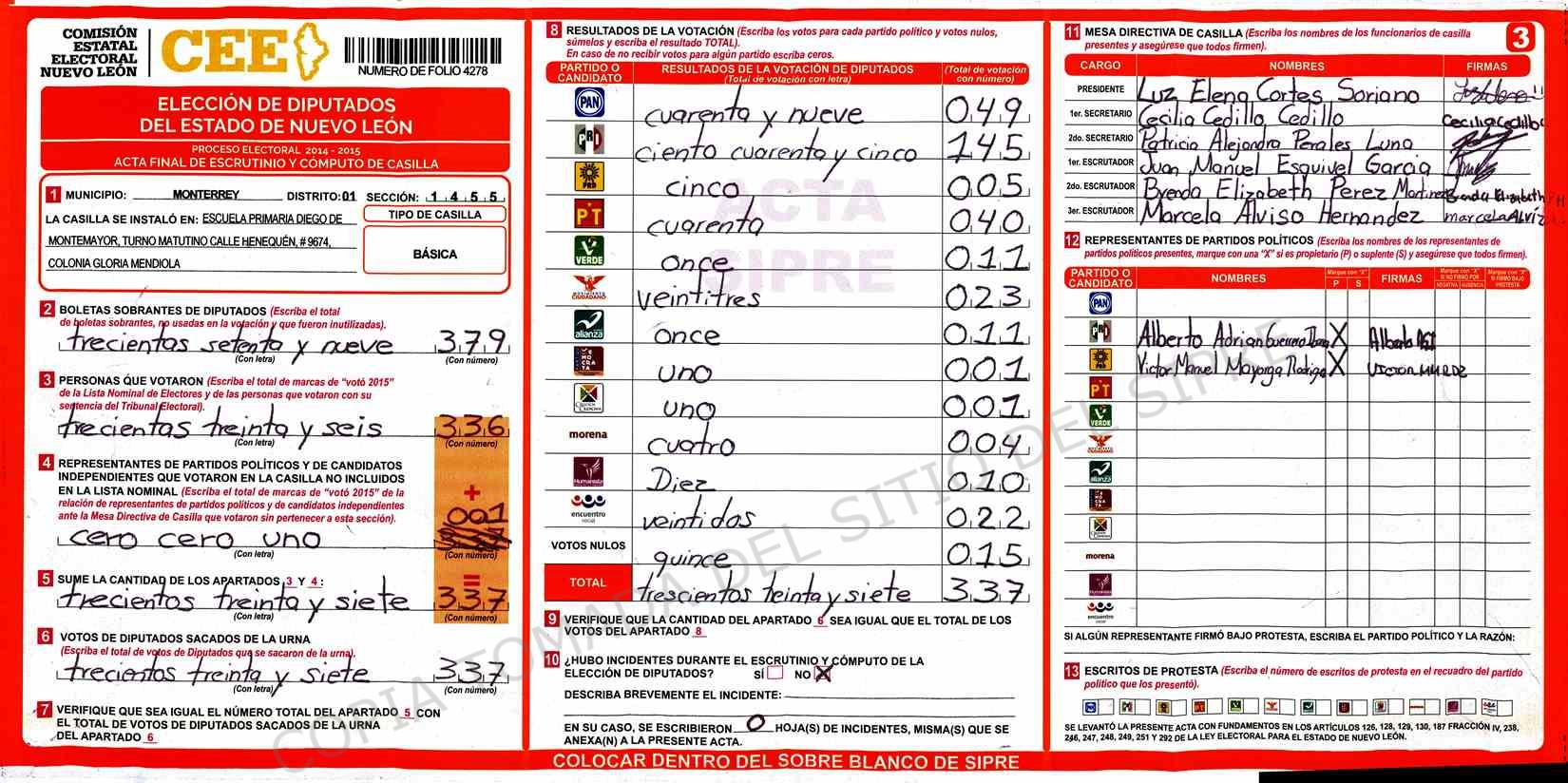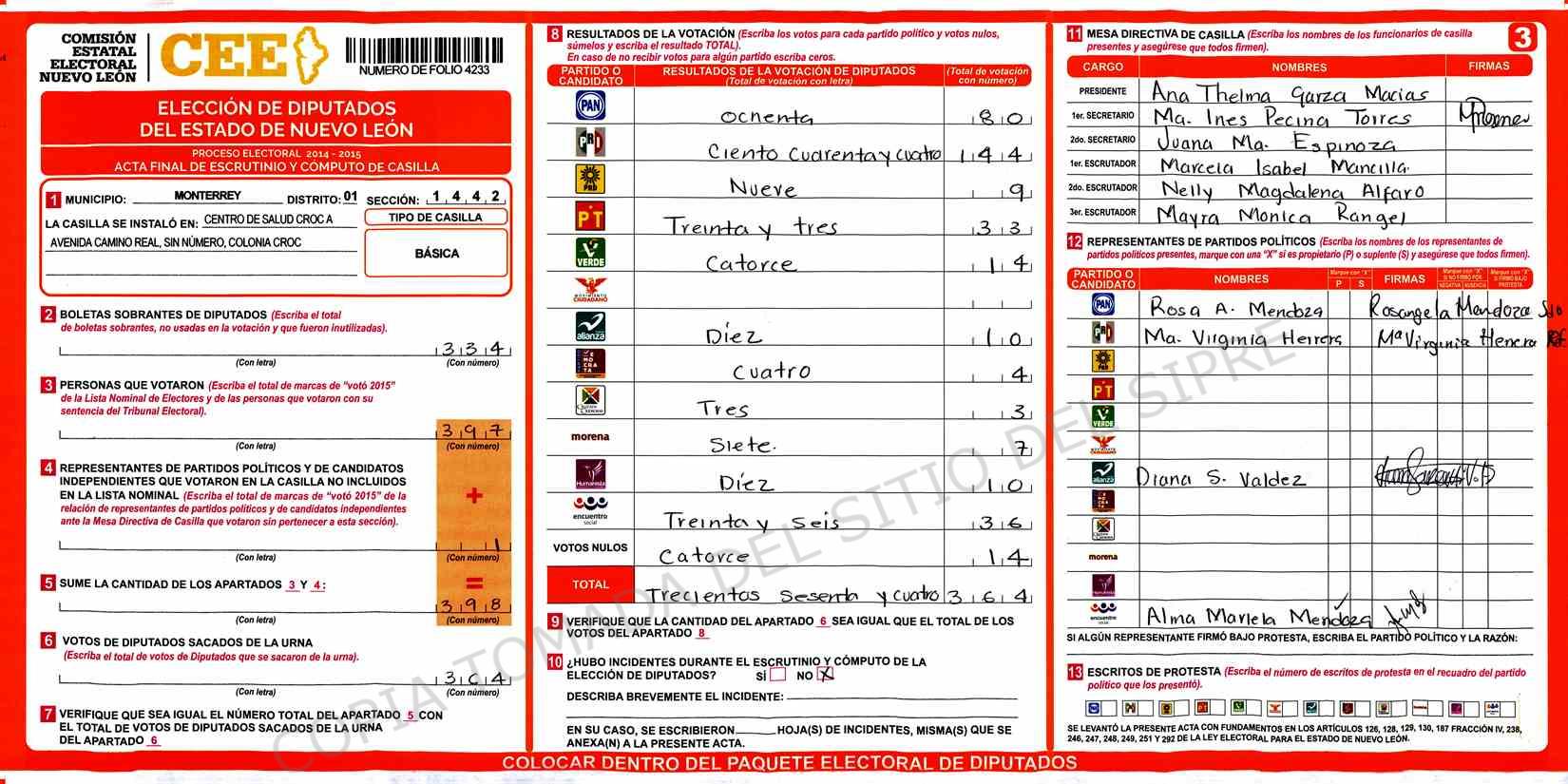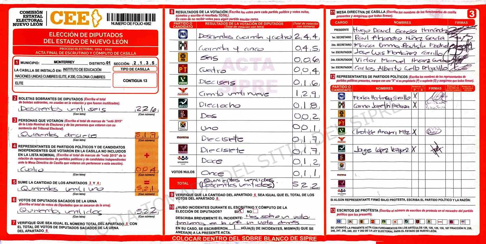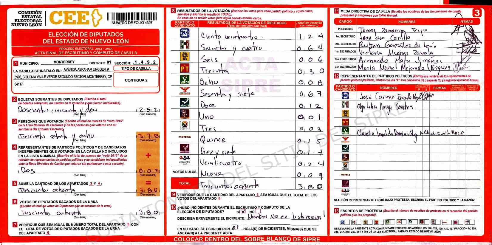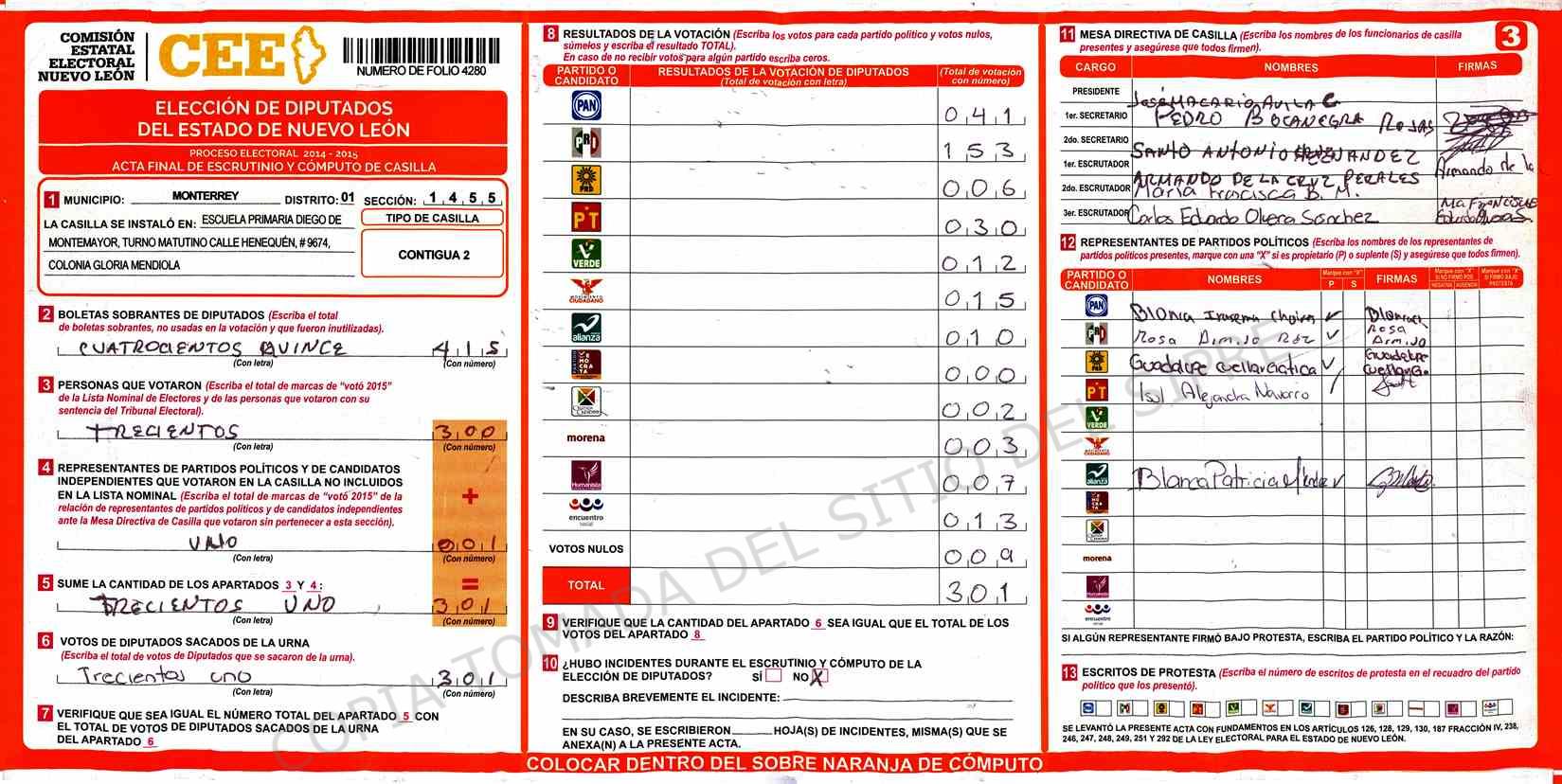 | Claves de Incidencia: | (1) Ilegible, (2) Mutilada, (3) Presenta Correcciones, (4) Presenta Borrones, (5) En Blanco, (6) Cifras Remarcadas, (7) Cifras de Mas, (8) Copiado Movido, (9) Con Signos Inválidos, (10) Excede Lista Nominal, (11) Otra |