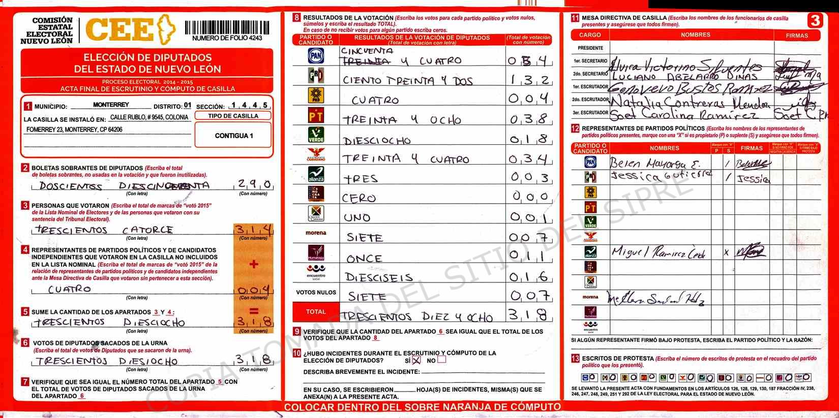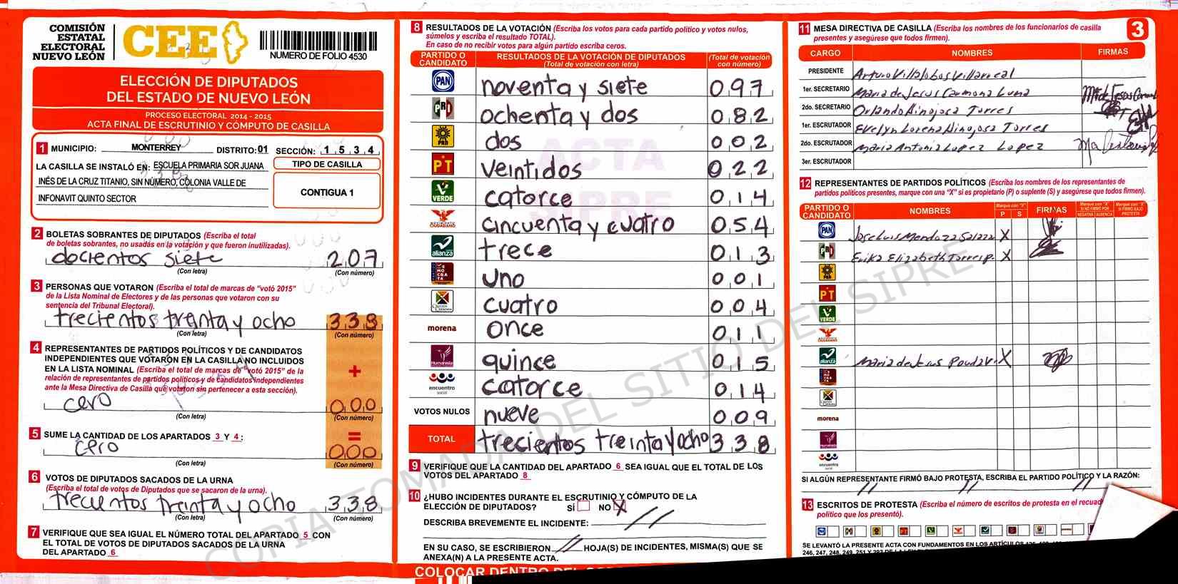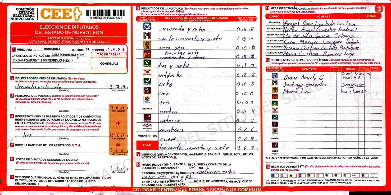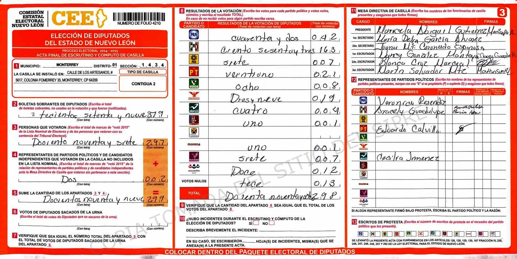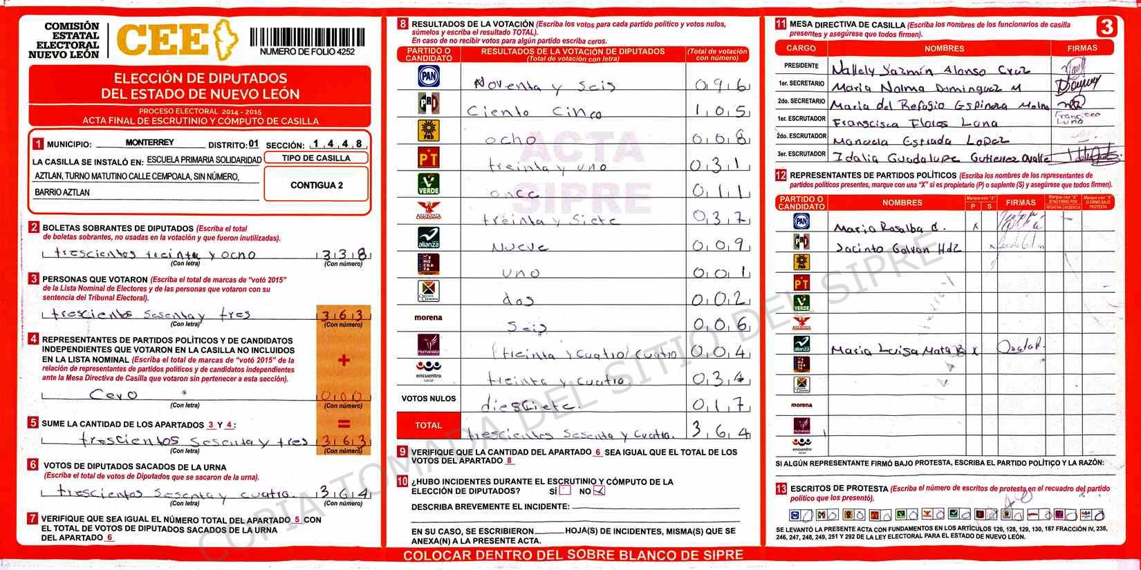 | Claves de Incidencia: | (1) Ilegible, (2) Mutilada, (3) Presenta Correcciones, (4) Presenta Borrones, (5) En Blanco, (6) Cifras Remarcadas, (7) Cifras de Mas, (8) Copiado Movido, (9) Con Signos Inválidos, (10) Excede Lista Nominal, (11) Otra |