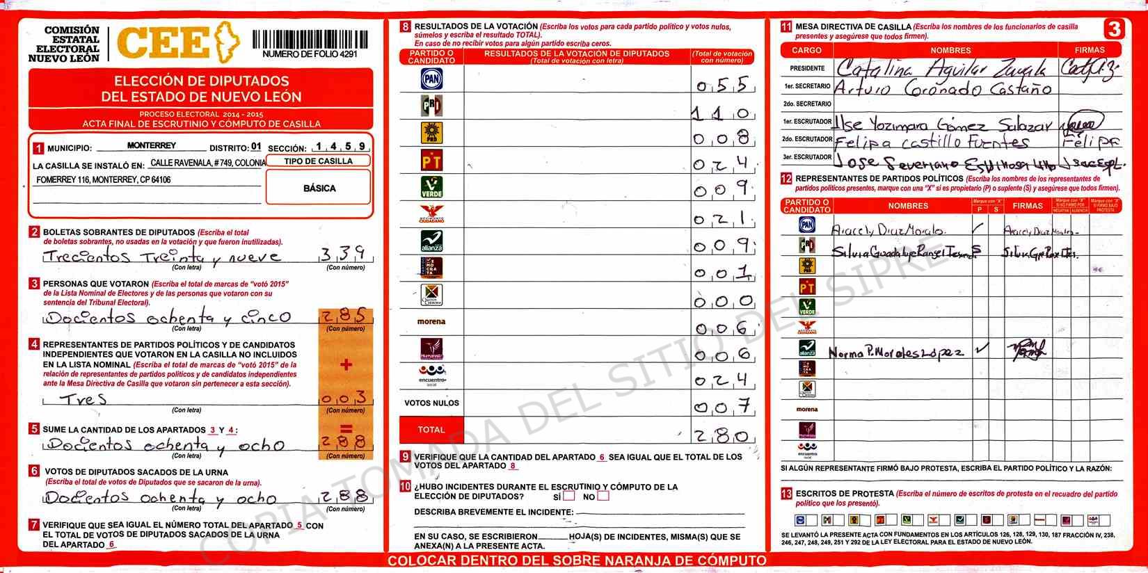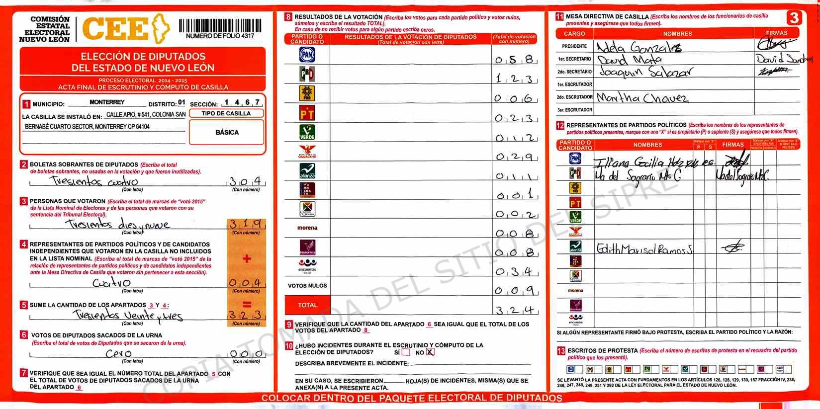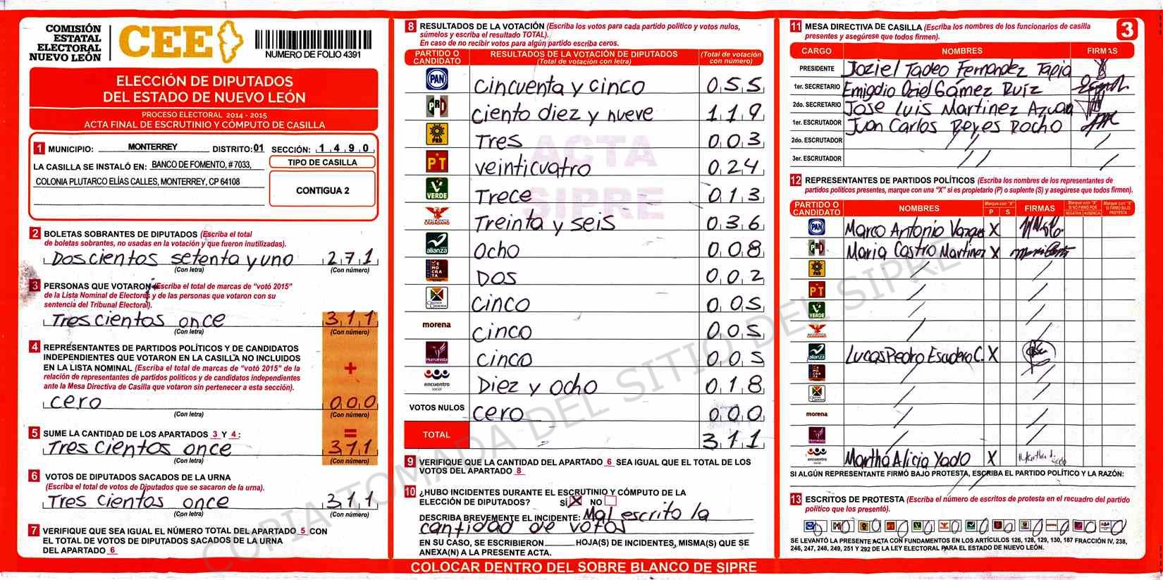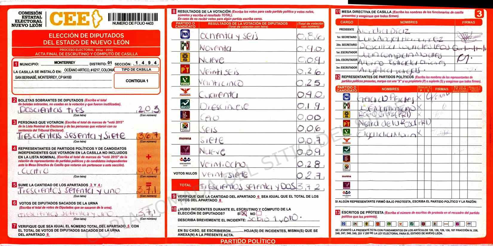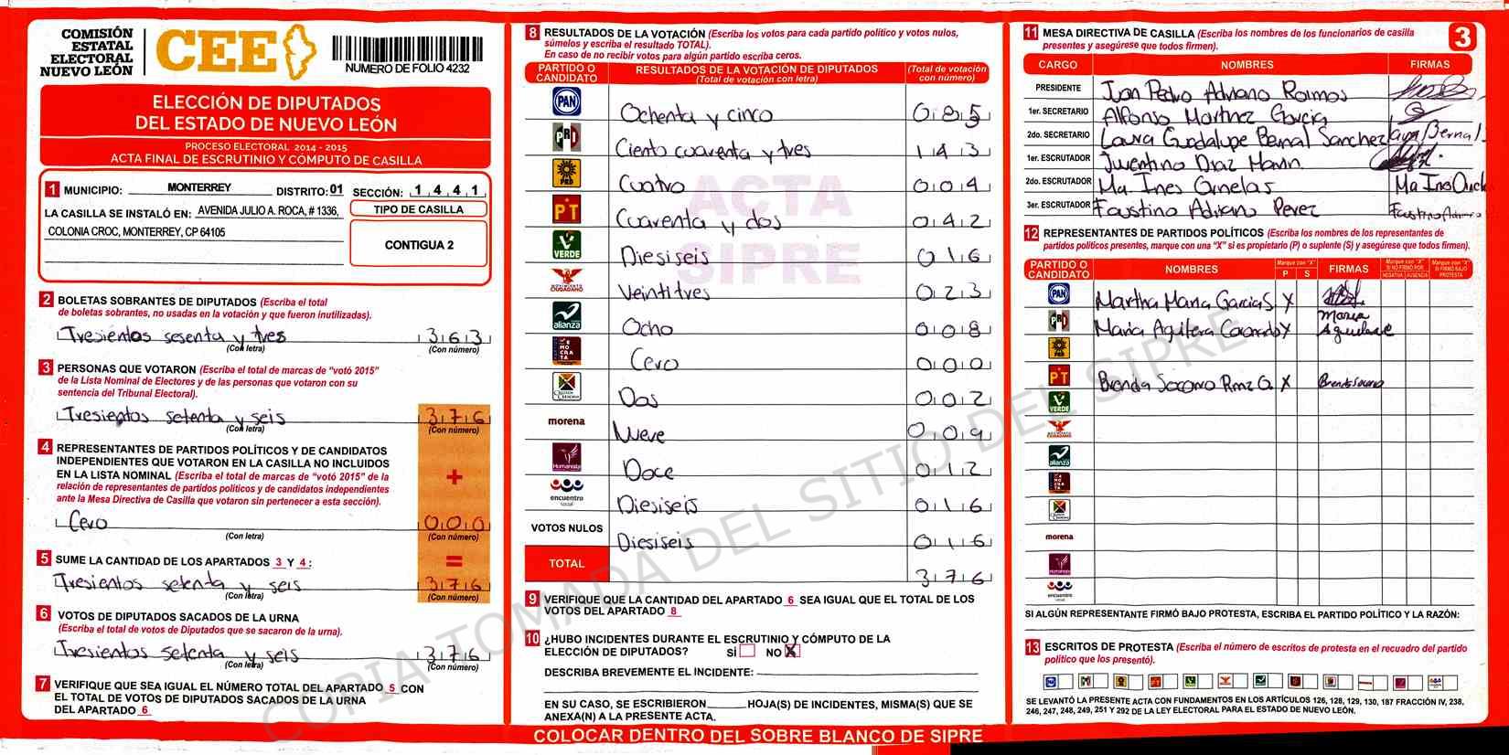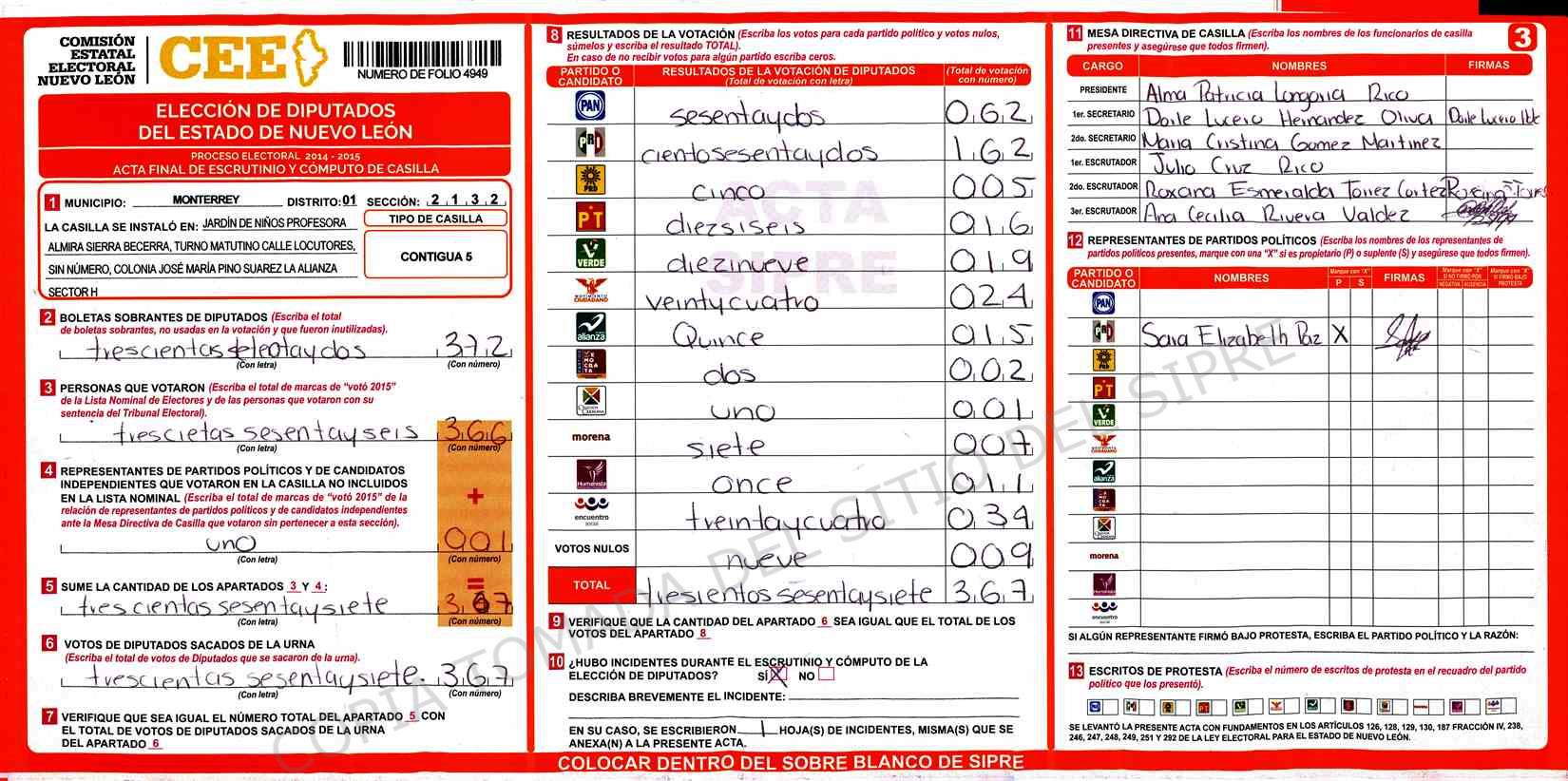 | Claves de Incidencia: | (1) Ilegible, (2) Mutilada, (3) Presenta Correcciones, (4) Presenta Borrones, (5) En Blanco, (6) Cifras Remarcadas, (7) Cifras de Mas, (8) Copiado Movido, (9) Con Signos Inválidos, (10) Excede Lista Nominal, (11) Otra |