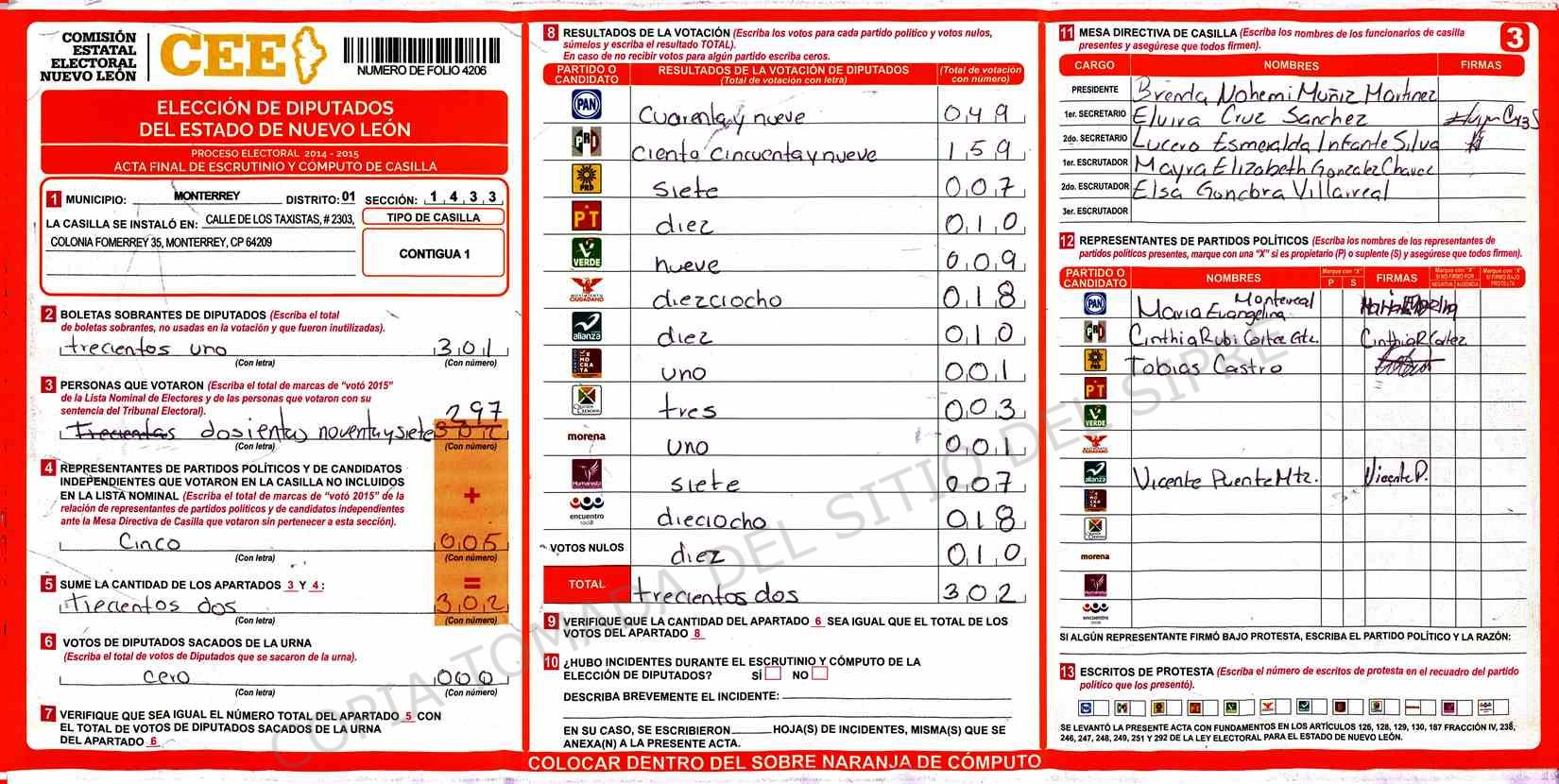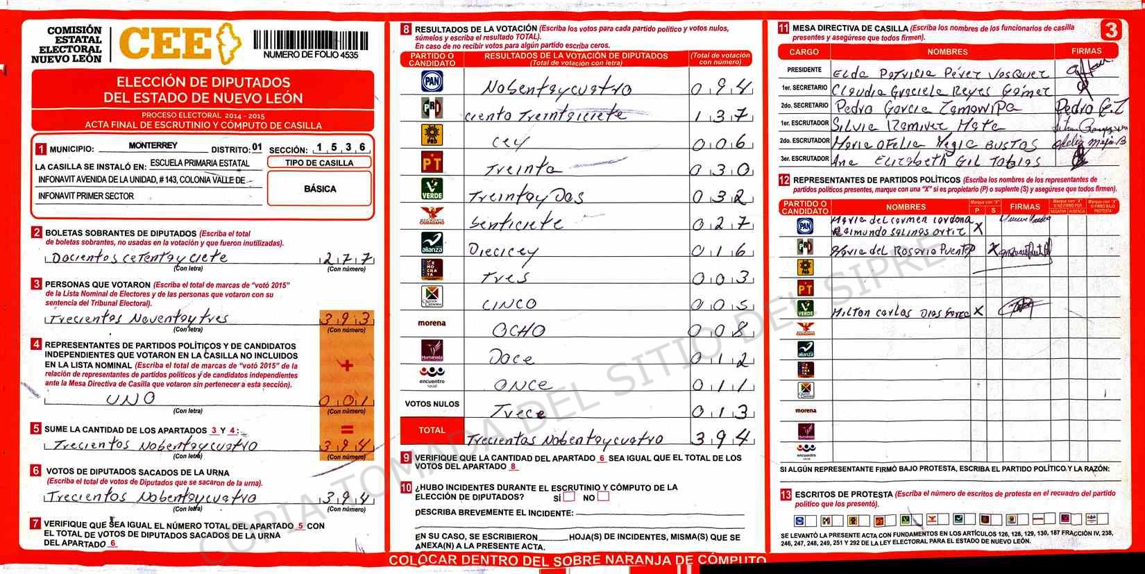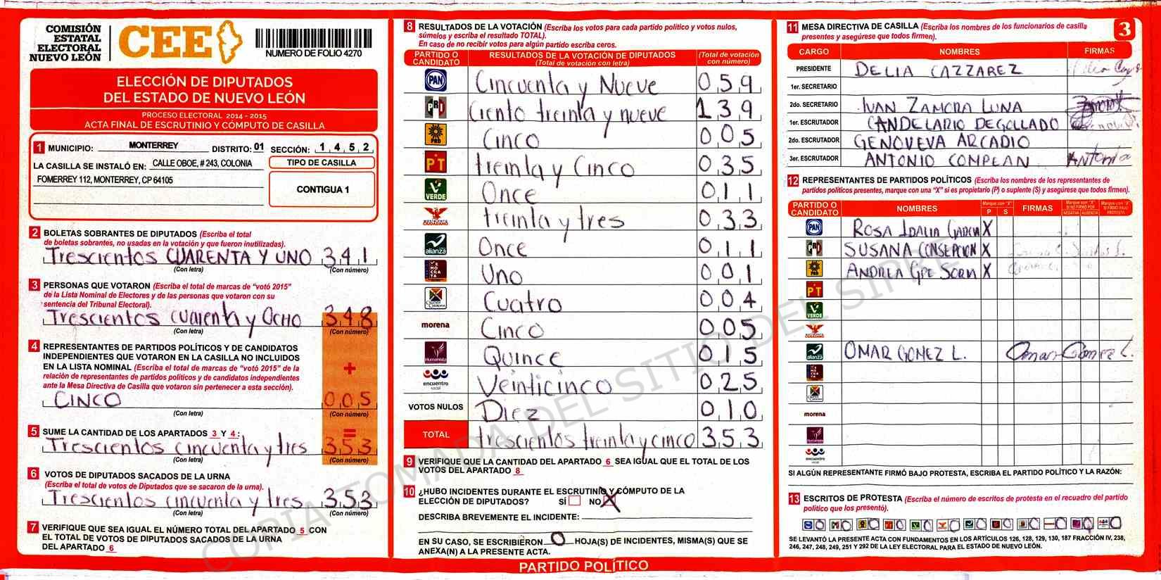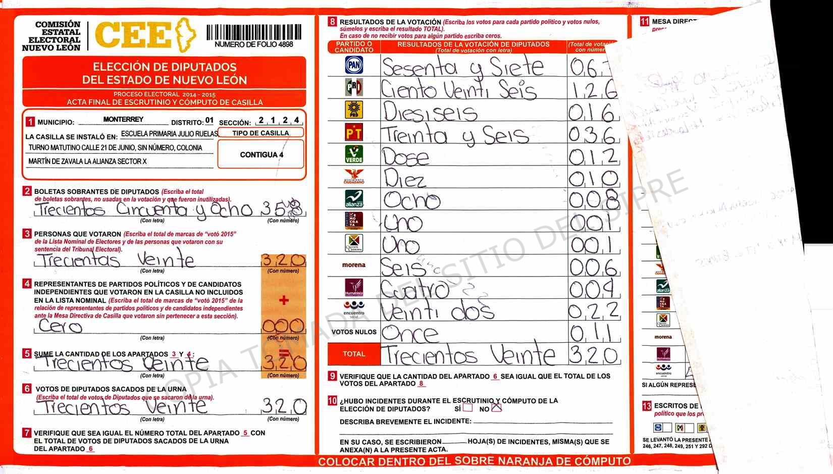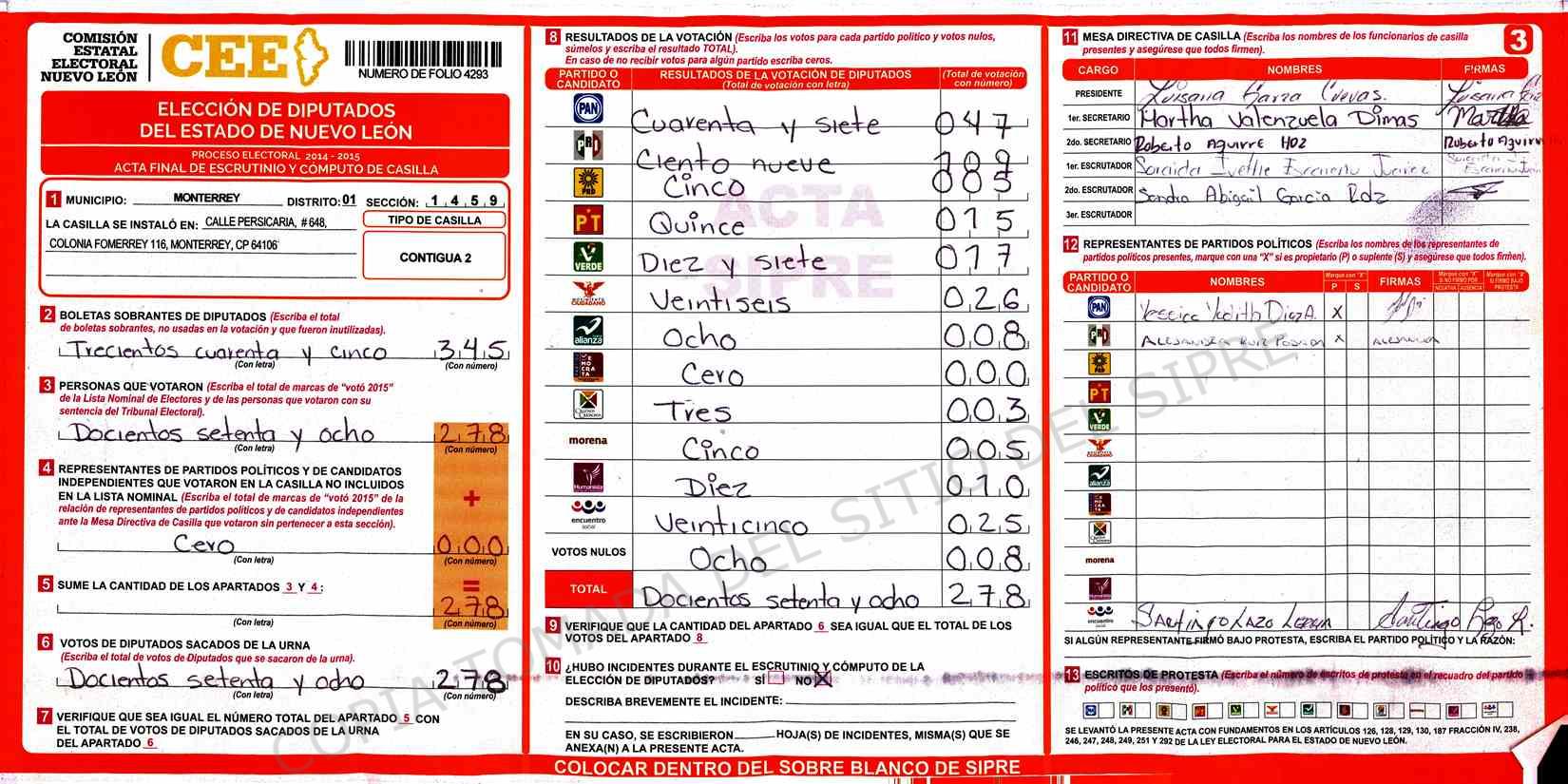 | Claves de Incidencia: | (1) Ilegible, (2) Mutilada, (3) Presenta Correcciones, (4) Presenta Borrones, (5) En Blanco, (6) Cifras Remarcadas, (7) Cifras de Mas, (8) Copiado Movido, (9) Con Signos Inválidos, (10) Excede Lista Nominal, (11) Otra |