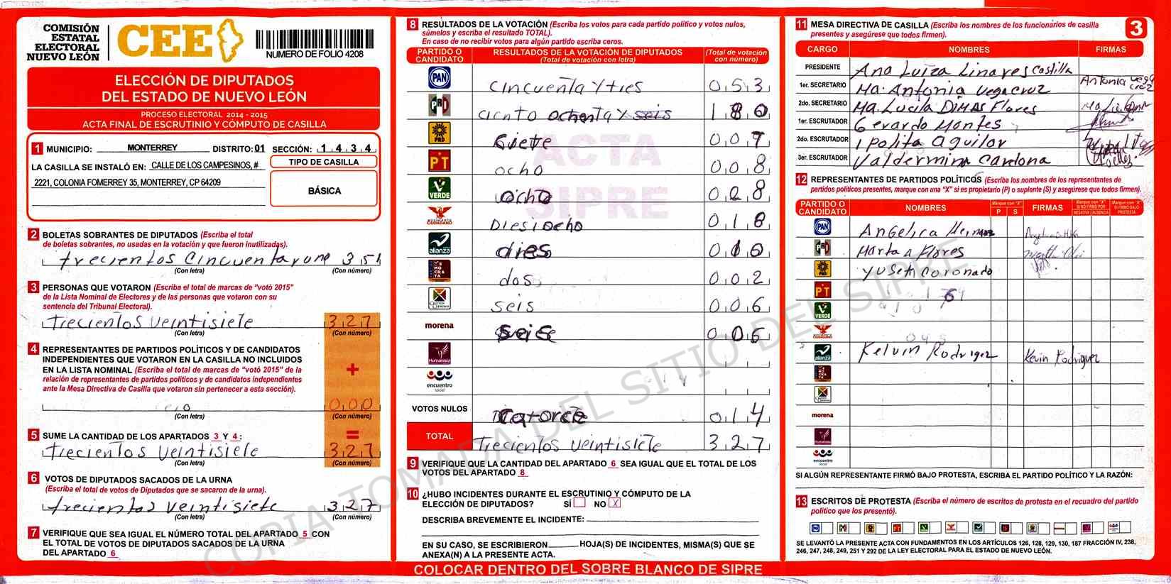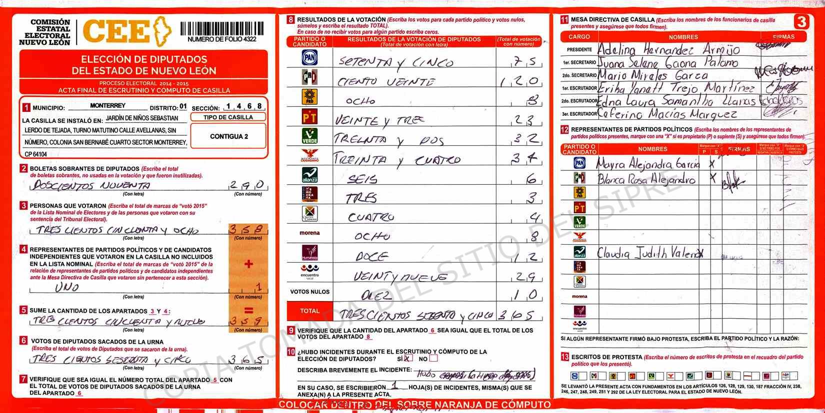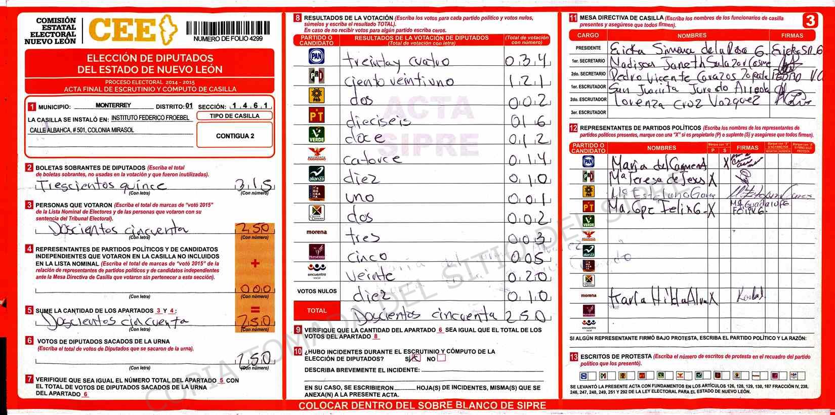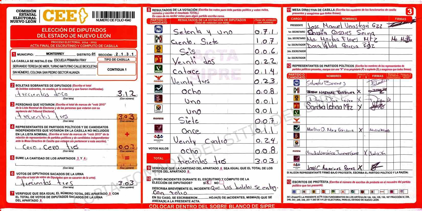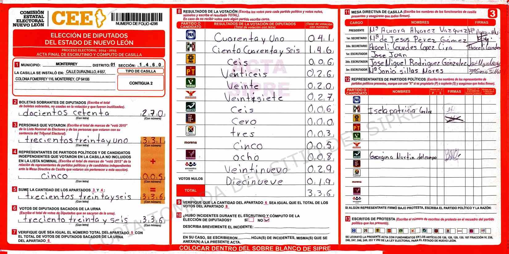 | Claves de Incidencia: | (1) Ilegible, (2) Mutilada, (3) Presenta Correcciones, (4) Presenta Borrones, (5) En Blanco, (6) Cifras Remarcadas, (7) Cifras de Mas, (8) Copiado Movido, (9) Con Signos Inválidos, (10) Excede Lista Nominal, (11) Otra |