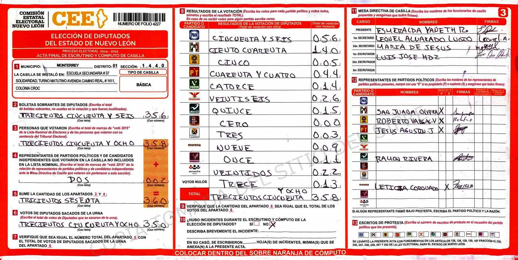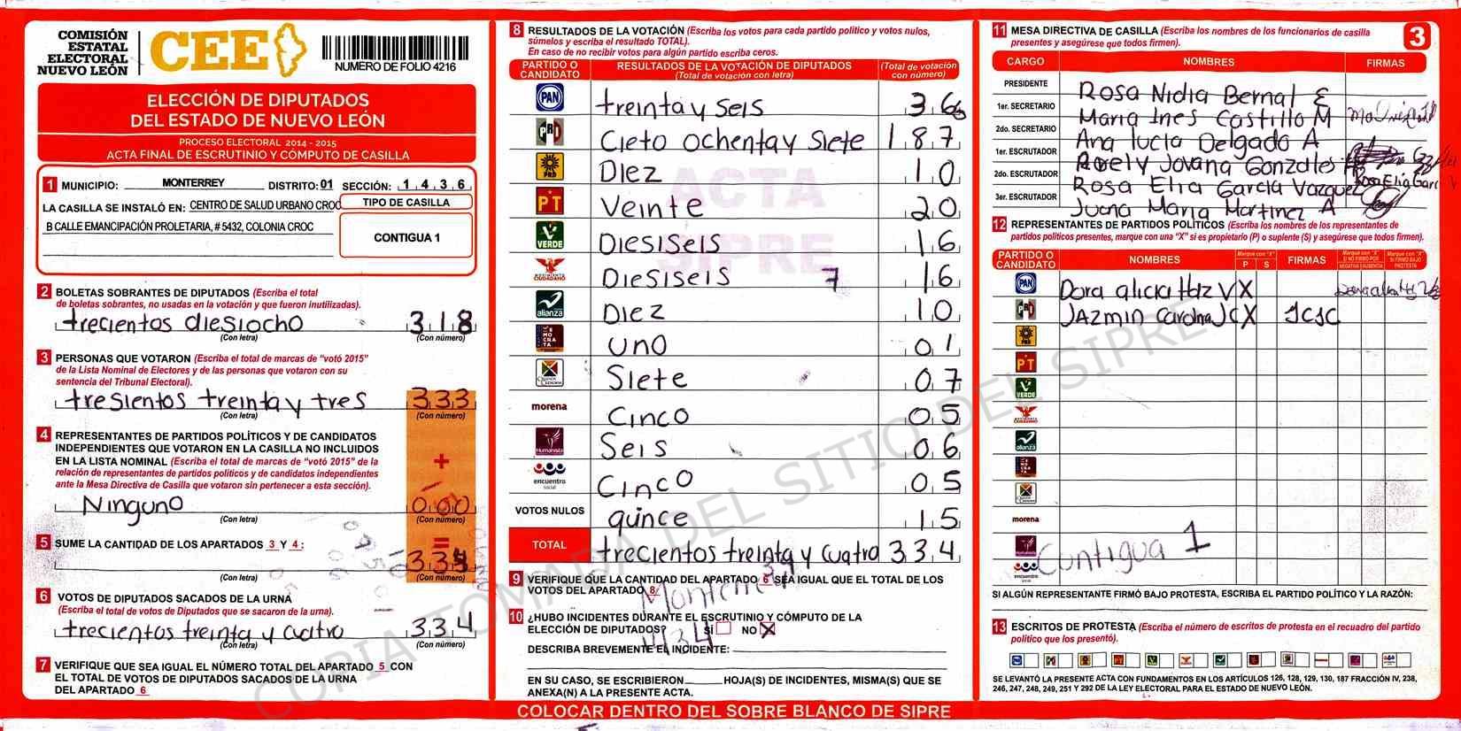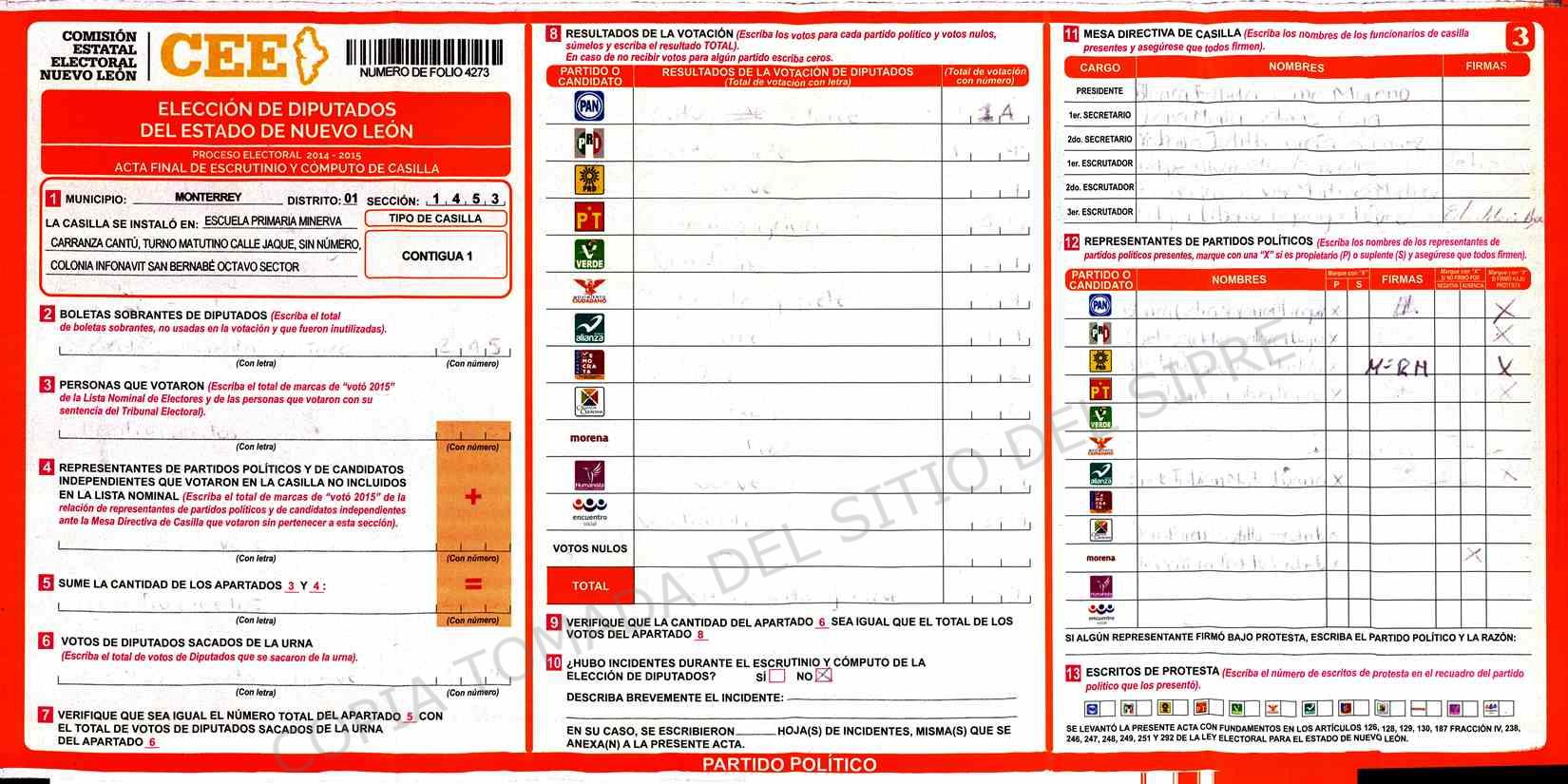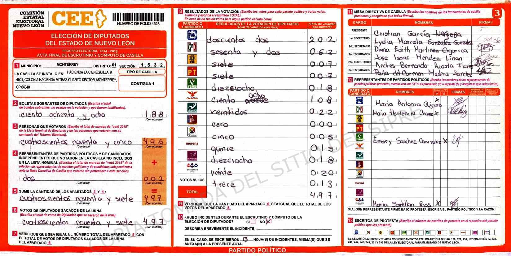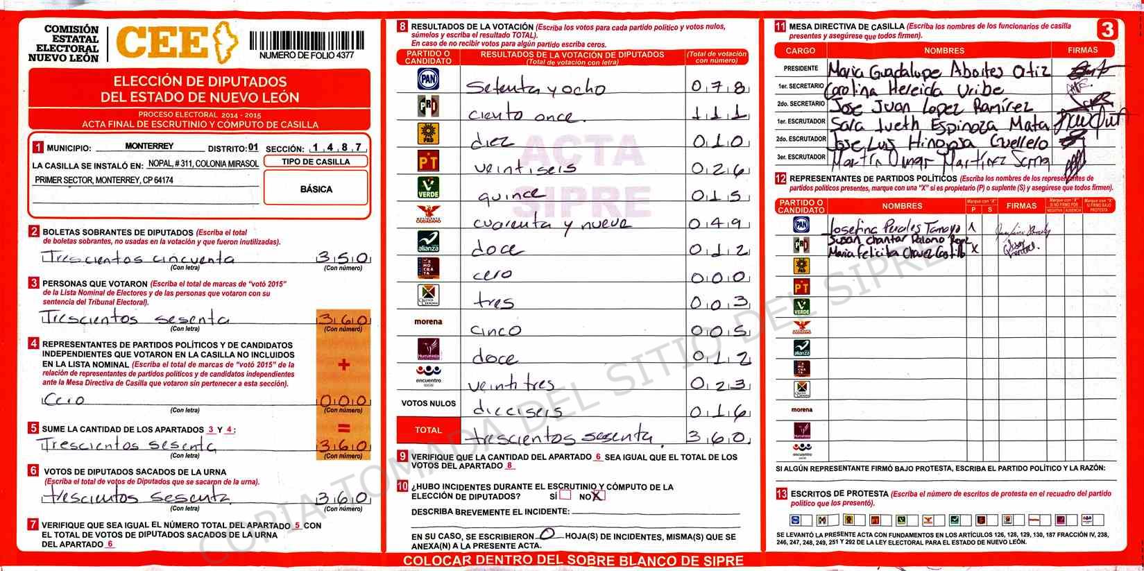 | Claves de Incidencia: | (1) Ilegible, (2) Mutilada, (3) Presenta Correcciones, (4) Presenta Borrones, (5) En Blanco, (6) Cifras Remarcadas, (7) Cifras de Mas, (8) Copiado Movido, (9) Con Signos Inválidos, (10) Excede Lista Nominal, (11) Otra |