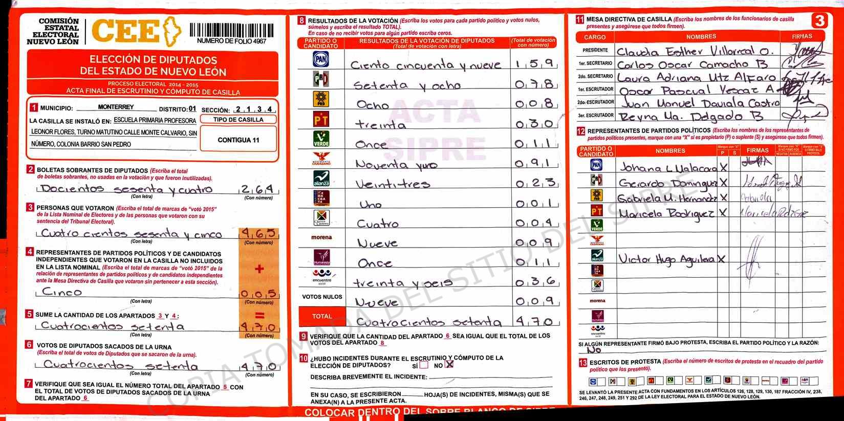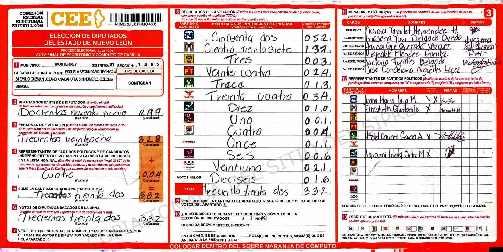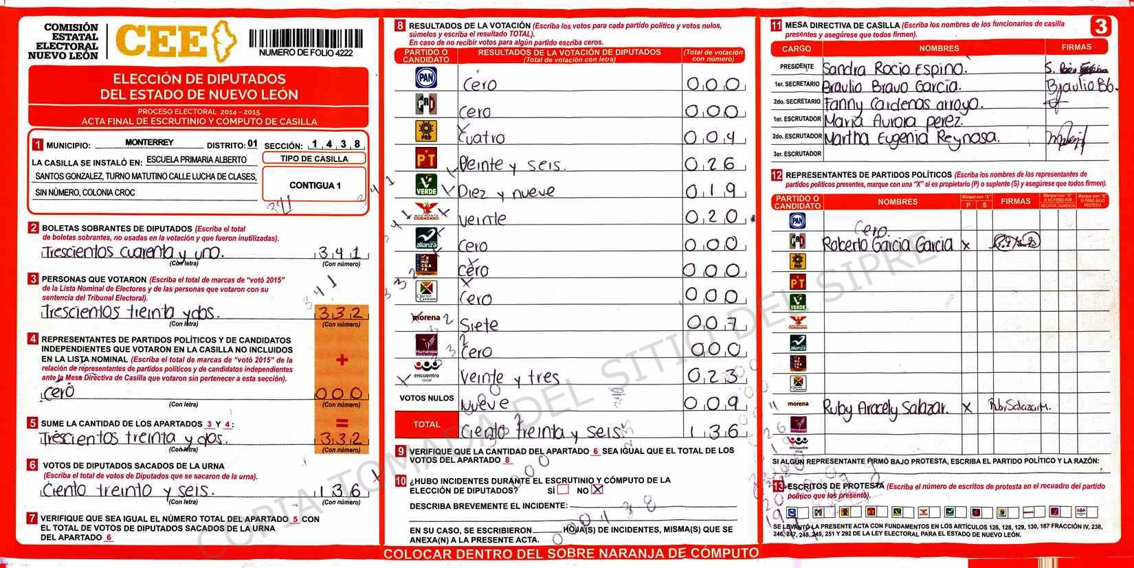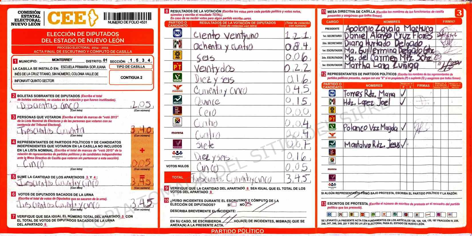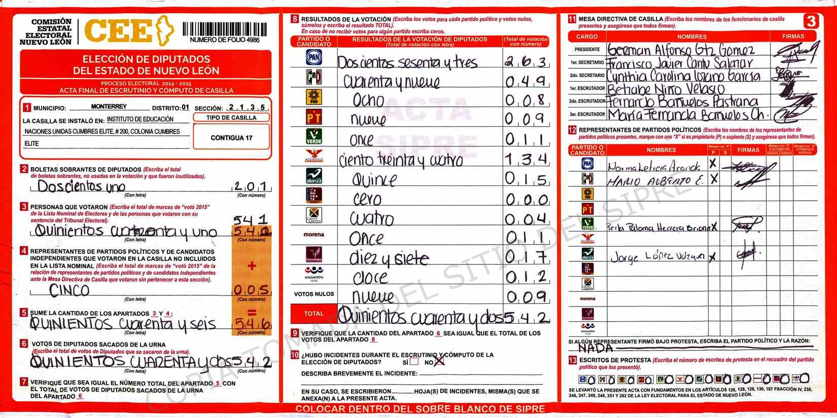 | Claves de Incidencia: | (1) Ilegible, (2) Mutilada, (3) Presenta Correcciones, (4) Presenta Borrones, (5) En Blanco, (6) Cifras Remarcadas, (7) Cifras de Mas, (8) Copiado Movido, (9) Con Signos Inválidos, (10) Excede Lista Nominal, (11) Otra |