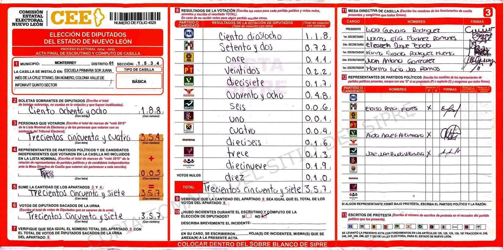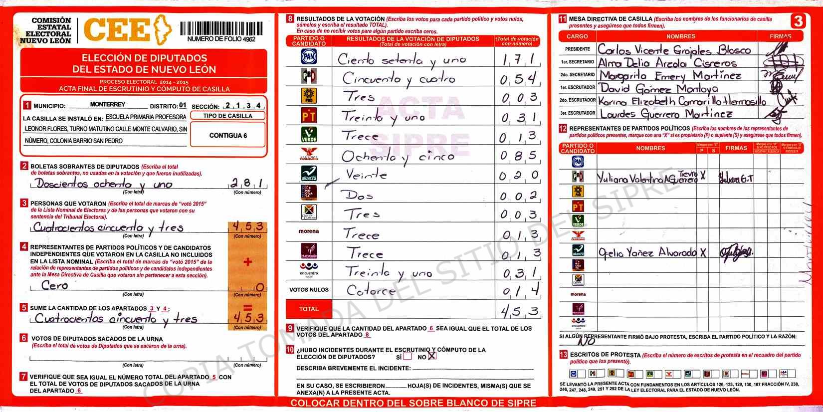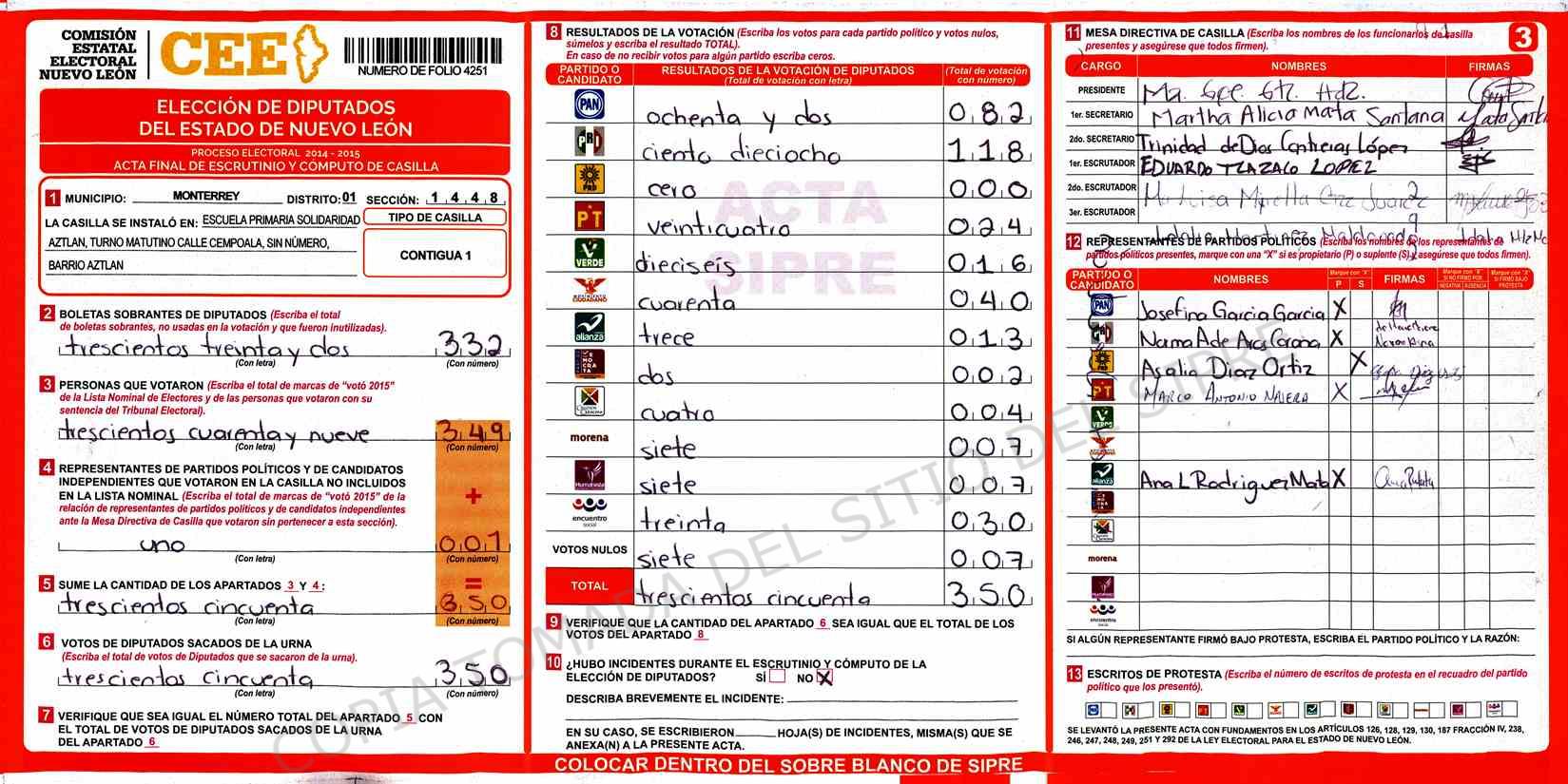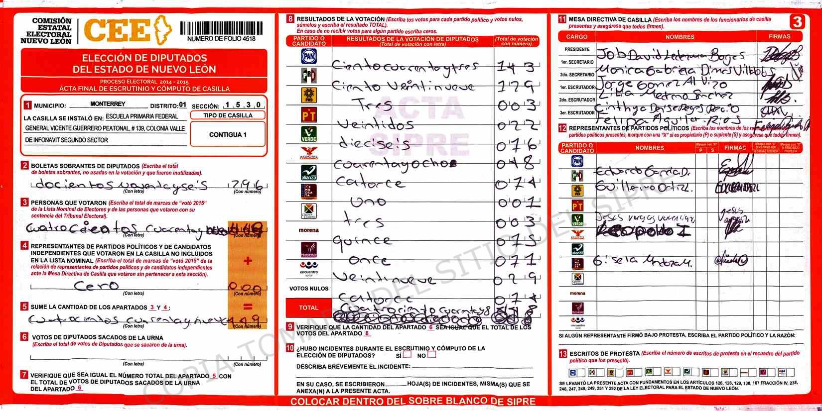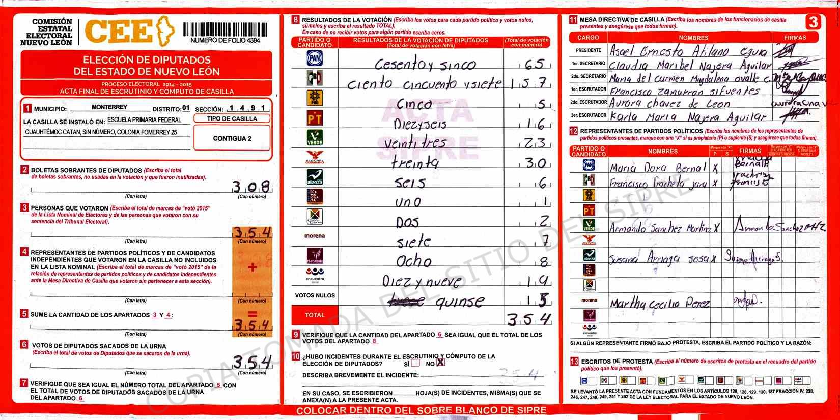 | Claves de Incidencia: | (1) Ilegible, (2) Mutilada, (3) Presenta Correcciones, (4) Presenta Borrones, (5) En Blanco, (6) Cifras Remarcadas, (7) Cifras de Mas, (8) Copiado Movido, (9) Con Signos Inválidos, (10) Excede Lista Nominal, (11) Otra |