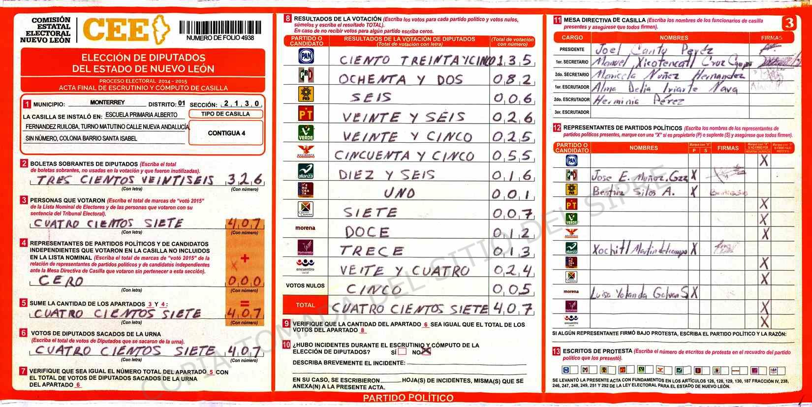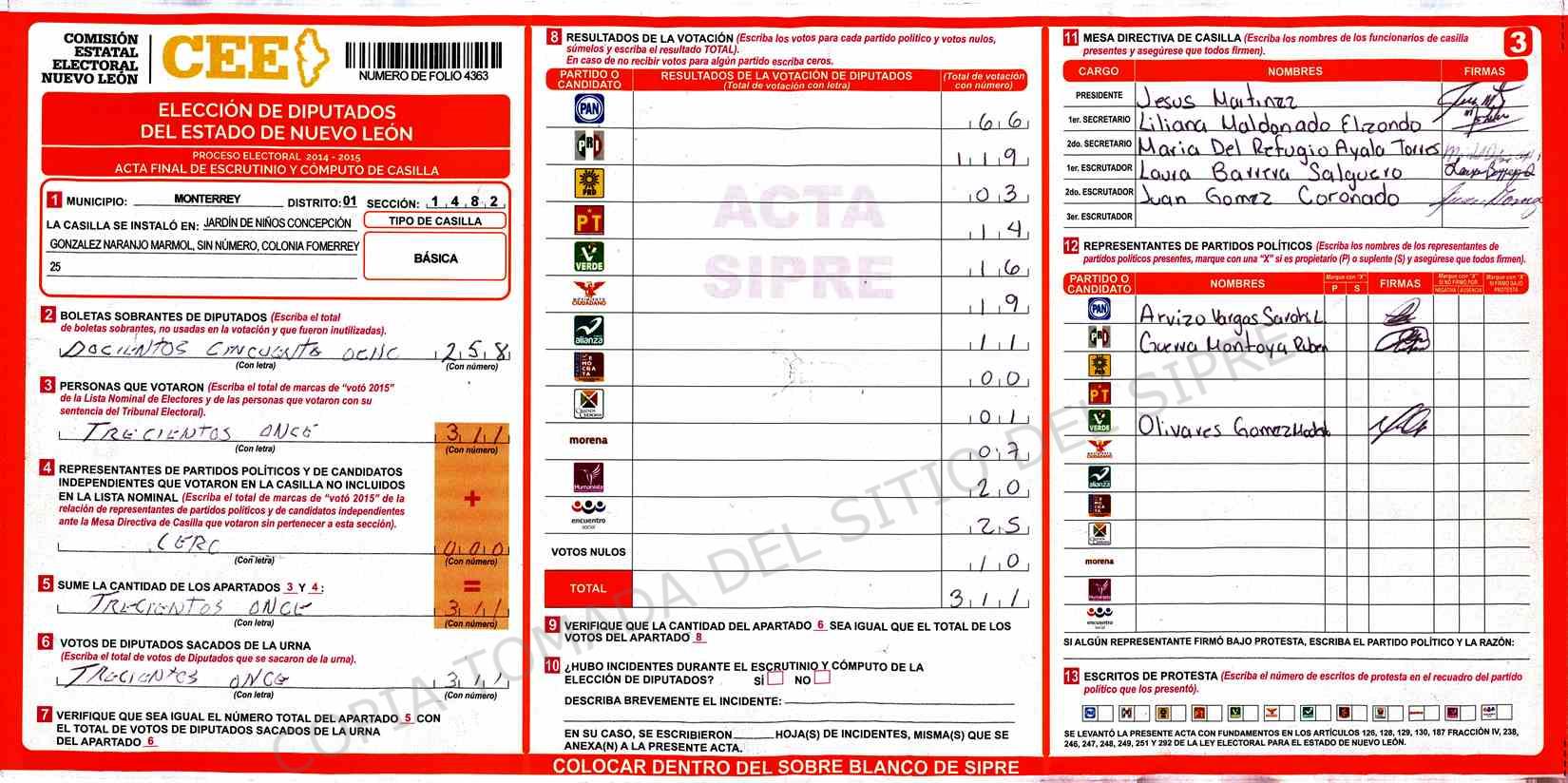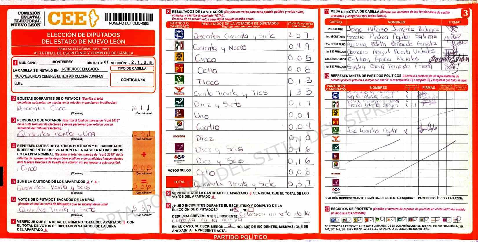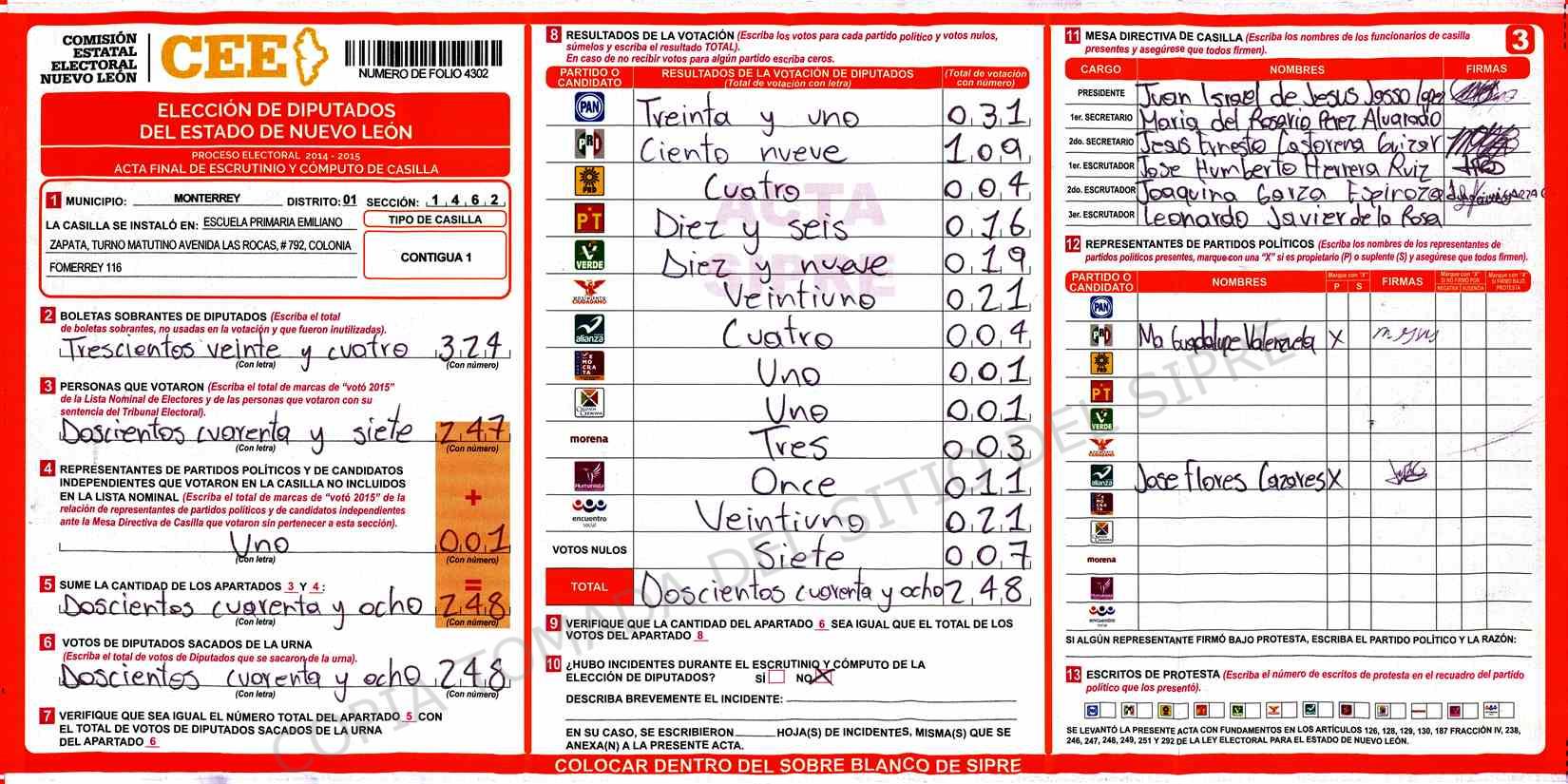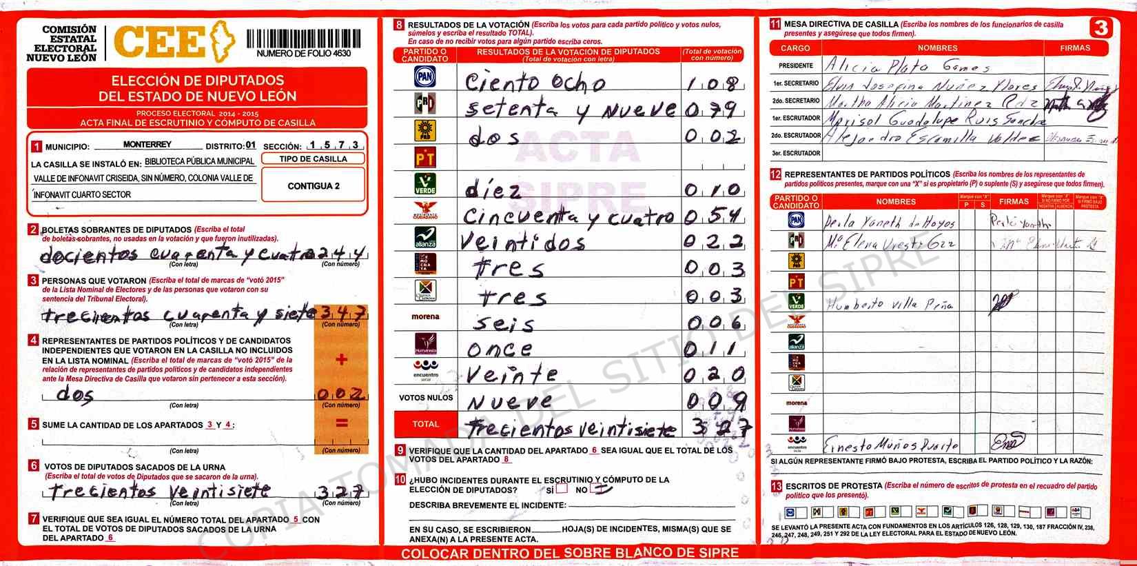 | Claves de Incidencia: | (1) Ilegible, (2) Mutilada, (3) Presenta Correcciones, (4) Presenta Borrones, (5) En Blanco, (6) Cifras Remarcadas, (7) Cifras de Mas, (8) Copiado Movido, (9) Con Signos Inválidos, (10) Excede Lista Nominal, (11) Otra |